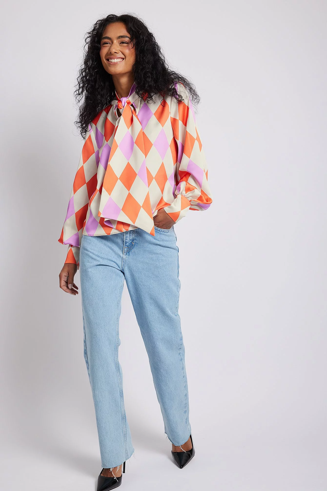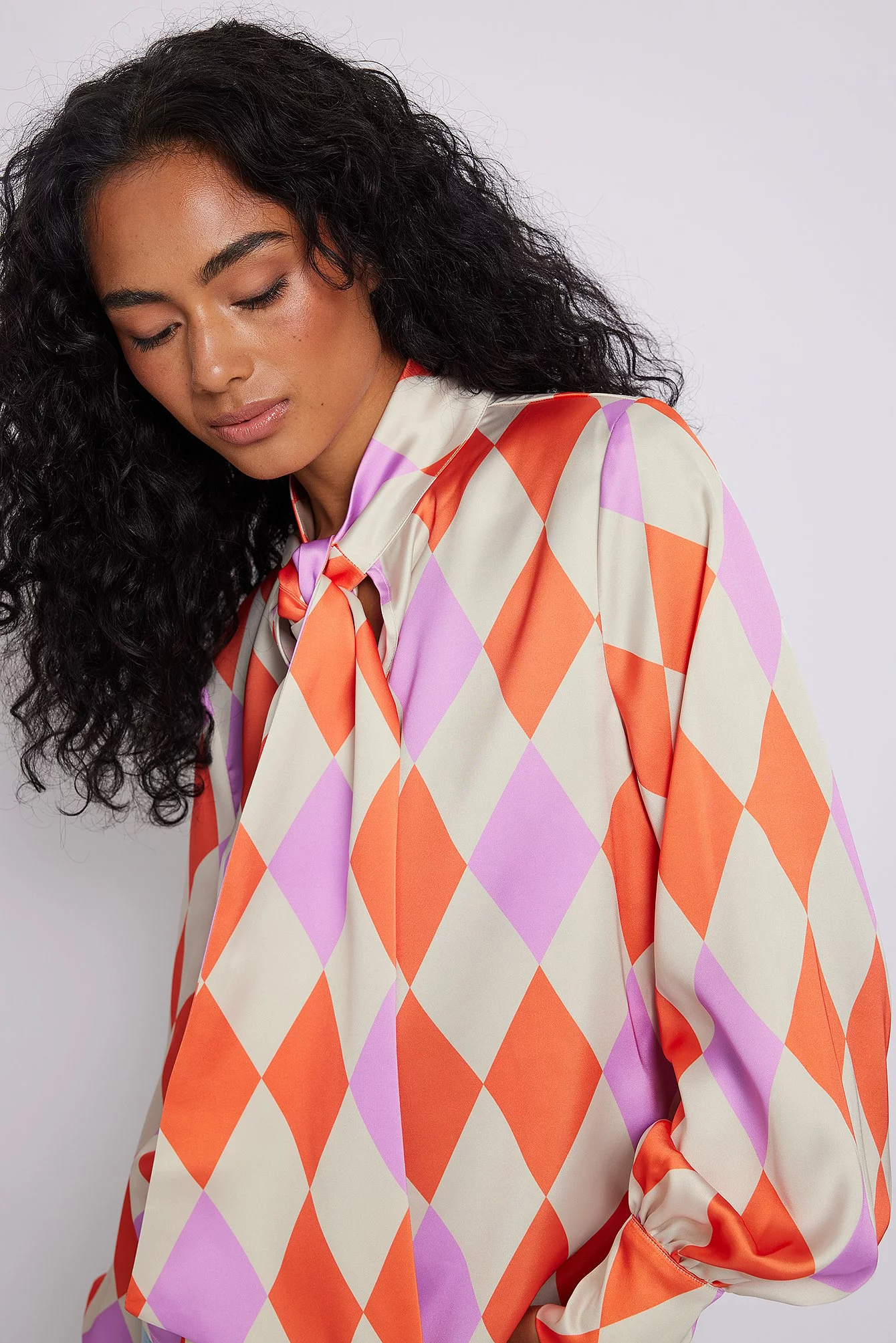 This blouse features a v neckline with self-tie bands, long sleeves with a triple button cuff and satin material.