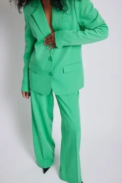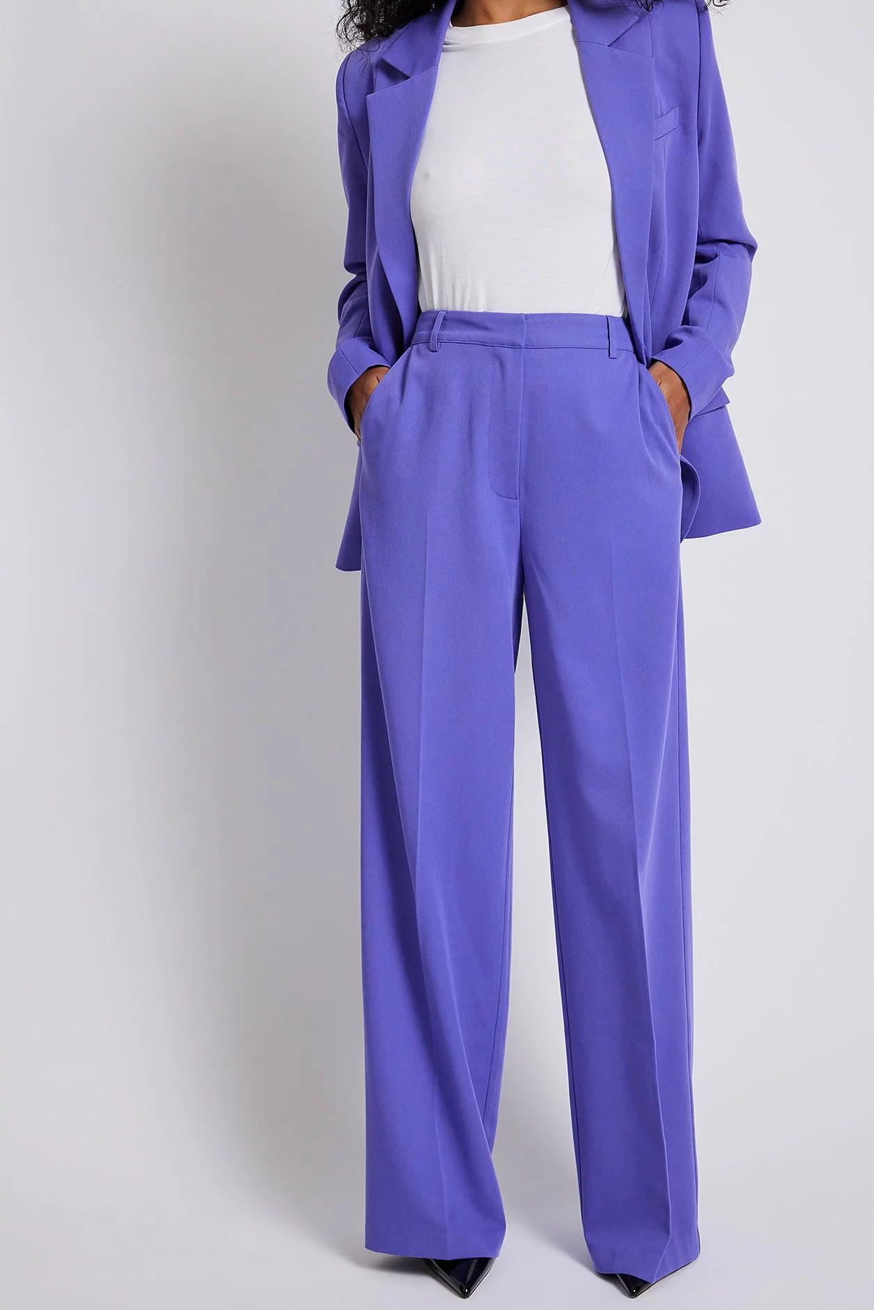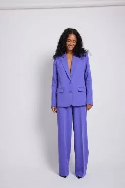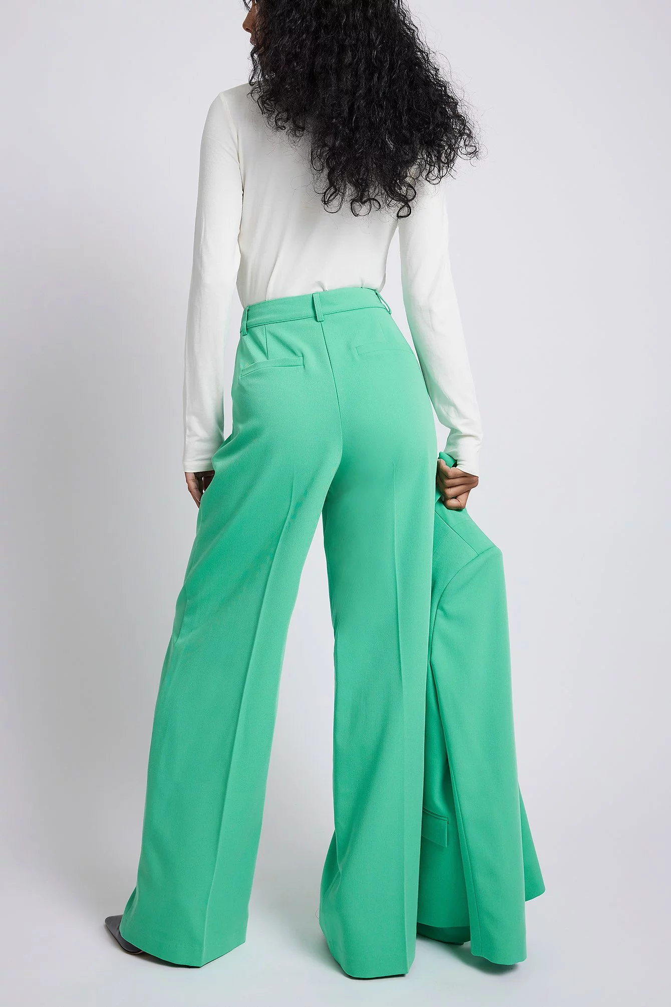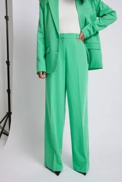 These trousers feature a high waist, a zipper, hook and button closure, two side pockets, two mock pockets on the back and a wide leg.