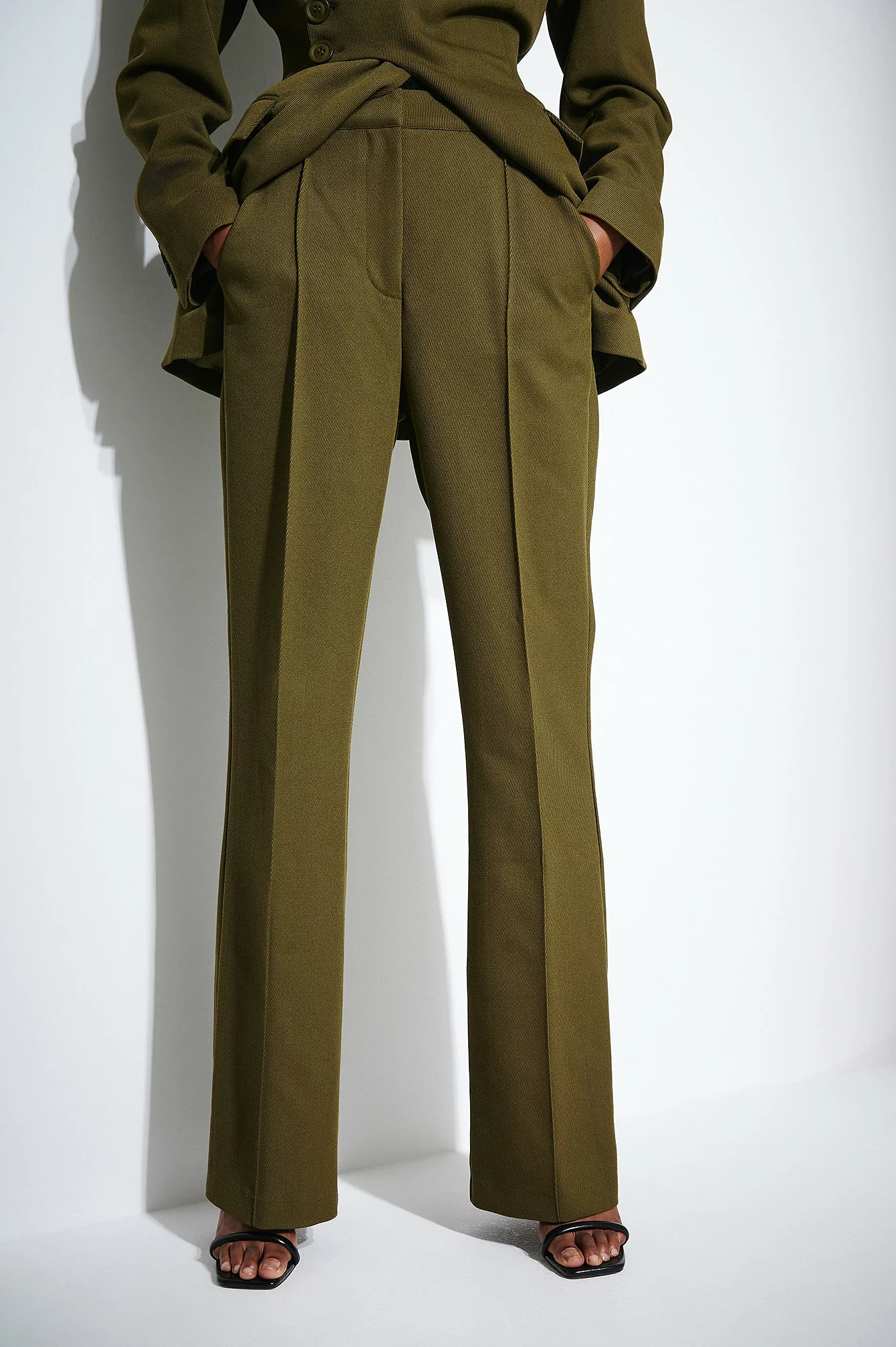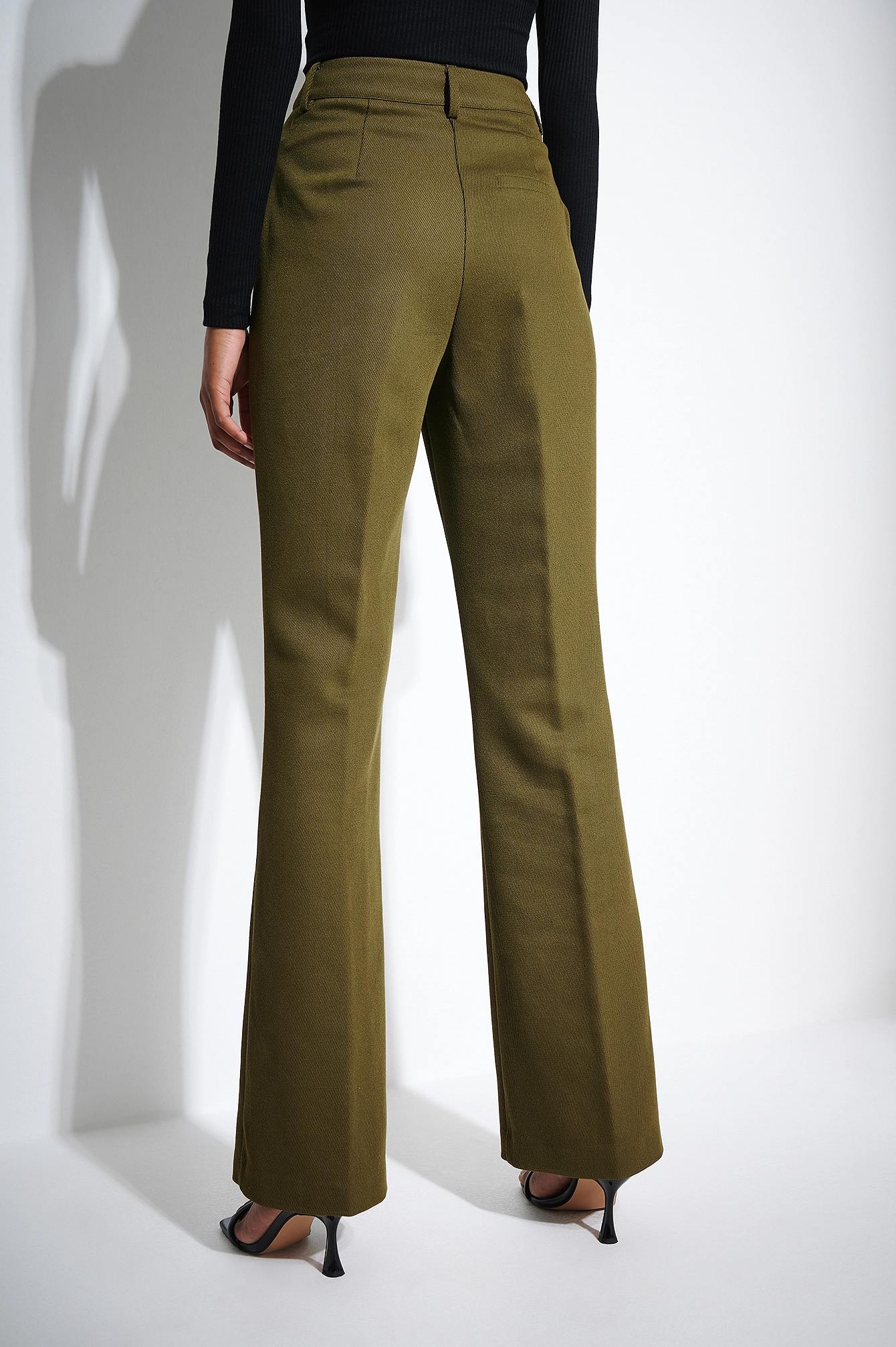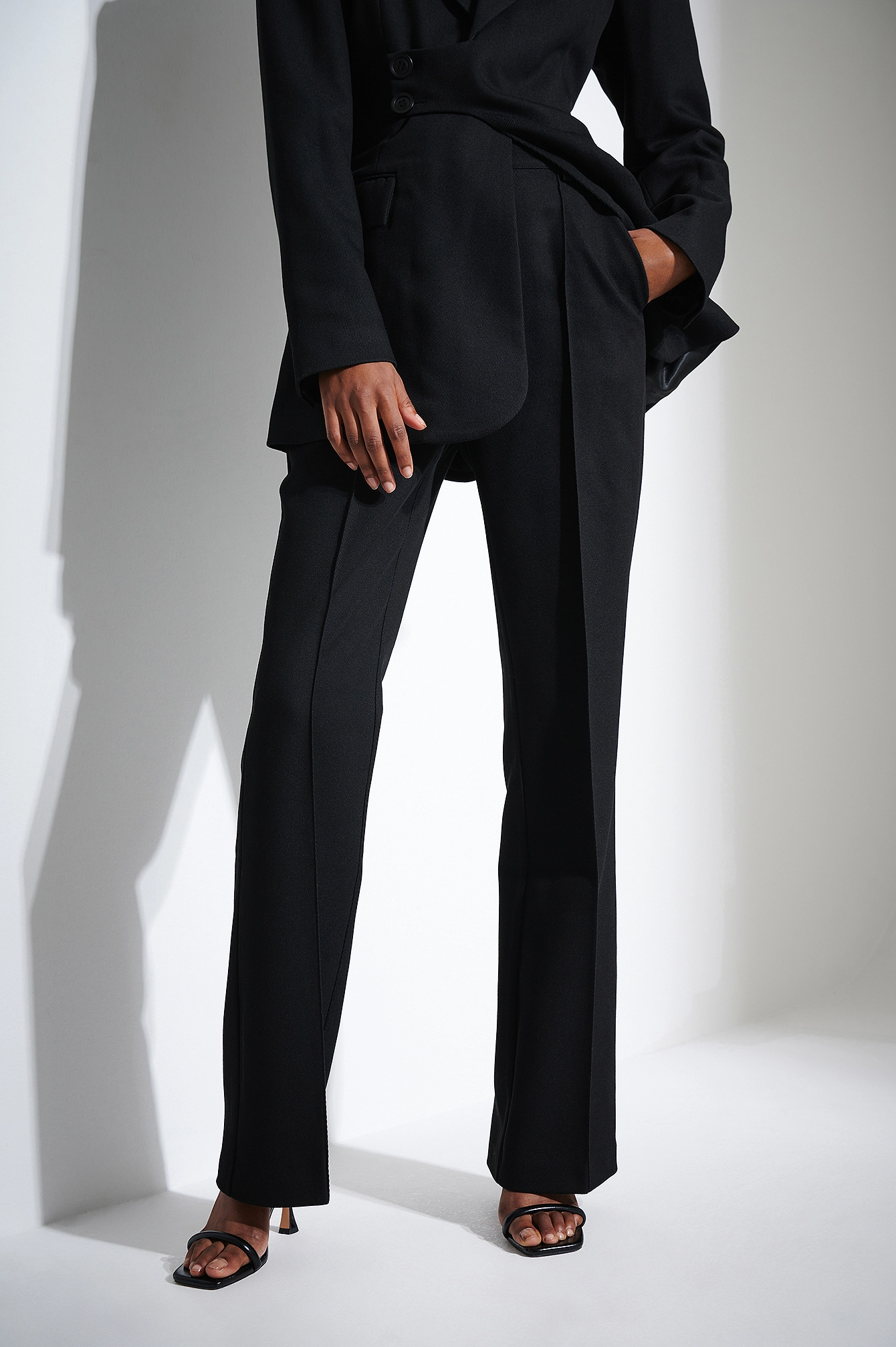 These pants feature seam details, a straight leg, a zipper and hook closure, side pockets and a back mock pocket.