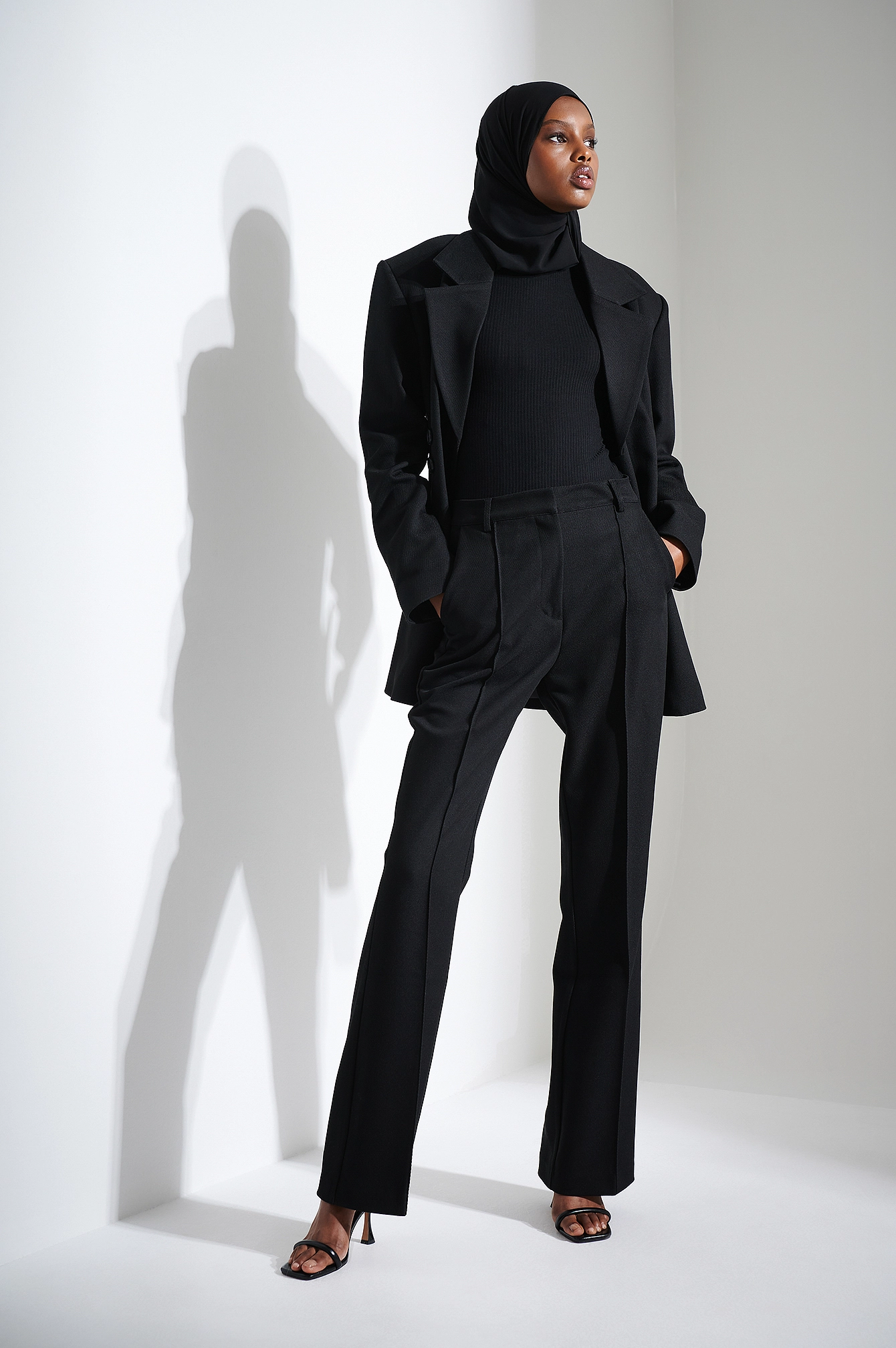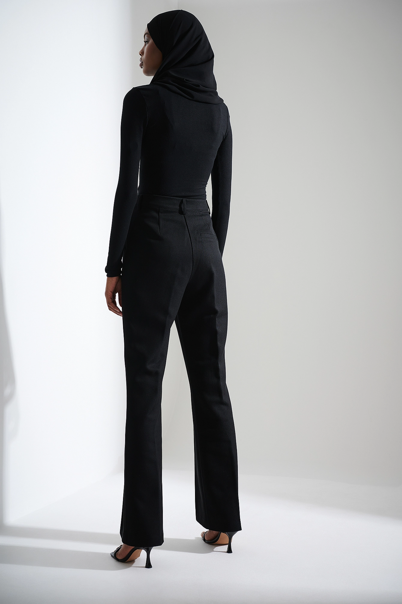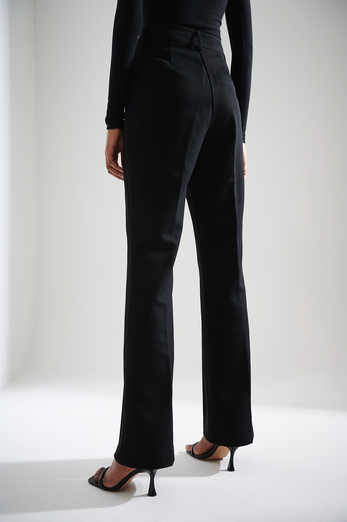 These pants feature seam details, a straight leg, a zipper and hook closure, side pockets and a back mock pocket.