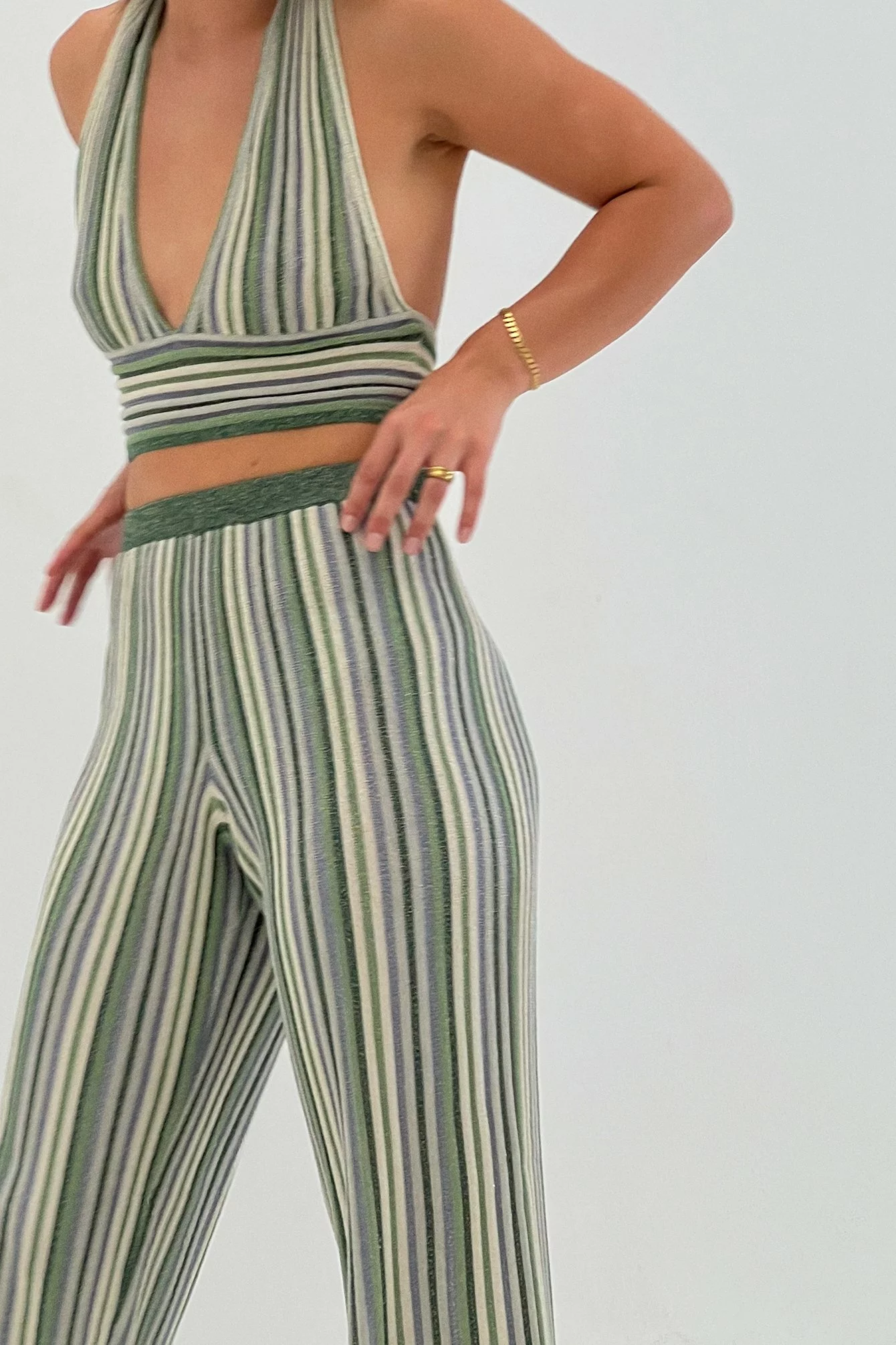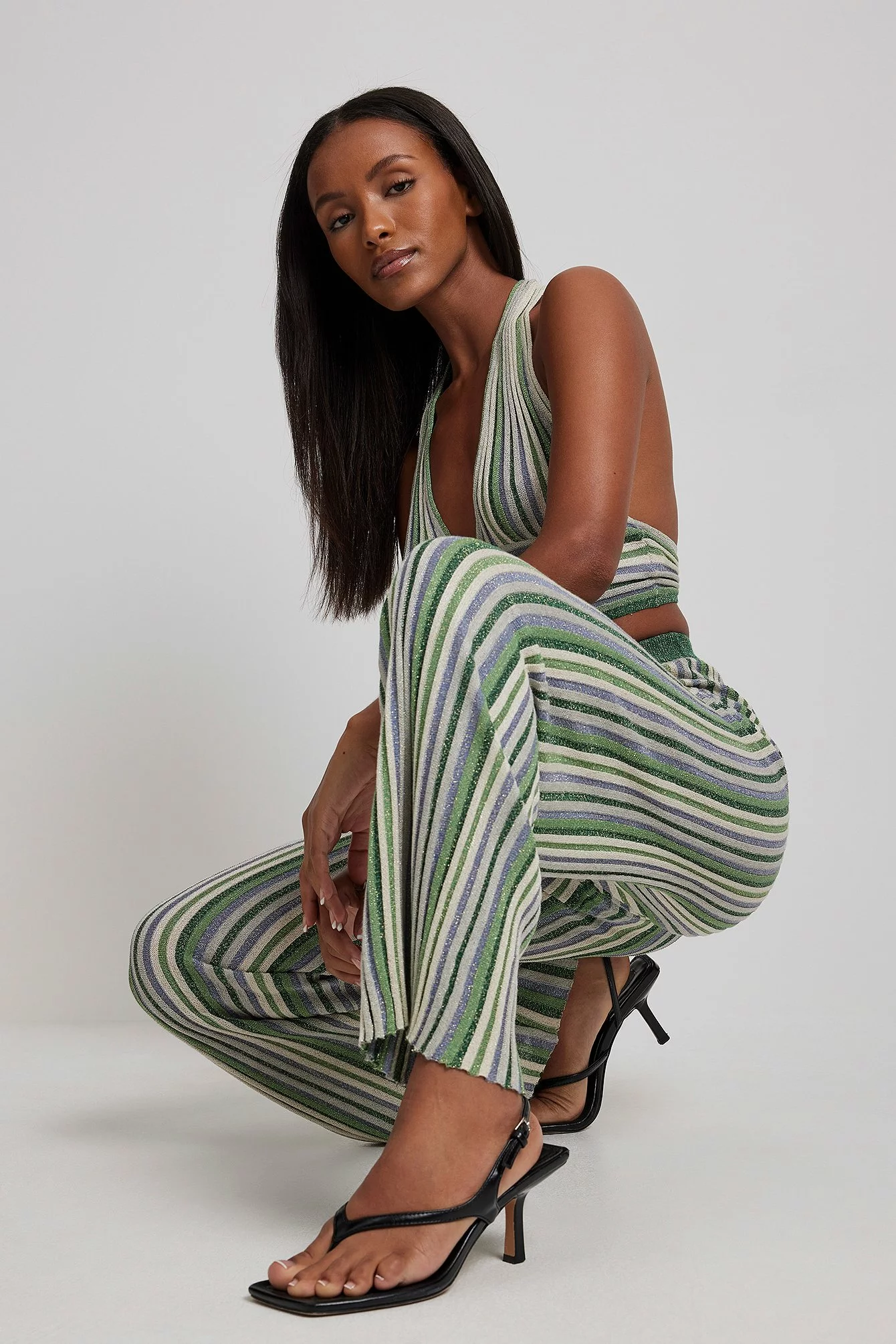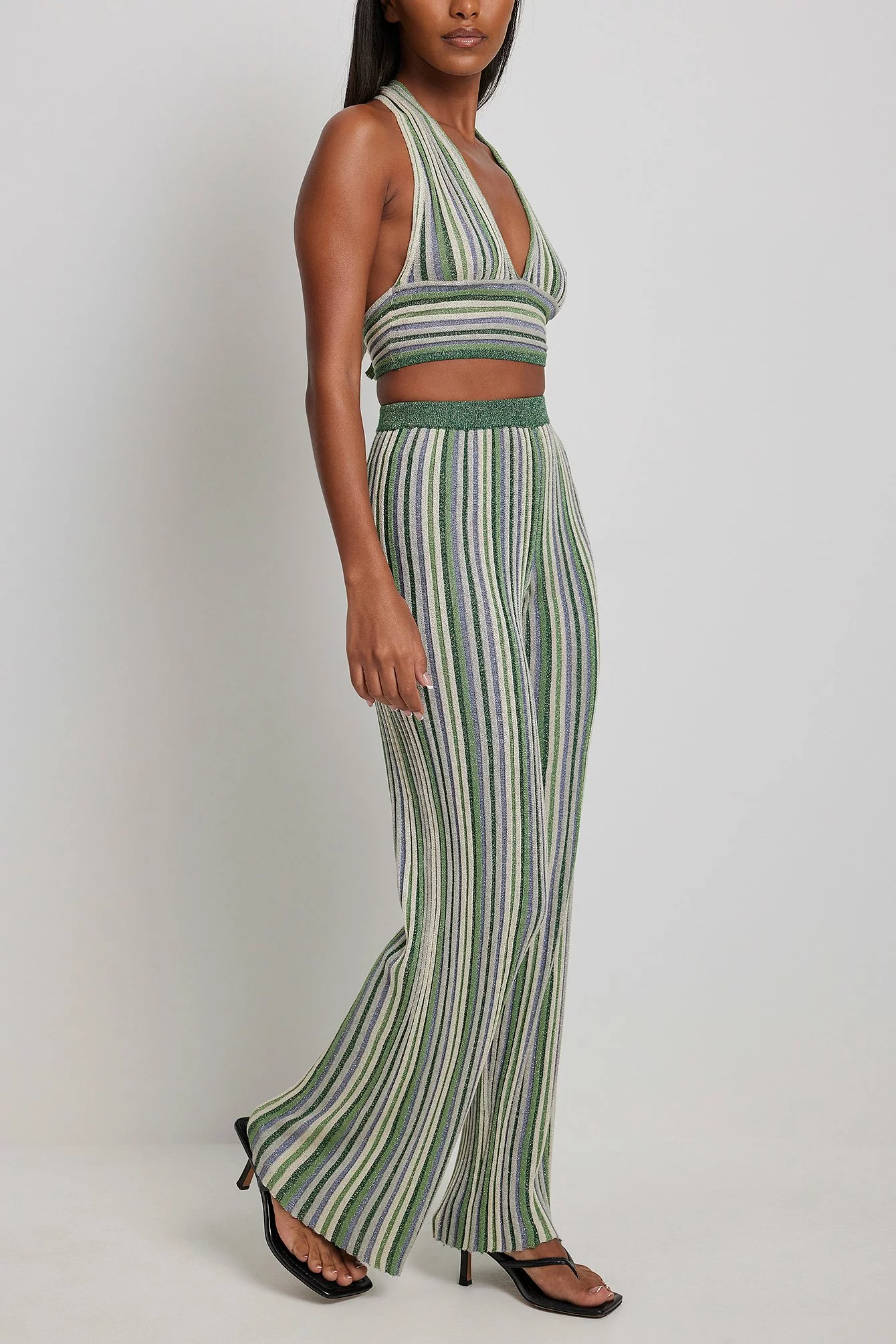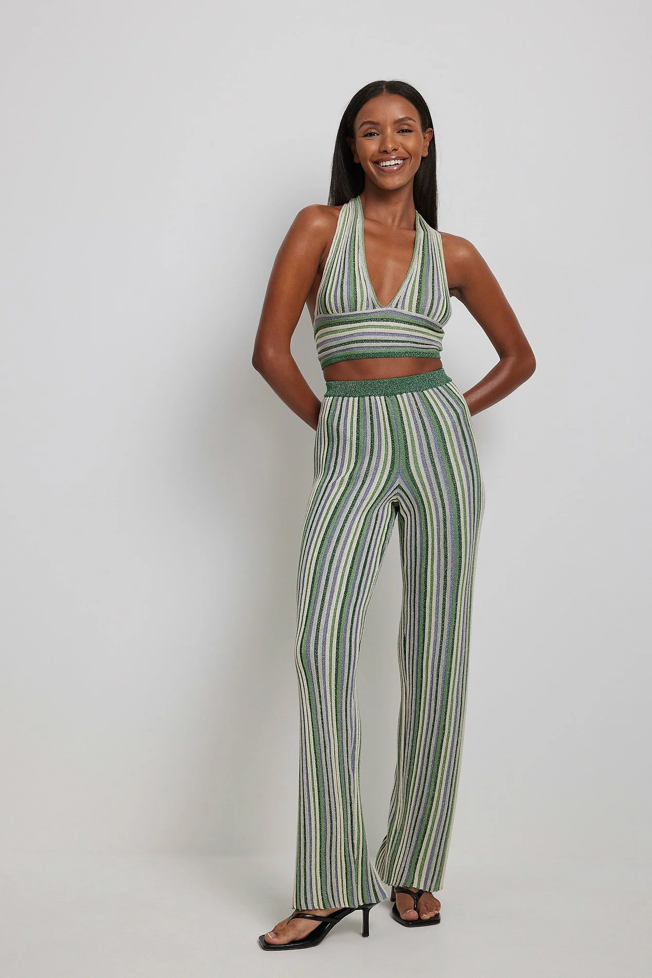 These trousers are knitted and sparkling and feature an elasticized waist, a high waist fit and a straight leg.