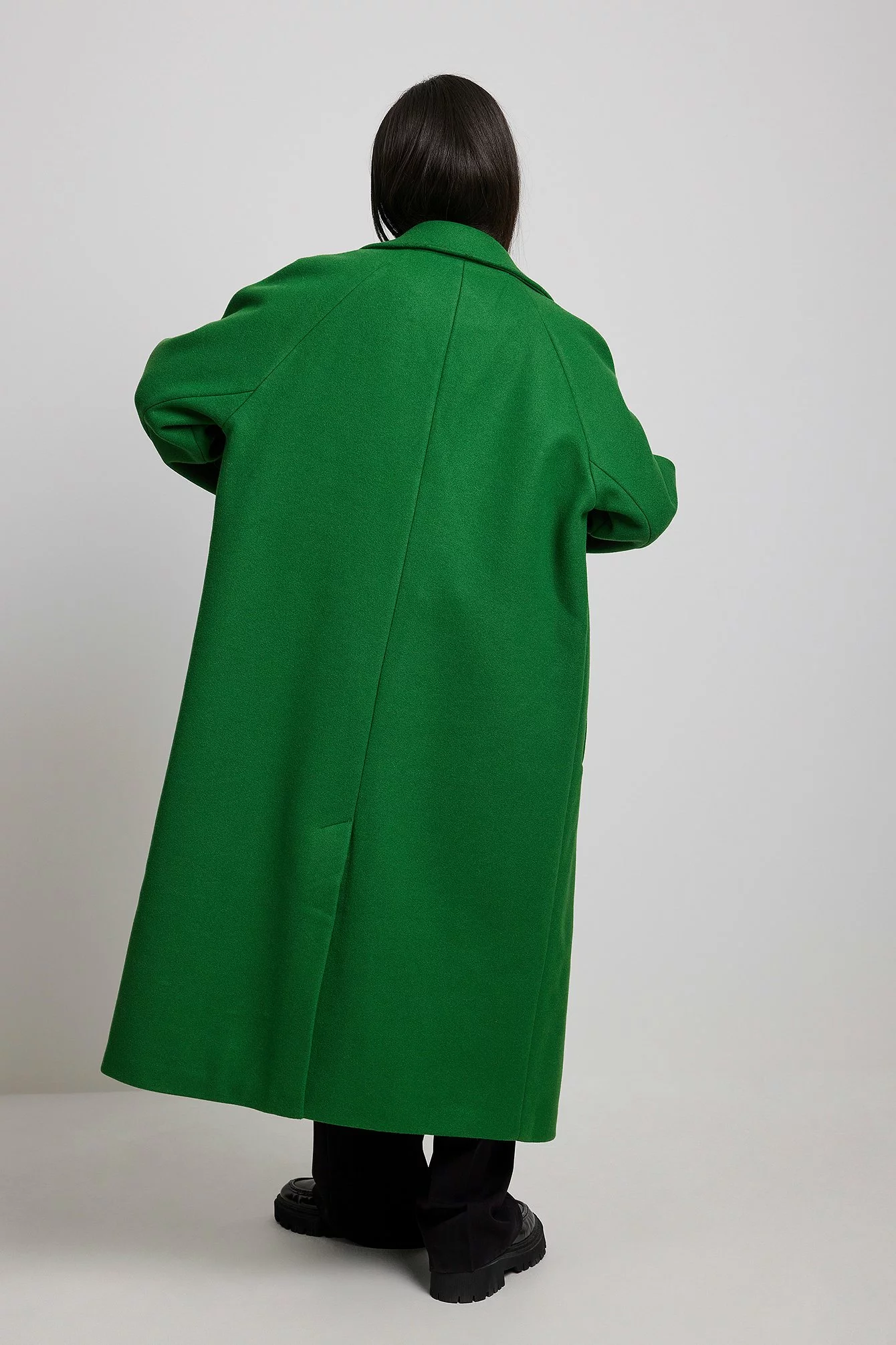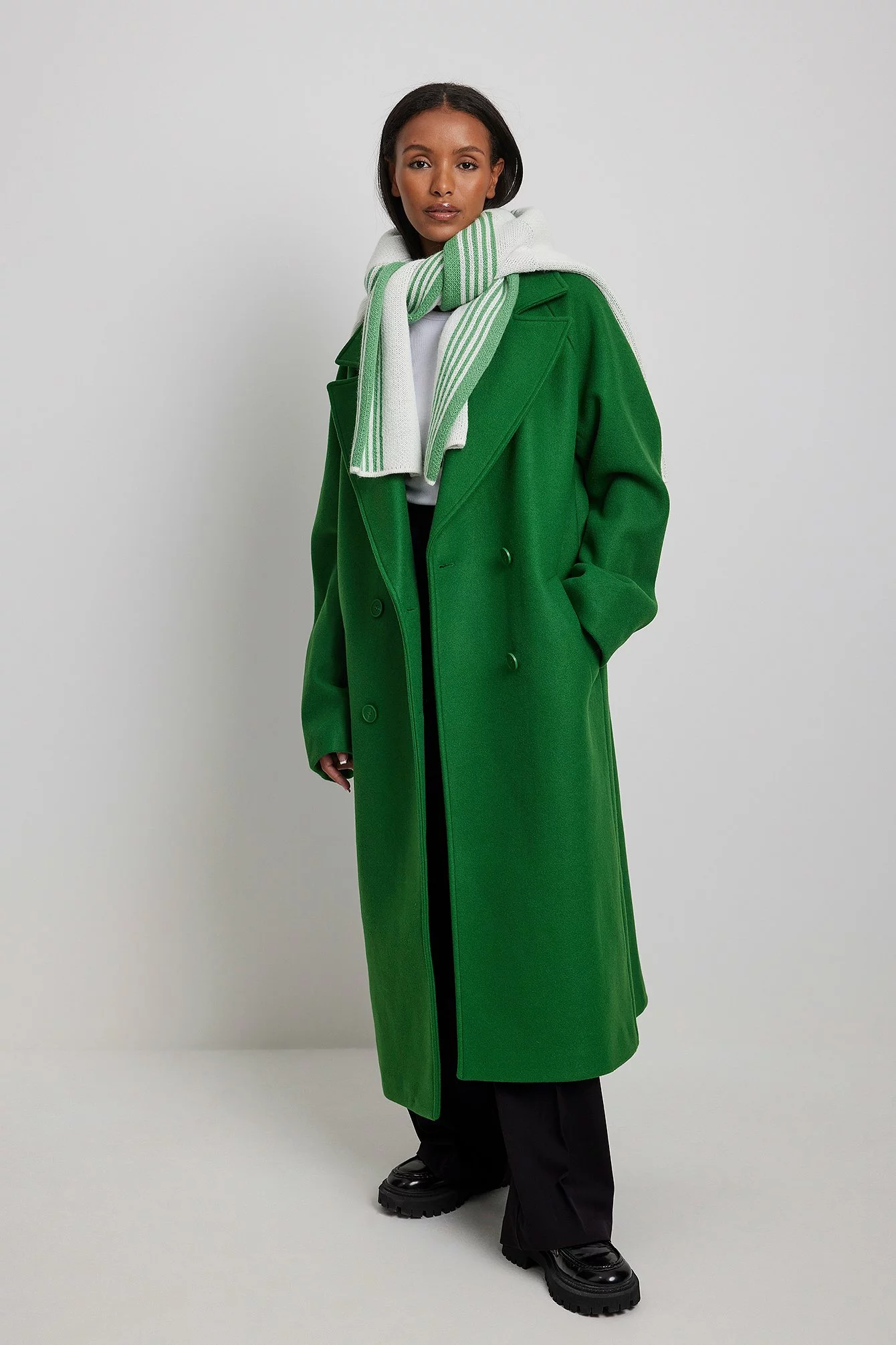 This coat features a midi length, a double-breasted button closure, button cuffs, front pockets and a back slit detail.