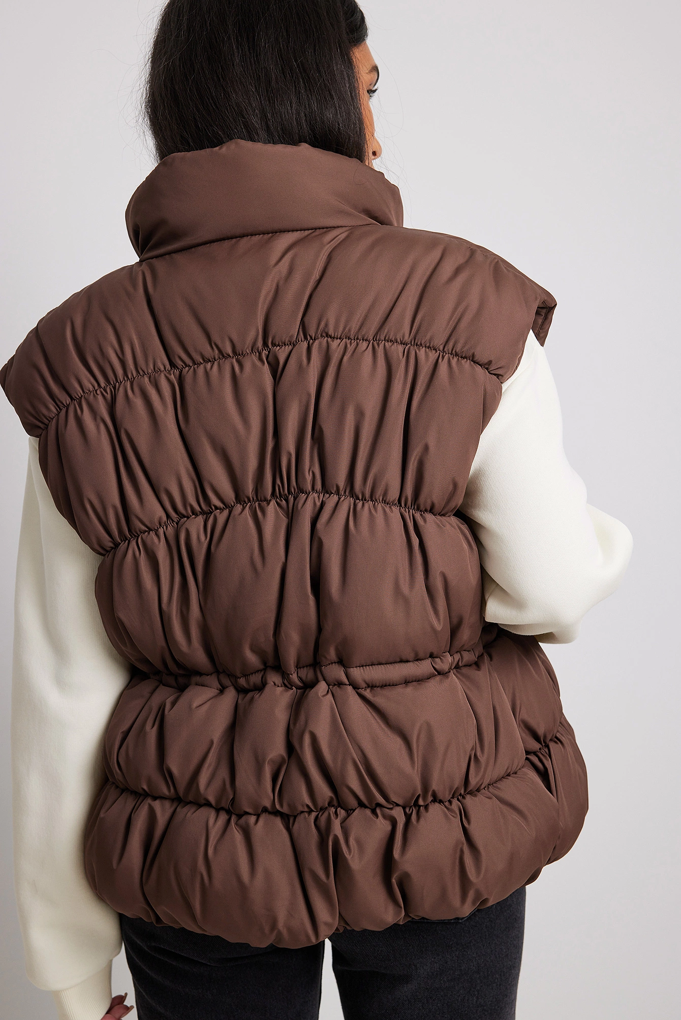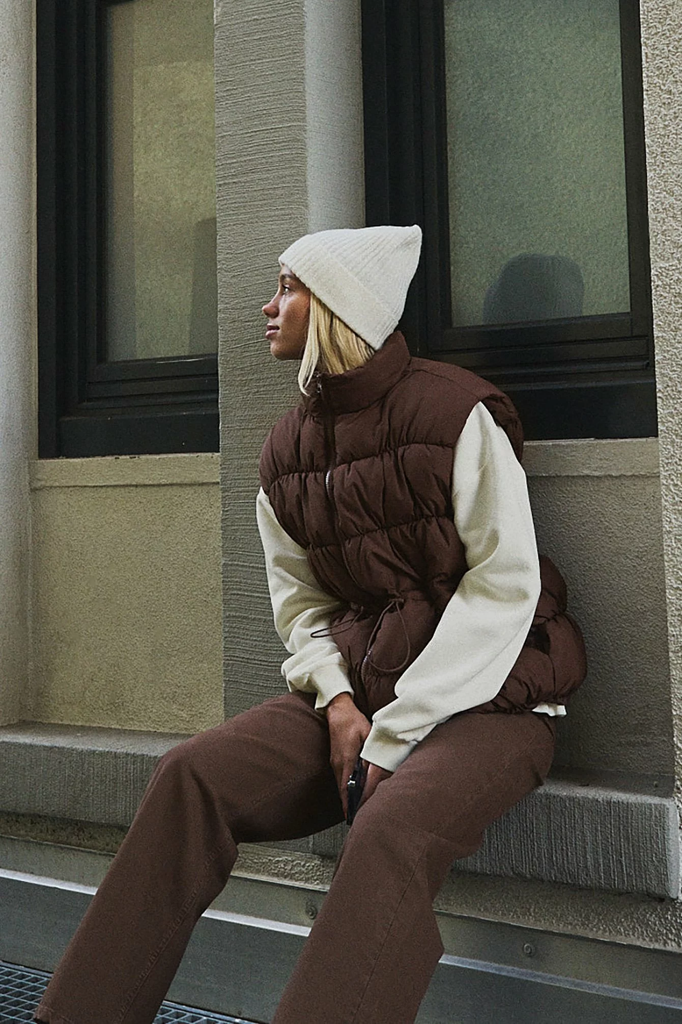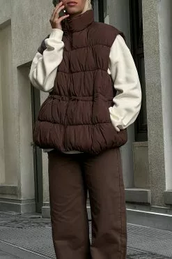 This puffer vest features a high neckline, a zipper along the front, two open side pockets and an elasticized drawstring waistband.