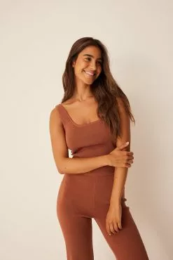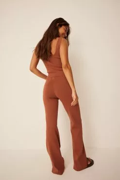These trousers feature a high waist. They have an elasticized waistband and flared legs. These trousers feature a knit material.