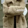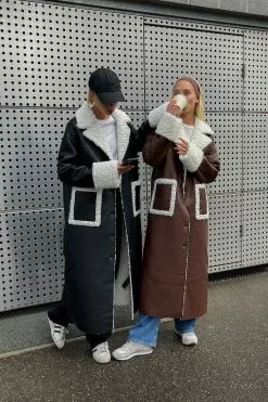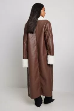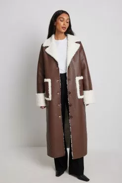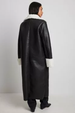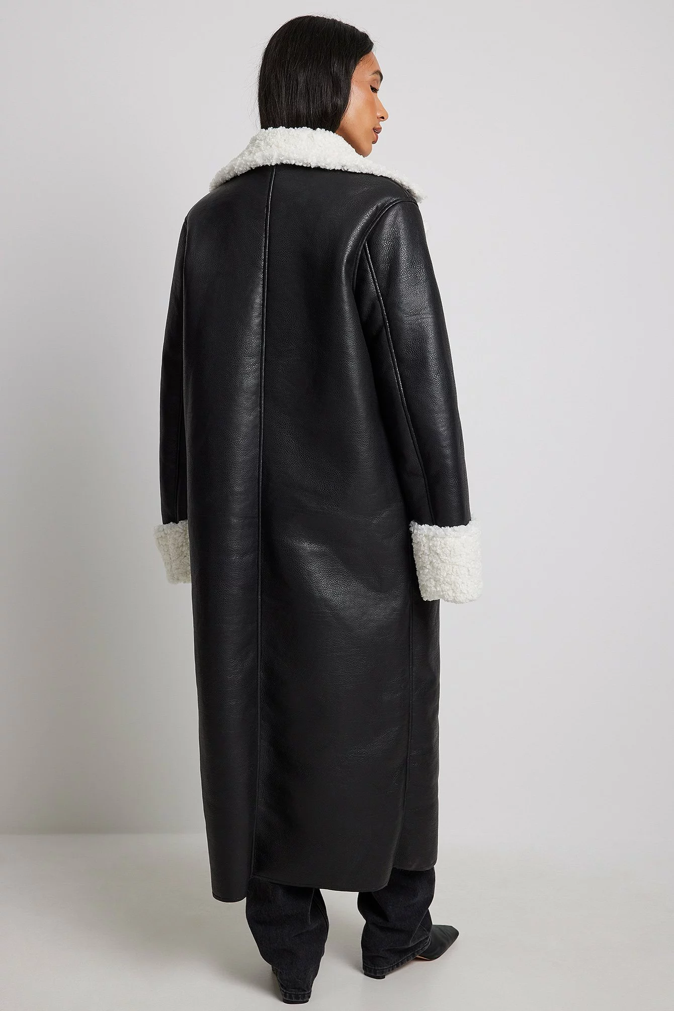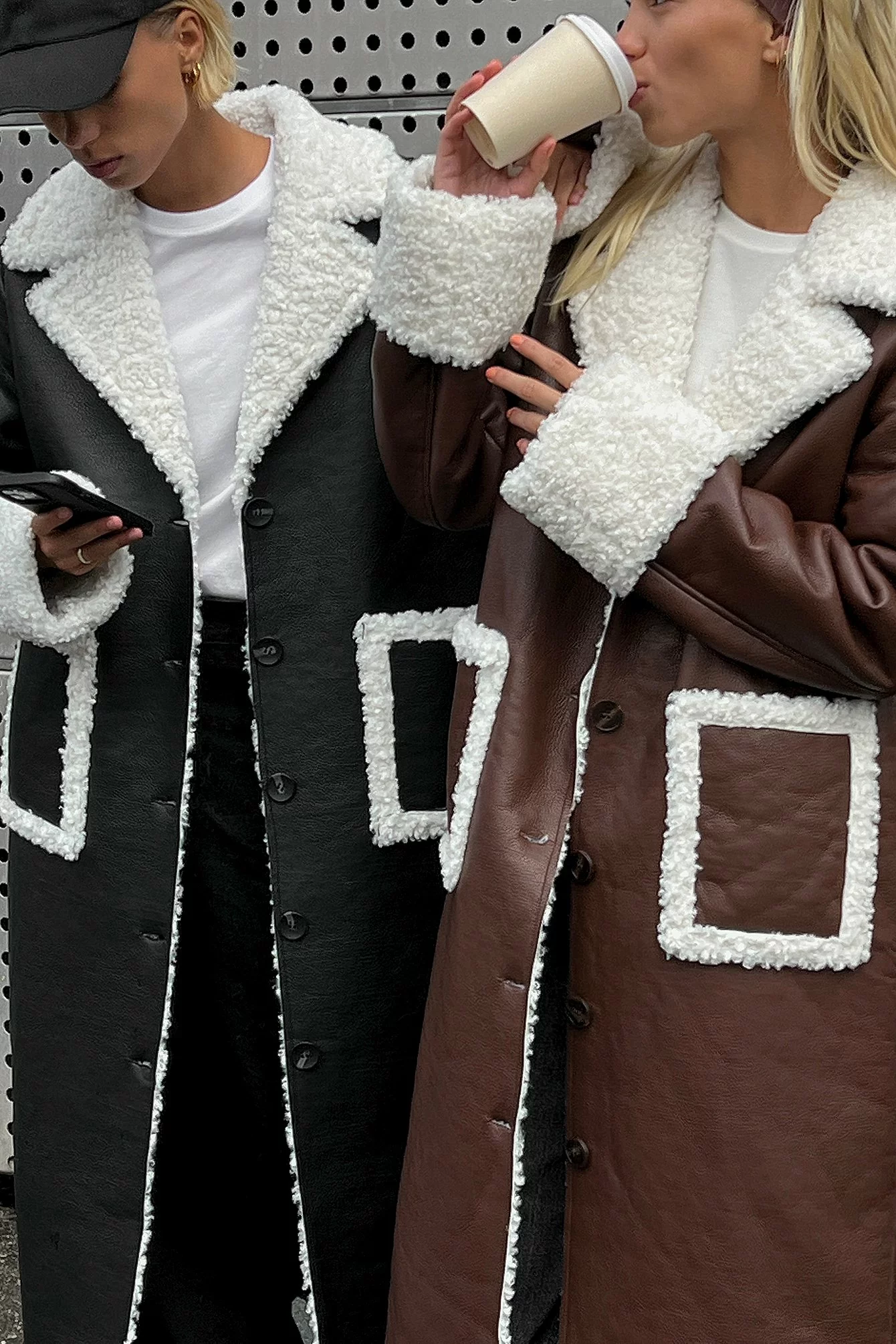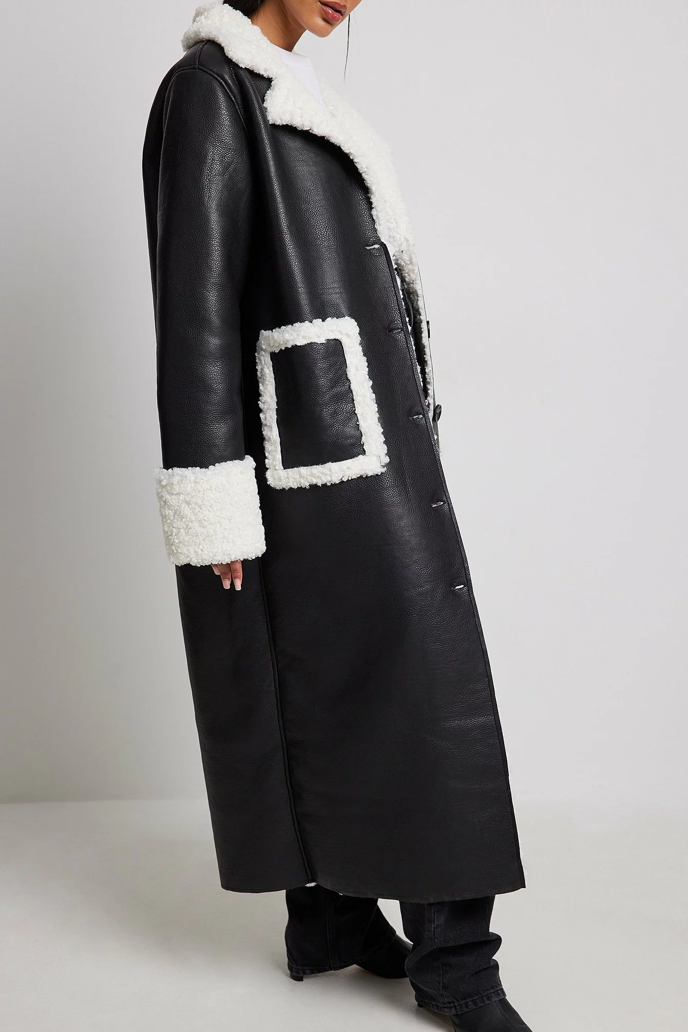 This coat is made of PU and features a lapel neckline, long sleeves, front pockets, a button closure, teddy details and a teddy lining.