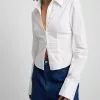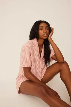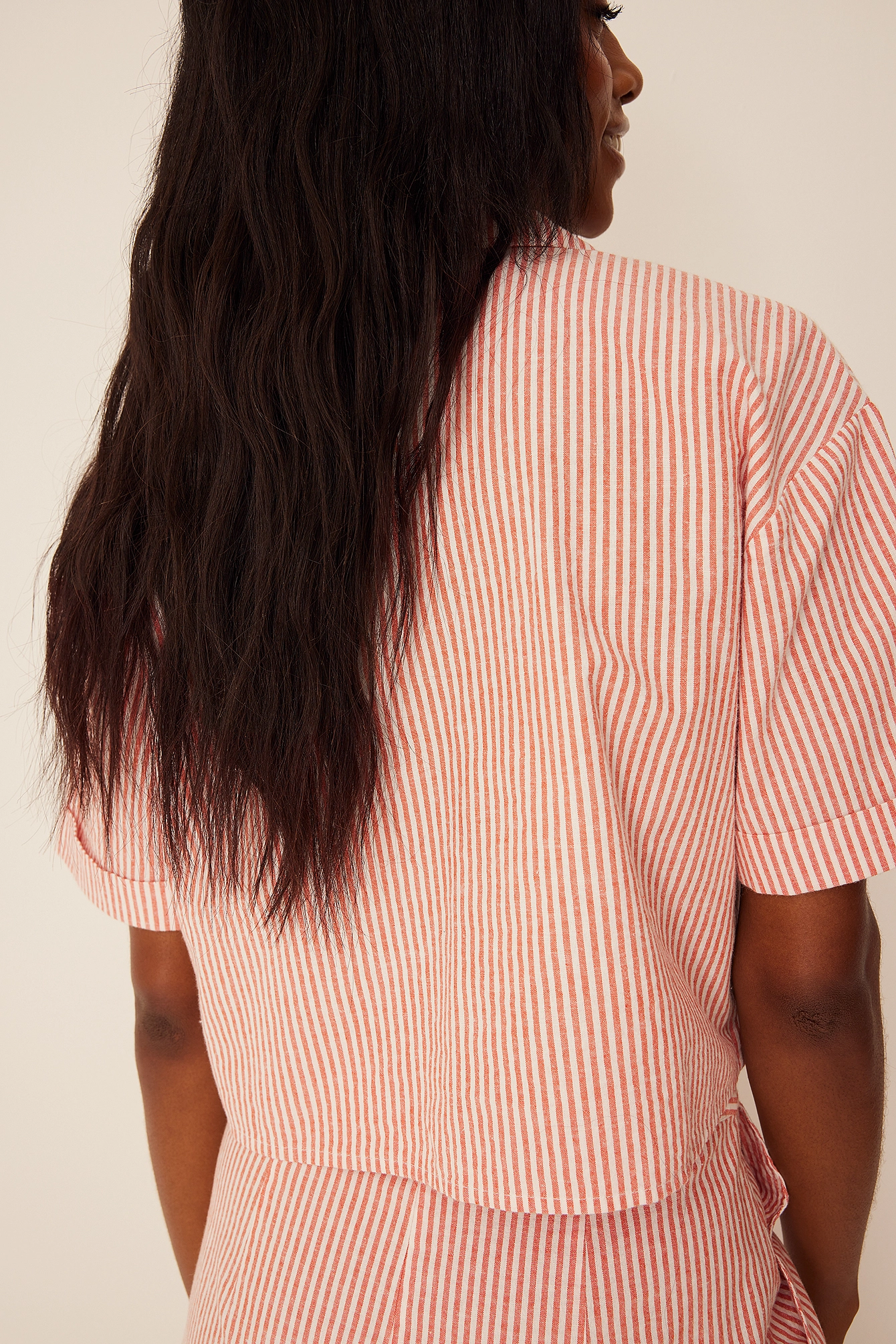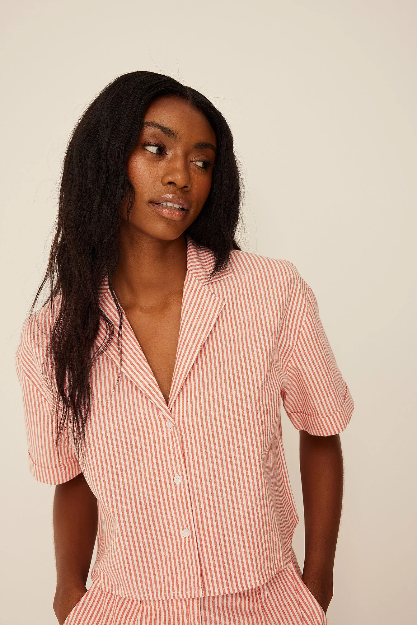 This shirt features a lapel neckline with buttons along the front, short sleeves and slightly cropped length.