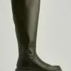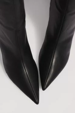 These boots are knee high and made of PU and feature pointed toes. They have a hidden, half zipper closure on the inside and stiletto heels. Measurements in size 39: Heel height: 9 cm / 3.54 in. Shaft height: 43 cm / 16.9 in. Shaft circumference around the calf: 38 cm / 14.96 in.