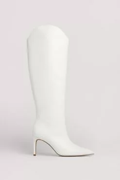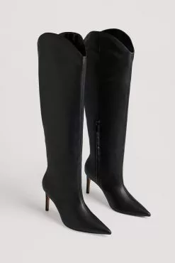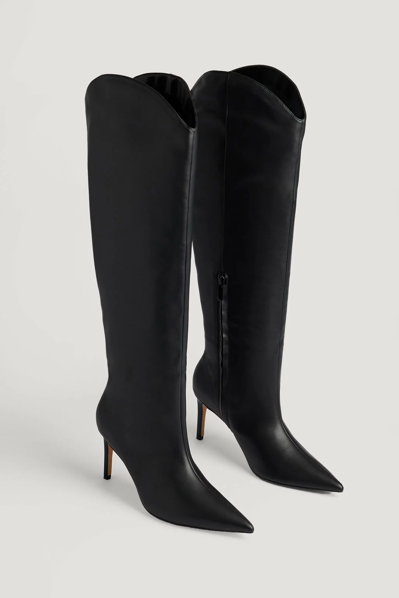 These boots are knee high and made of PU and feature pointed toes. They have a hidden, half zipper closure on the inside and stiletto heels. Measurements in size 39: Heel height: 9 cm / 3.54 in. Shaft height: 43 cm / 16.9 in. Shaft circumference around the calf: 38 cm / 14.96 in.