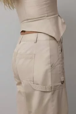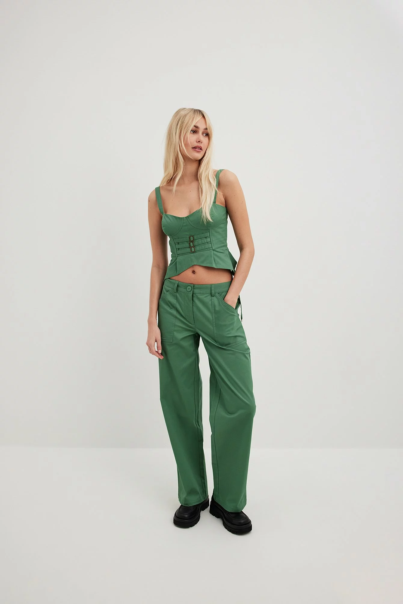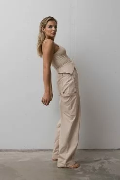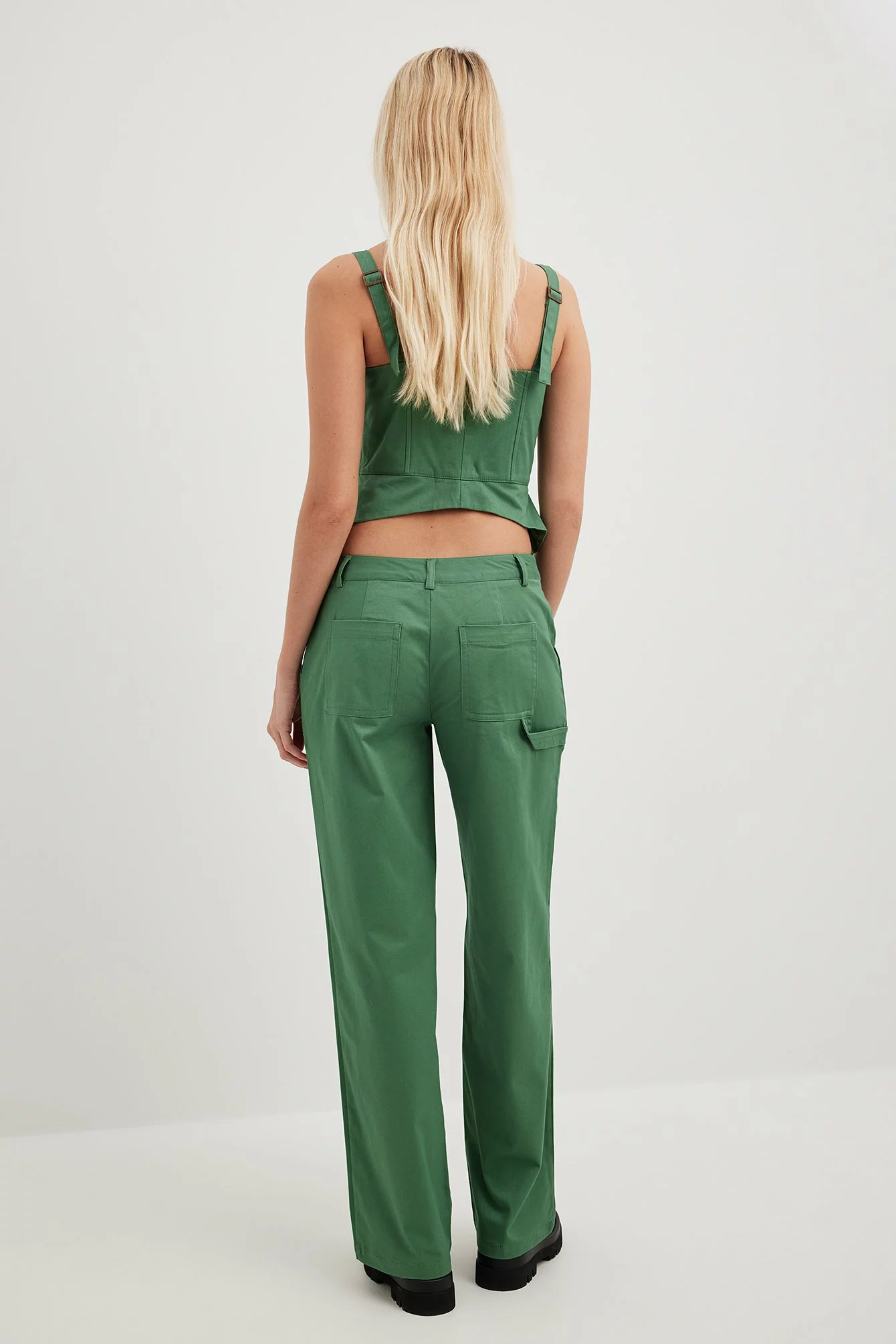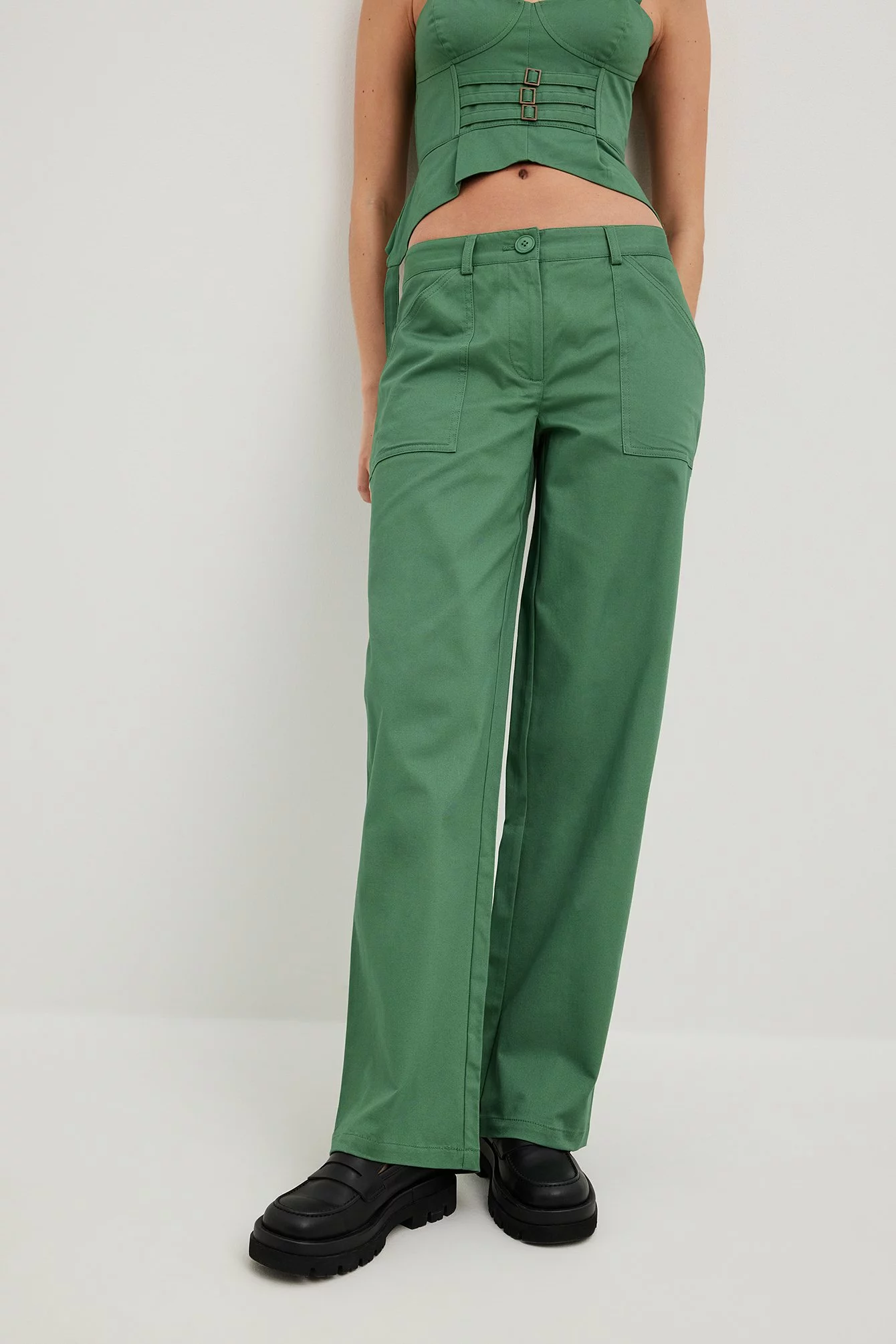 These trousers feature a cargo design. They have a mid waist and a straight leg. These trousers feature patched front pockets.