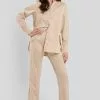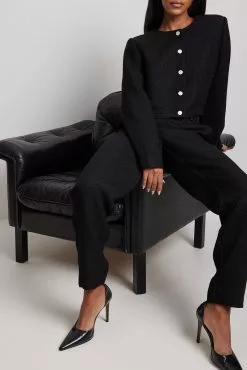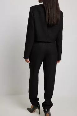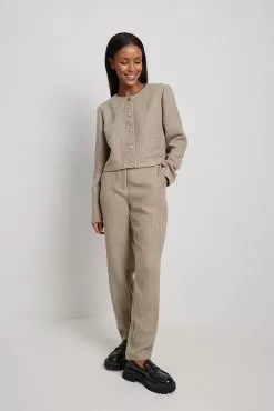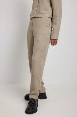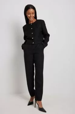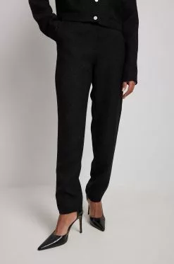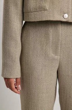 These trousers feature ankle length. They have a high waist and a zipper and hook closure. These trousers feature side pockets and a textured material.