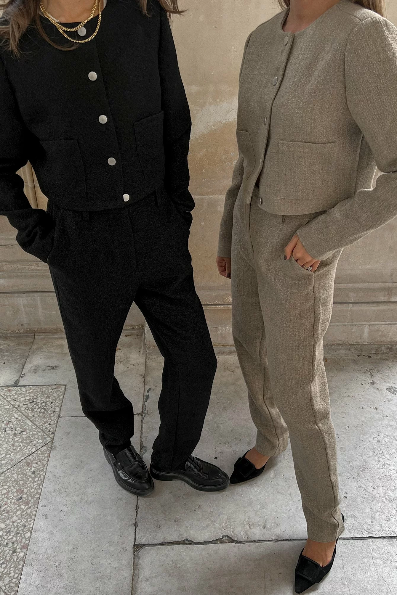 These trousers feature ankle length. They have a high waist and a zipper and hook closure. These trousers feature side pockets and a textured material.