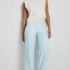 These trousers feature a faux leather material. They have a high waist fit with a zipper and button closure and a five-pocket design. These trousers feature a gently tapered leg with a seam detail at the knees.