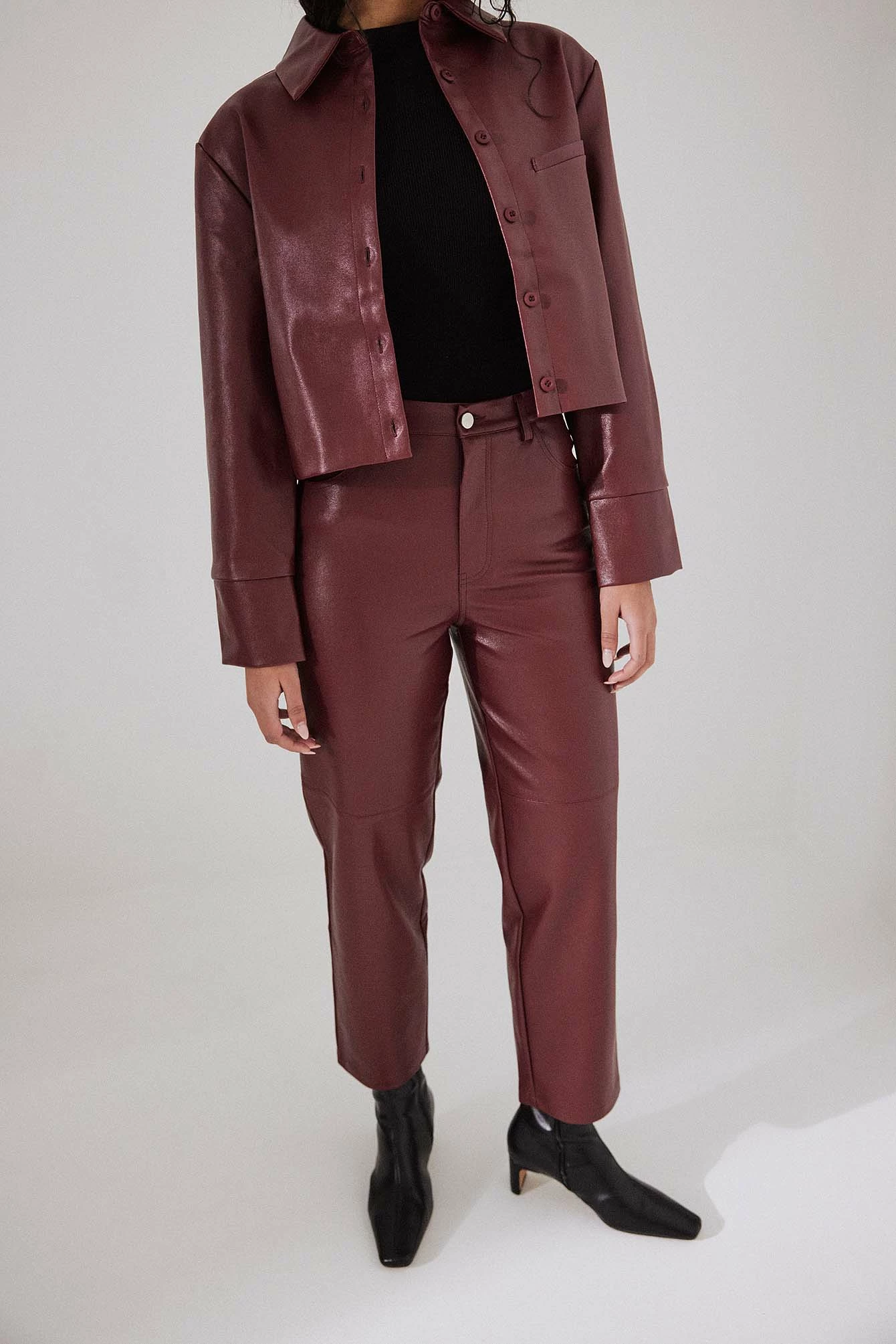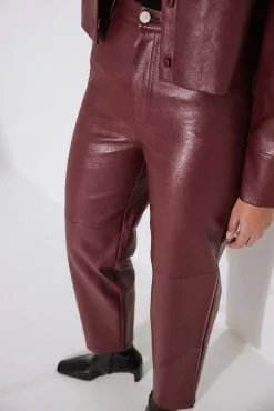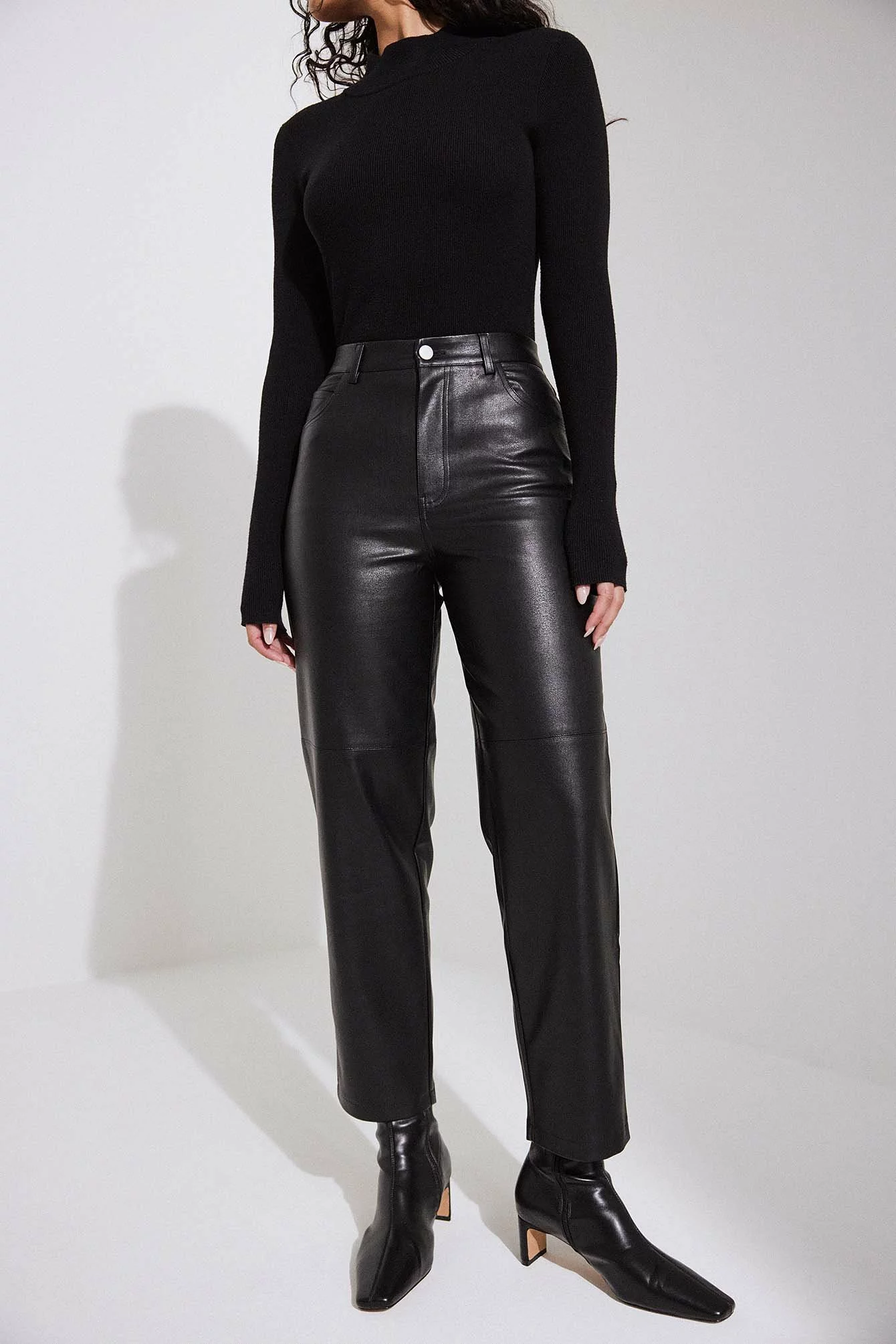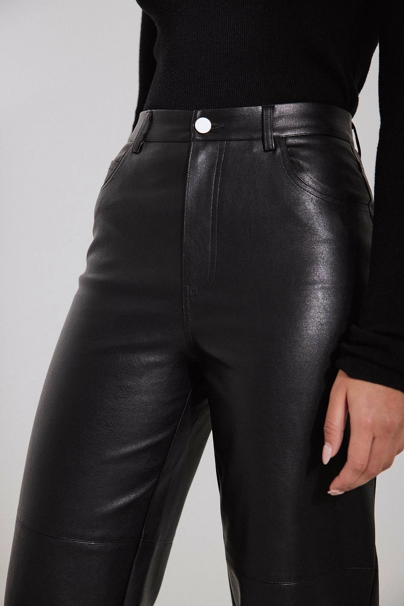 These trousers feature a faux leather material. They have a high waist fit with a zipper and button closure and a five-pocket design. These trousers feature a gently tapered leg with a seam detail at the knees.
