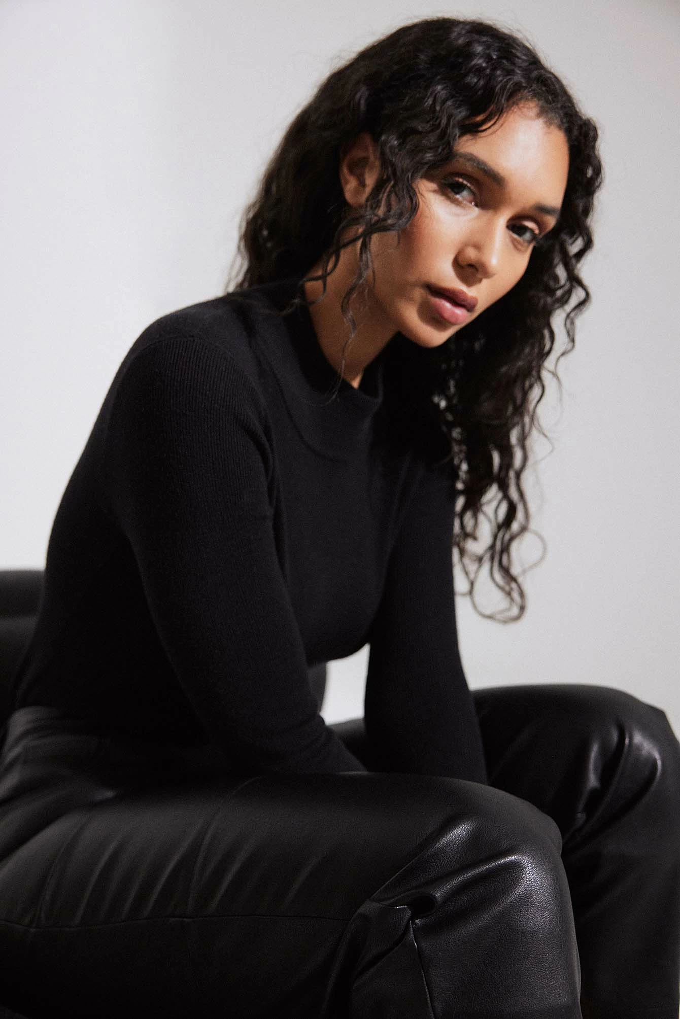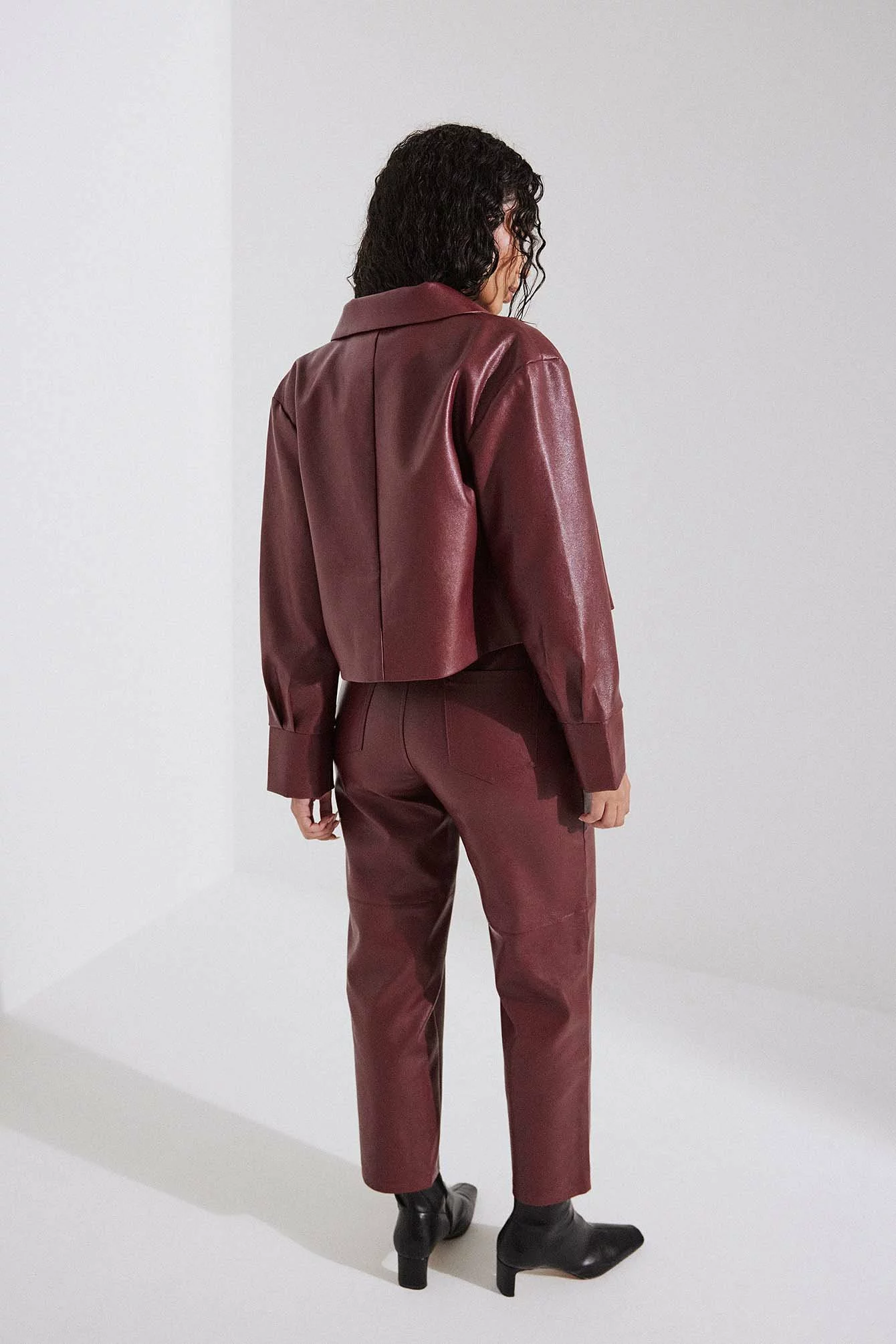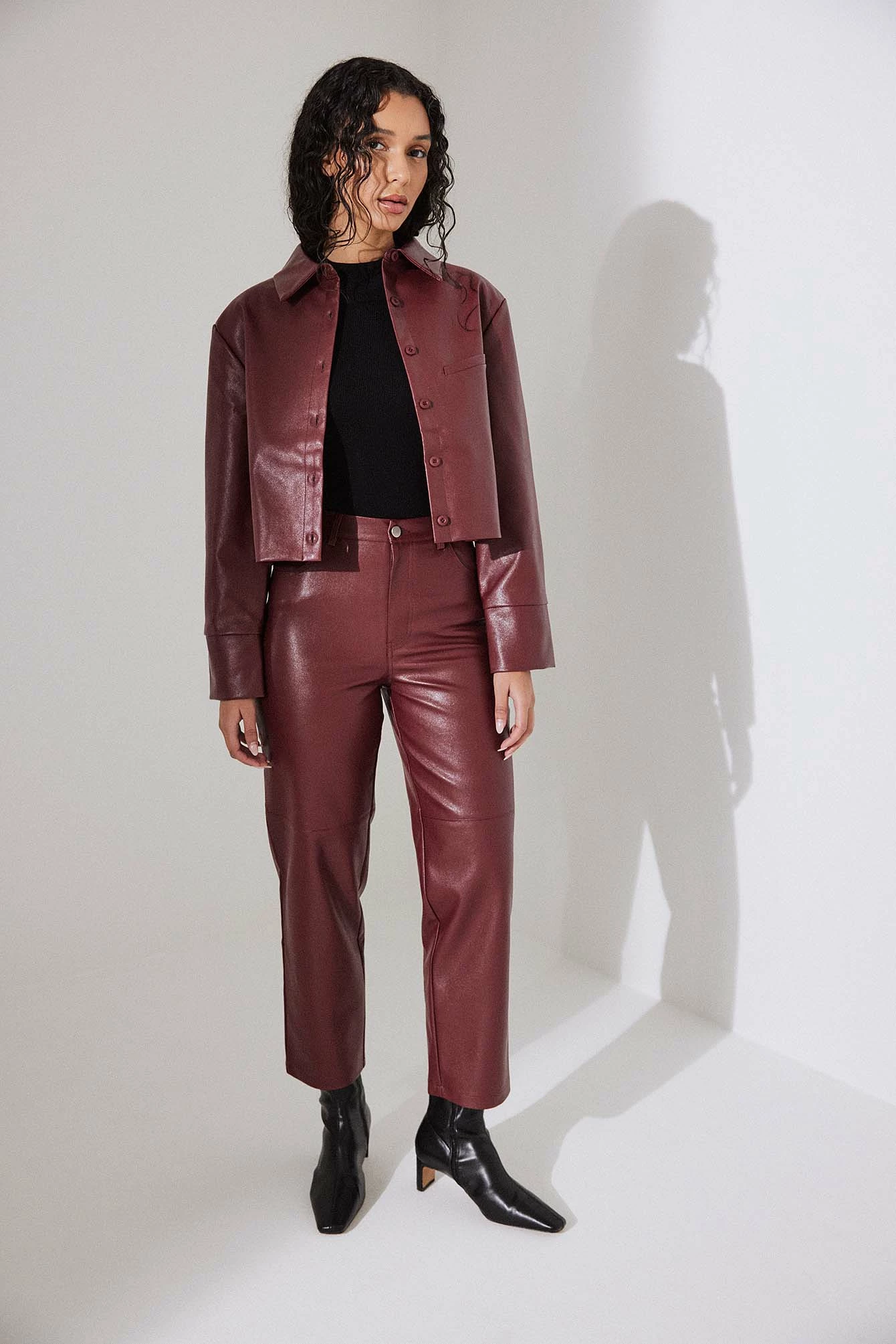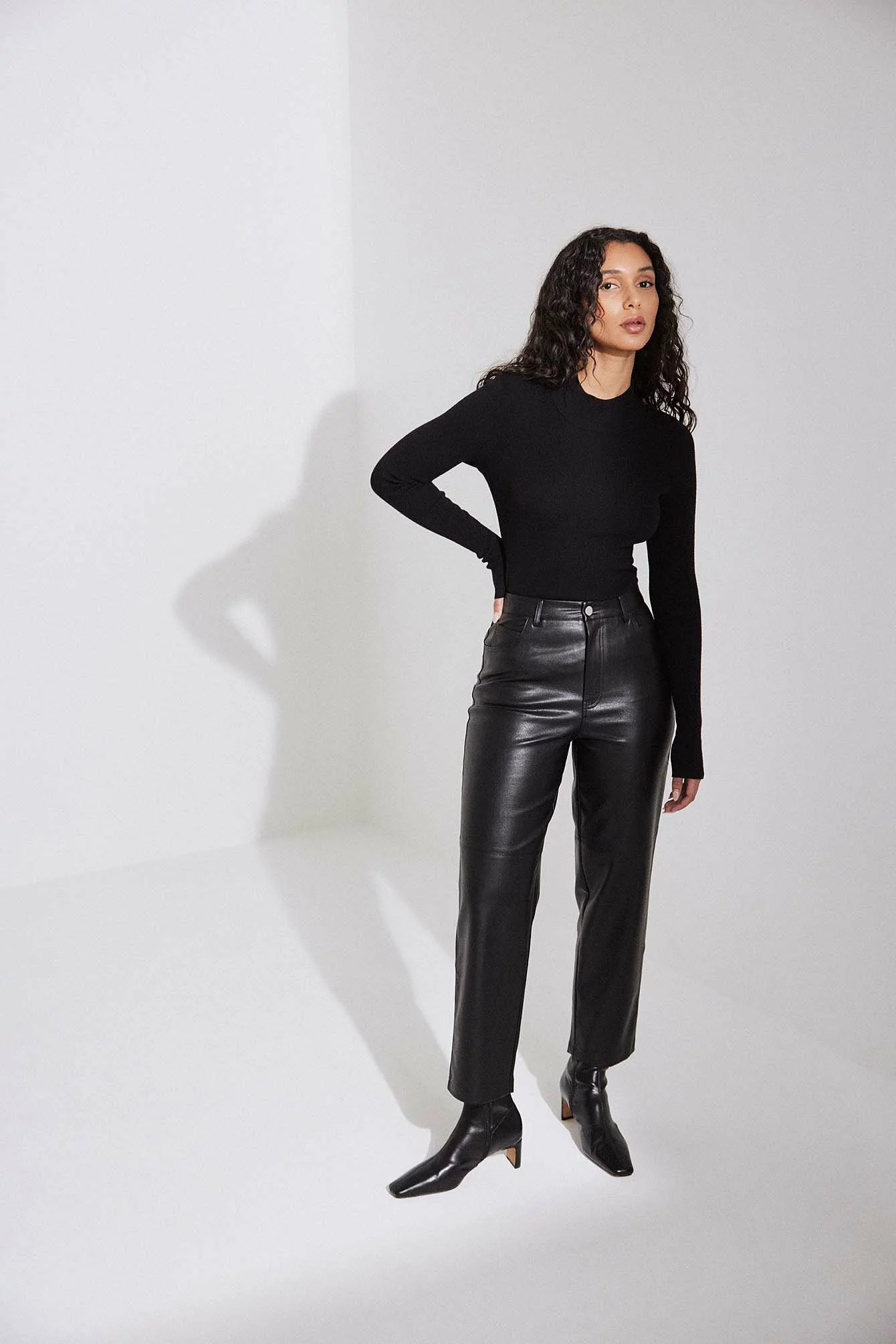 These trousers feature a faux leather material. They have a high waist fit with a zipper and button closure and a five-pocket design. These trousers feature a gently tapered leg with a seam detail at the knees.