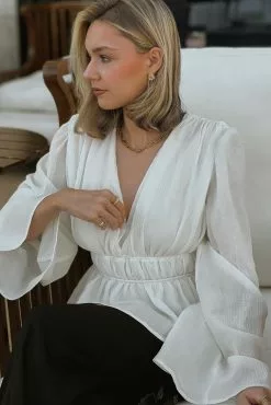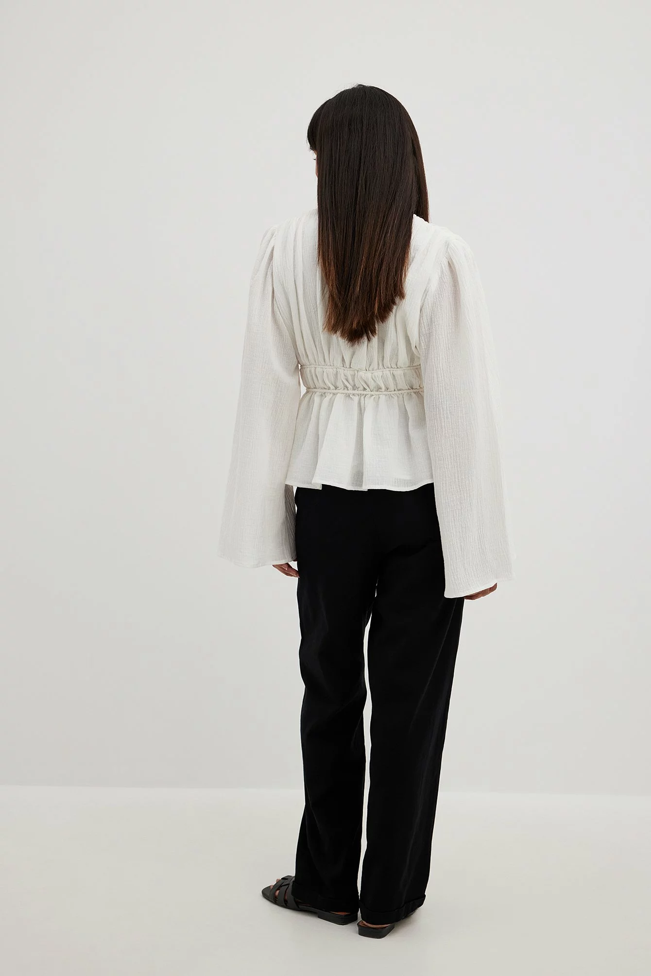 This blouse features a structured material. It has a v neckline and wide long sleeves. This blouse features elasticized waistbands and a lining.
