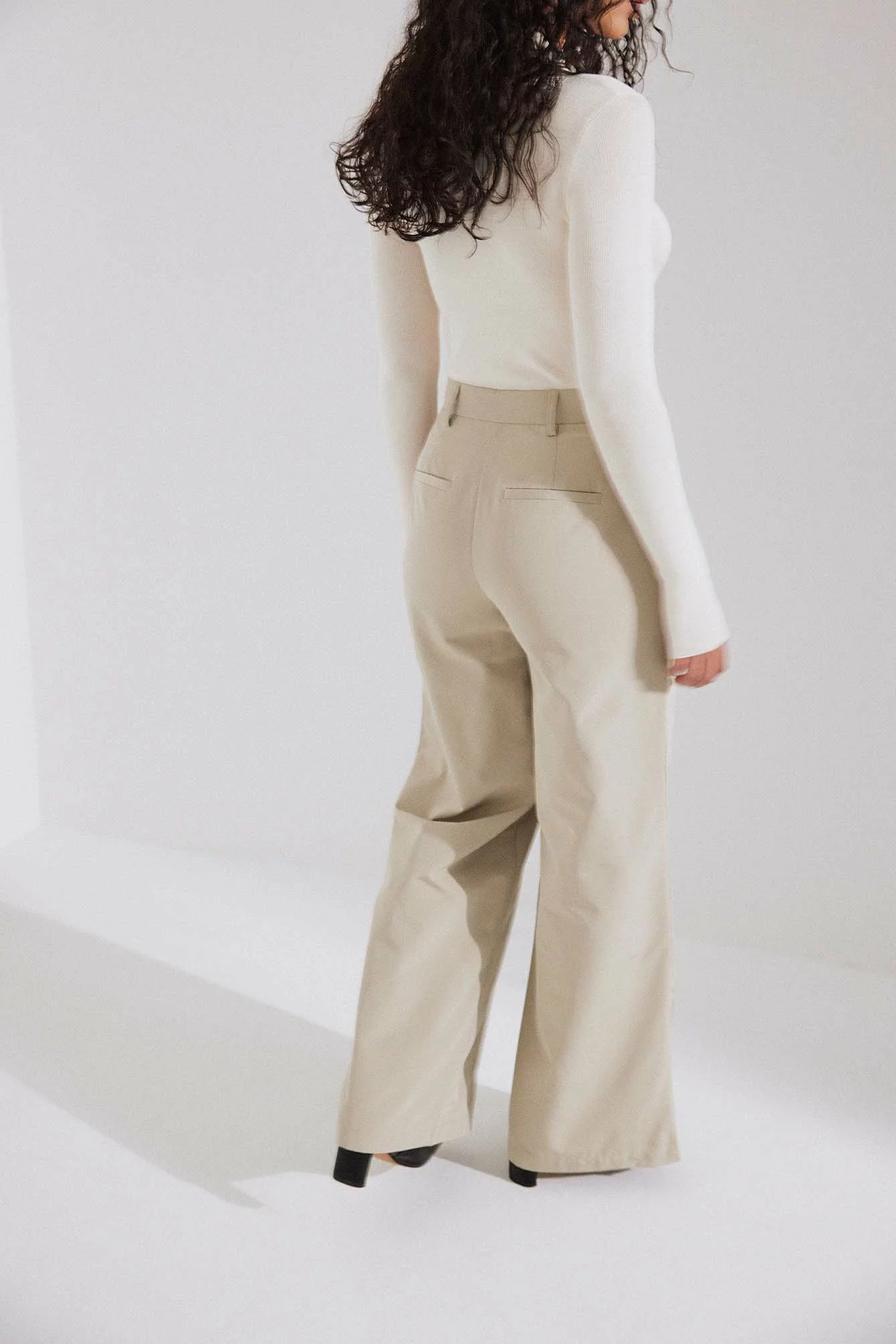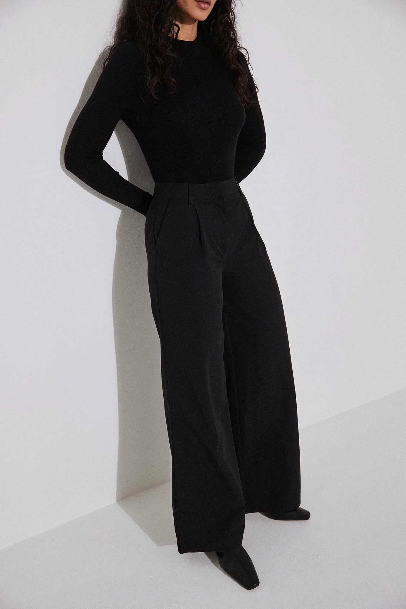 These trousers are woven and feature a high waist fit with a zipper, hook and button closure. They have a pleat detail on the front and side slanting pockets. These trousers feature two back mock pockets and a wide leg.