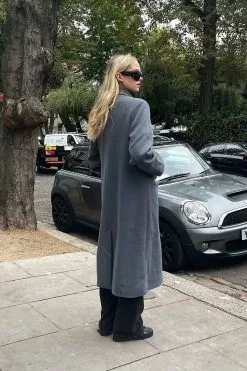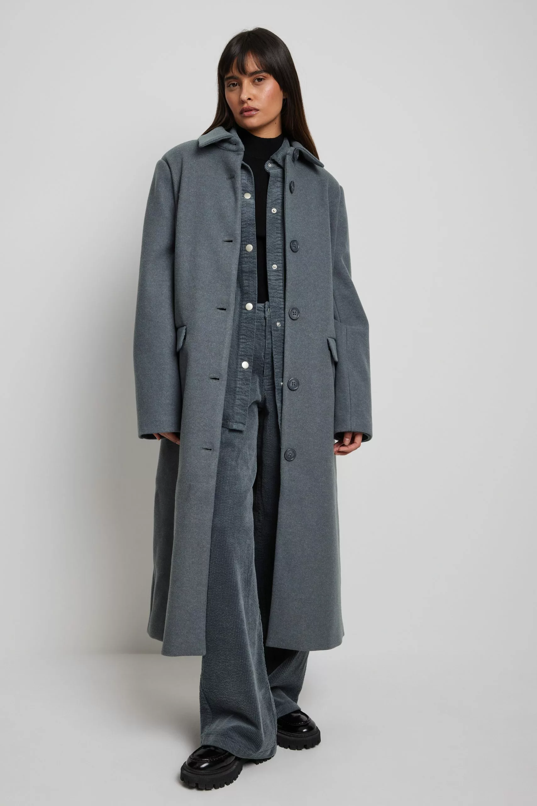 This coat is oversized and features a shirt collar, a button closure, front pockets and button cuffs.
