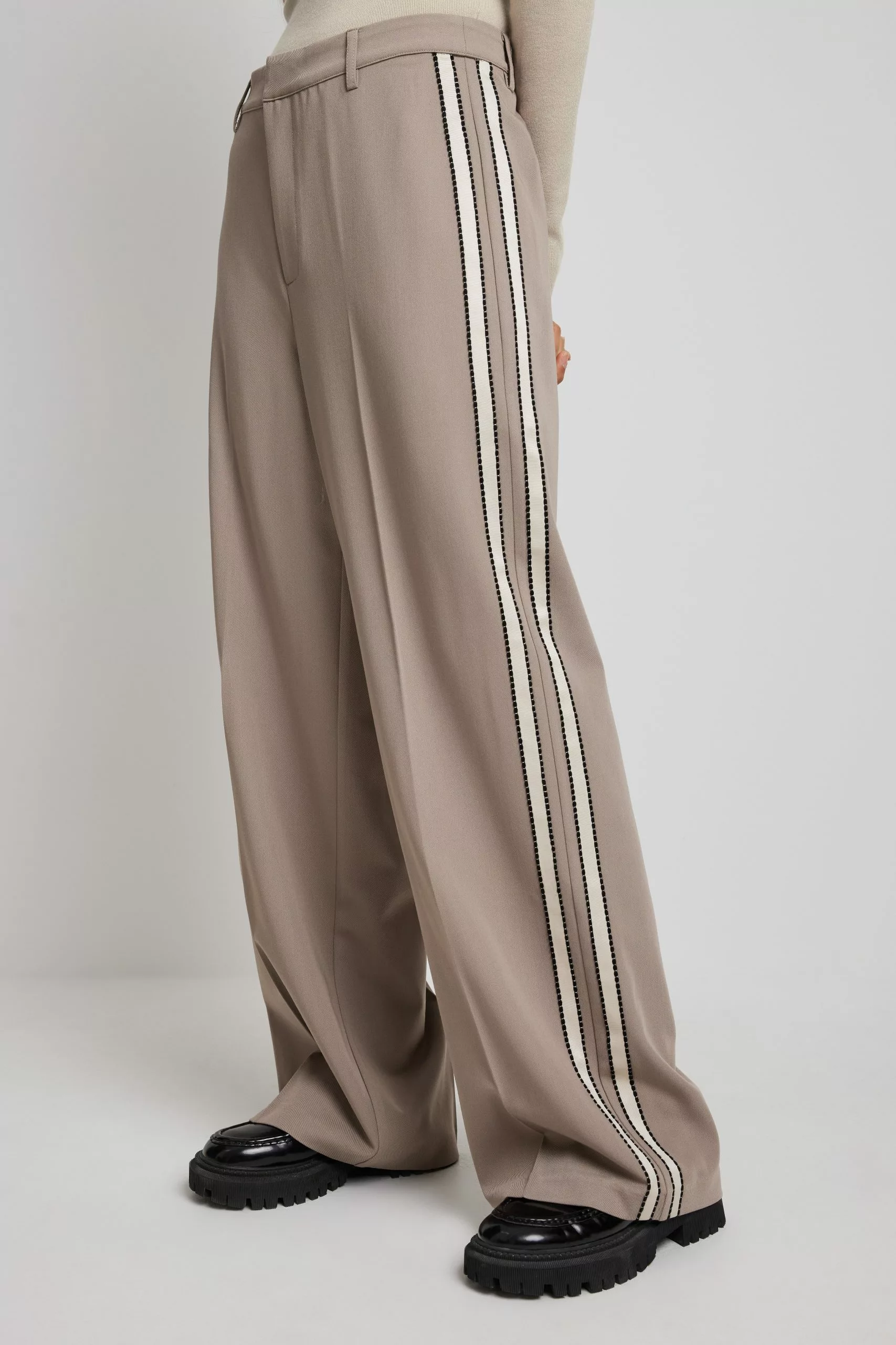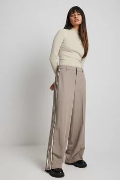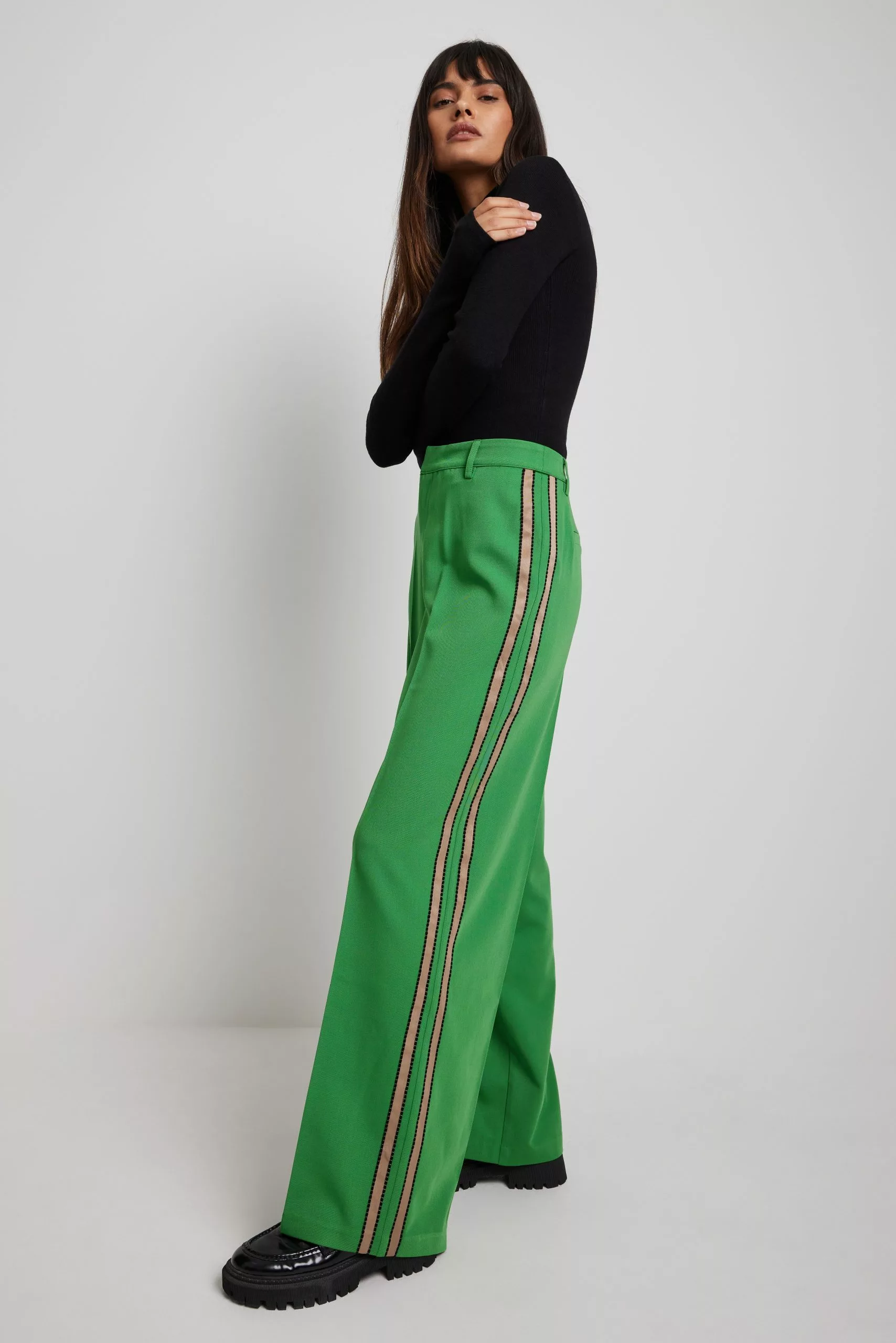 These trousers feature a high rise waist with belt loops, a zipper, hook and button closure, two back mock pockets, side stripe details with a contrast color and a straight leg.