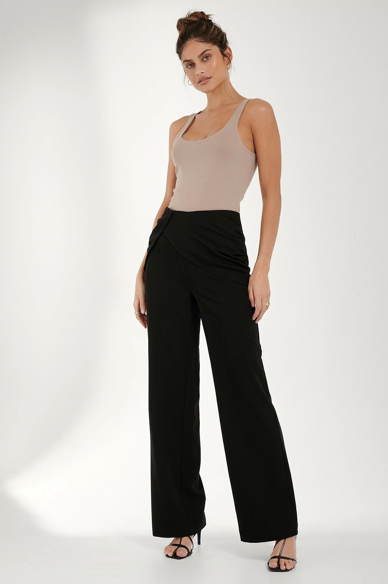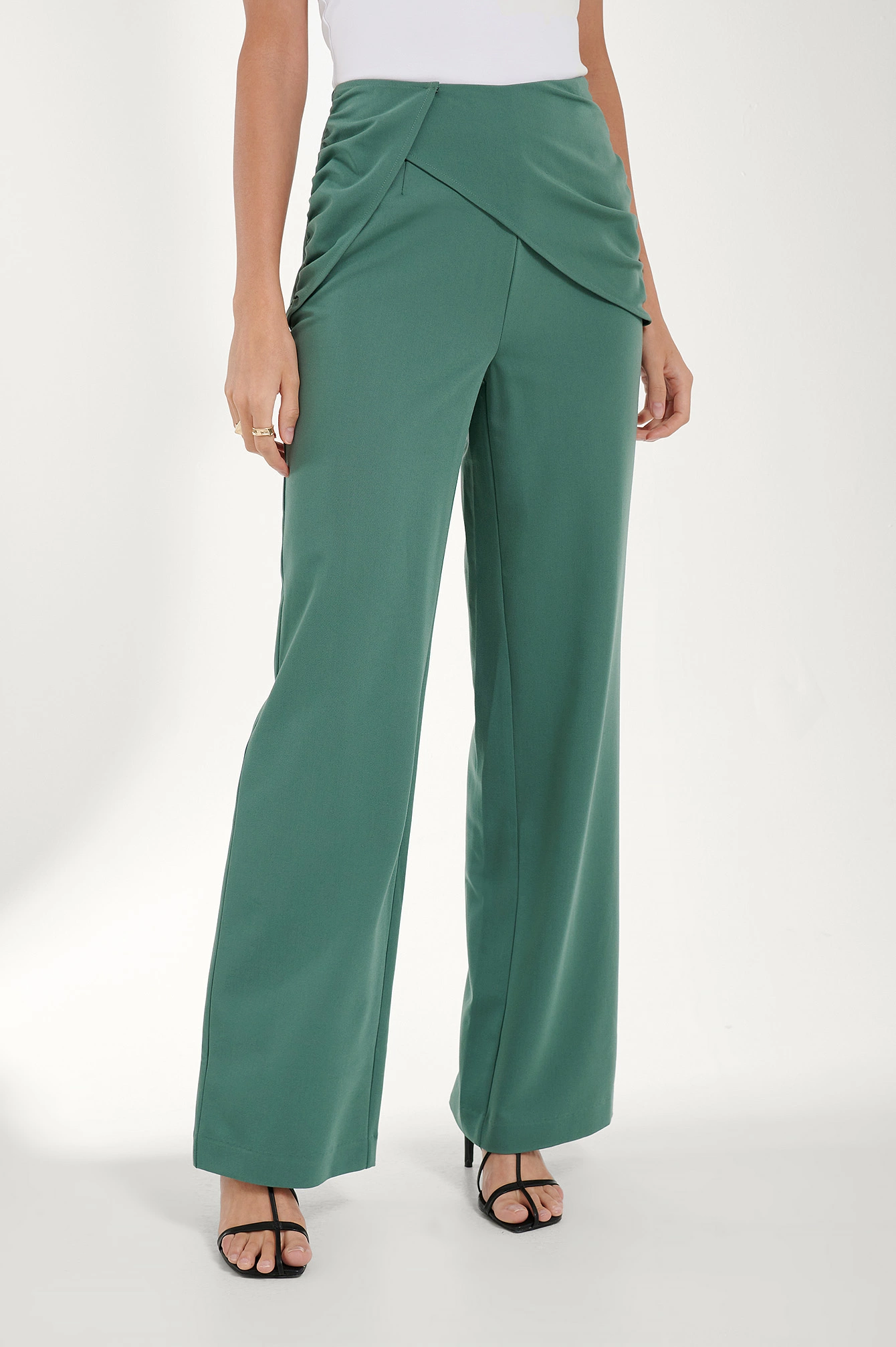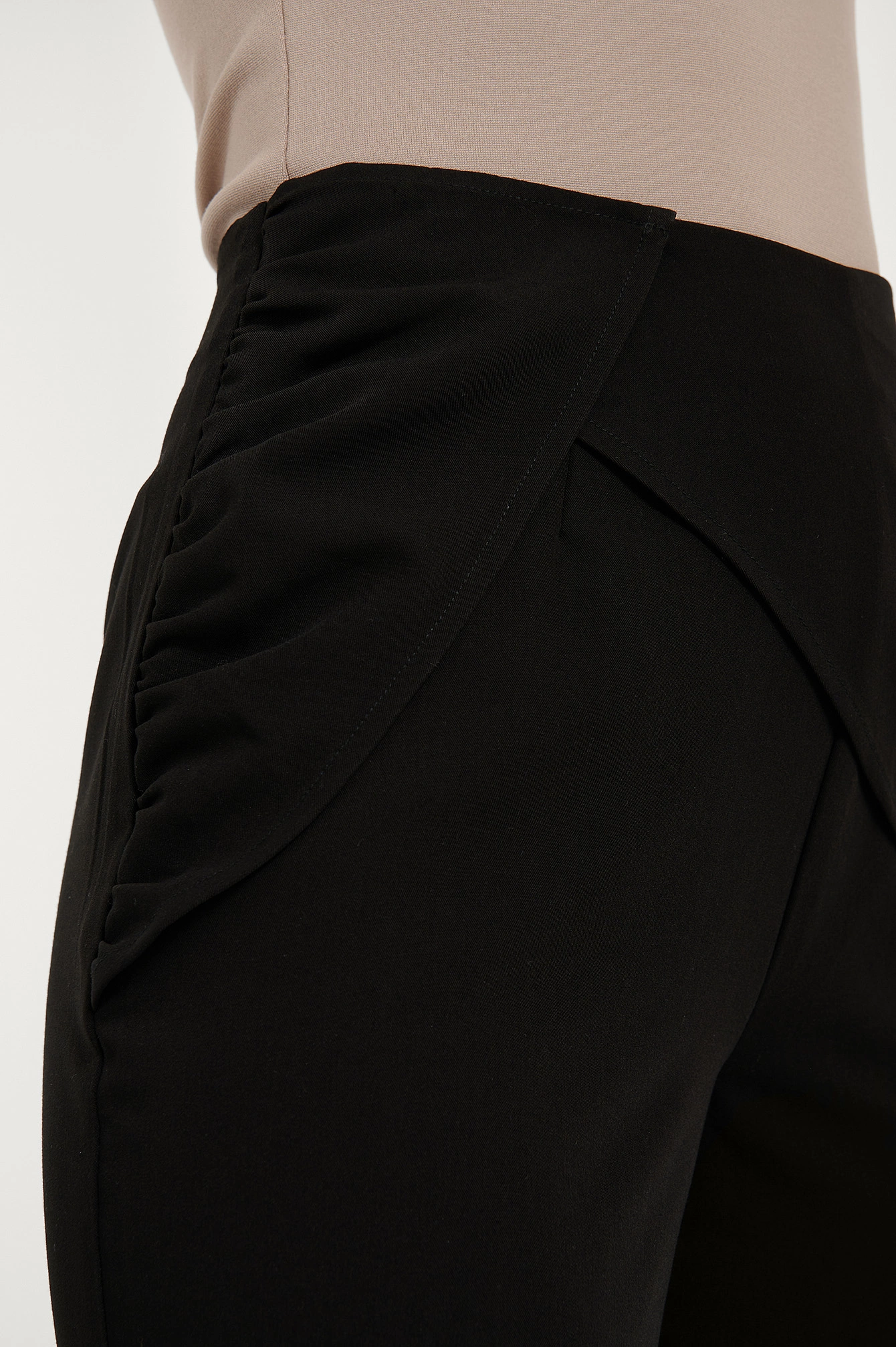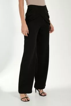 These pants feature a high waist, a concealed side zipper closure, a draped design on the front with a hidden button closure and gathered side seams, a tailored fit and a straight leg.
