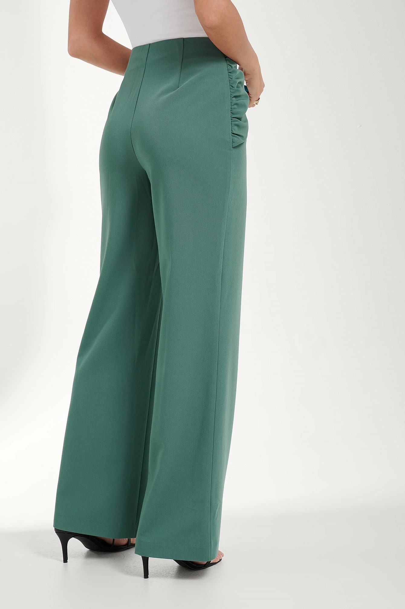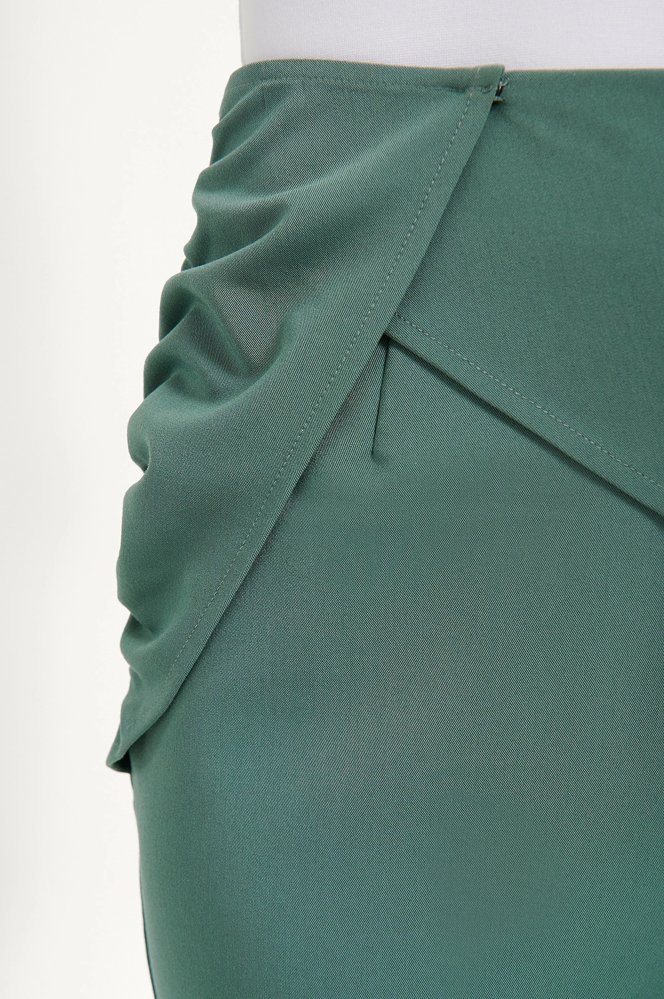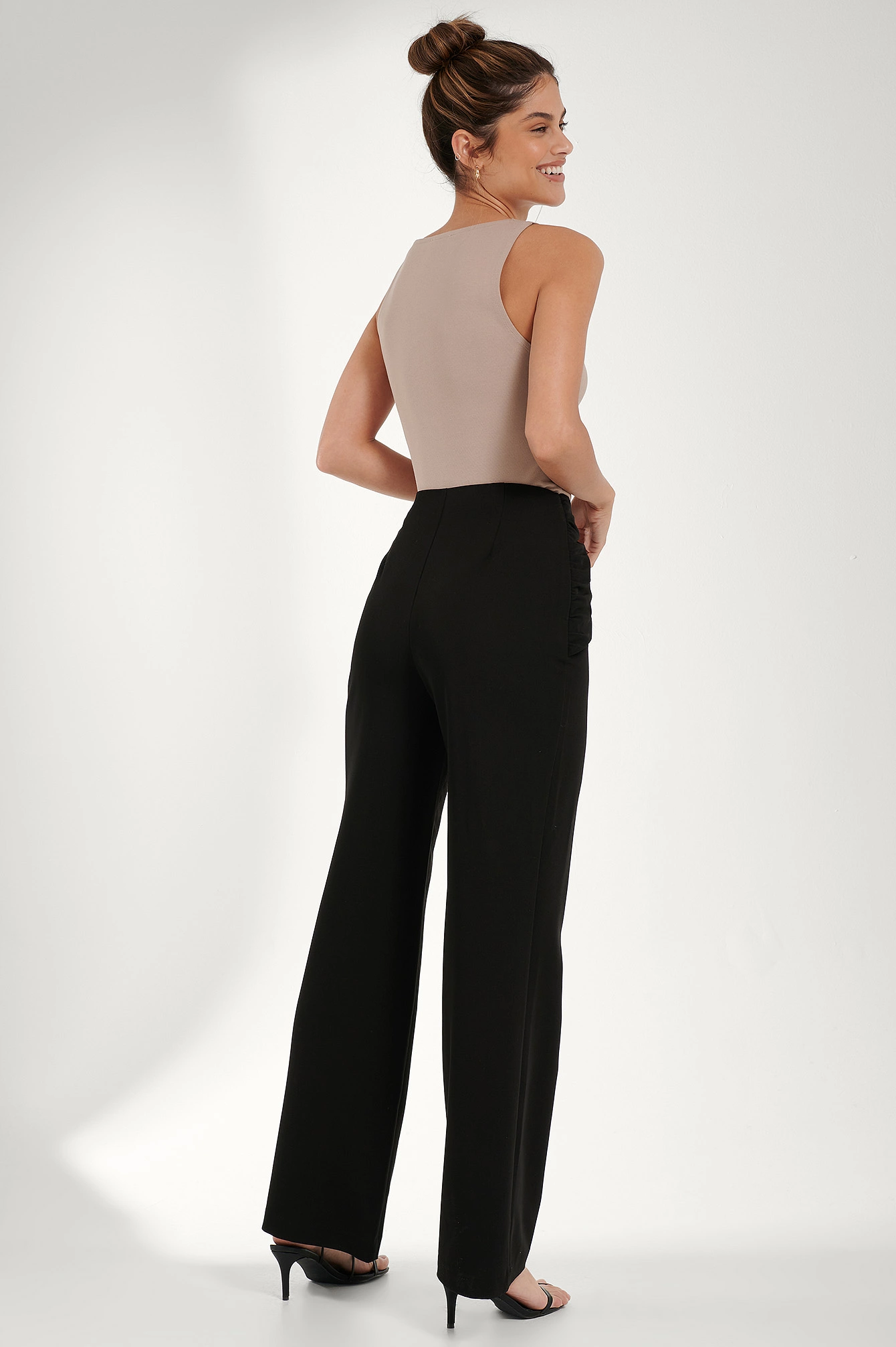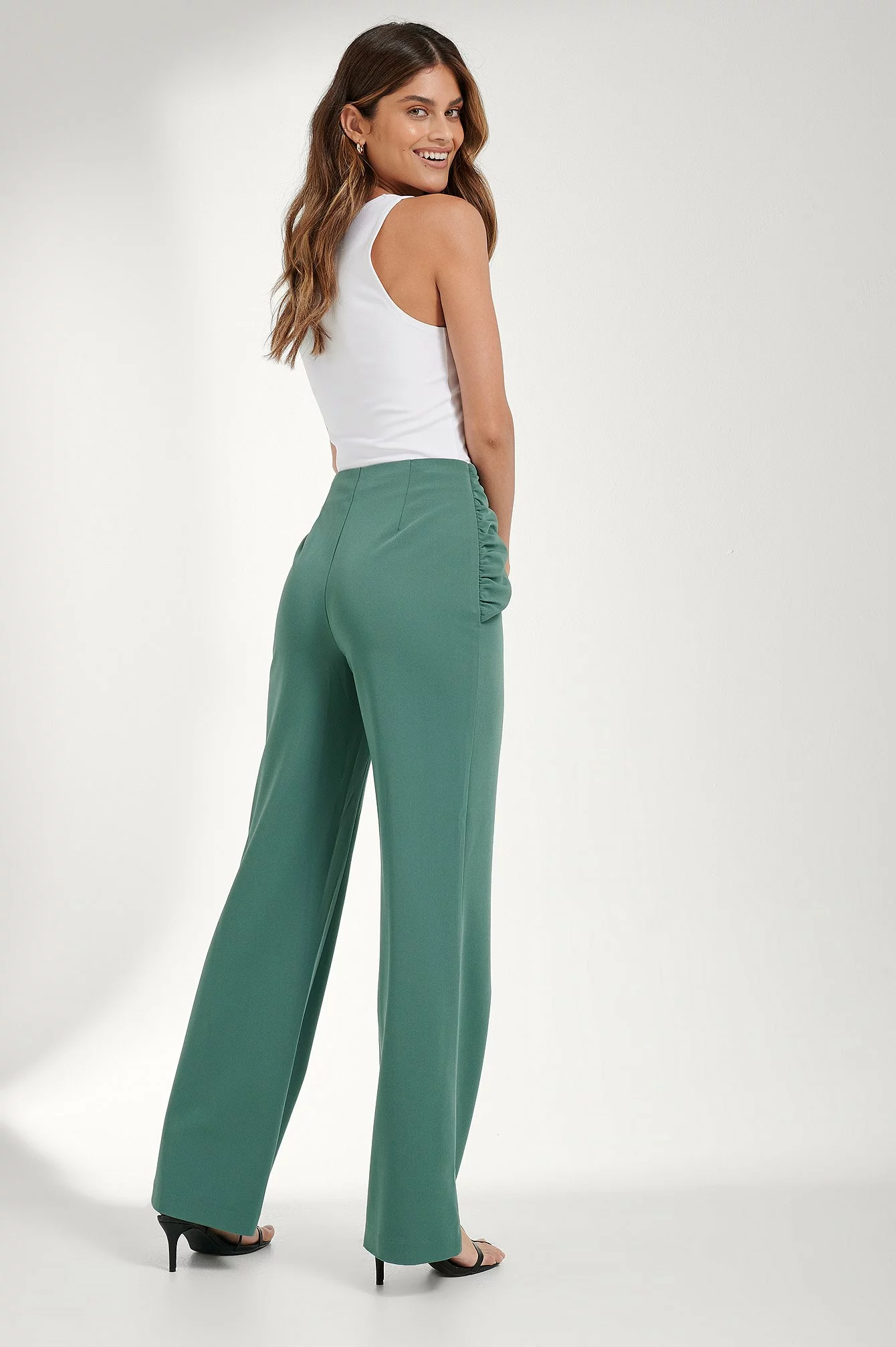 These pants feature a high waist, a concealed side zipper closure, a draped design on the front with a hidden button closure and gathered side seams, a tailored fit and a straight leg.