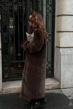 This coat is long and features a faux fur. It has a soft touch and a shirt collar. This coat features a hook closure and side pockets.