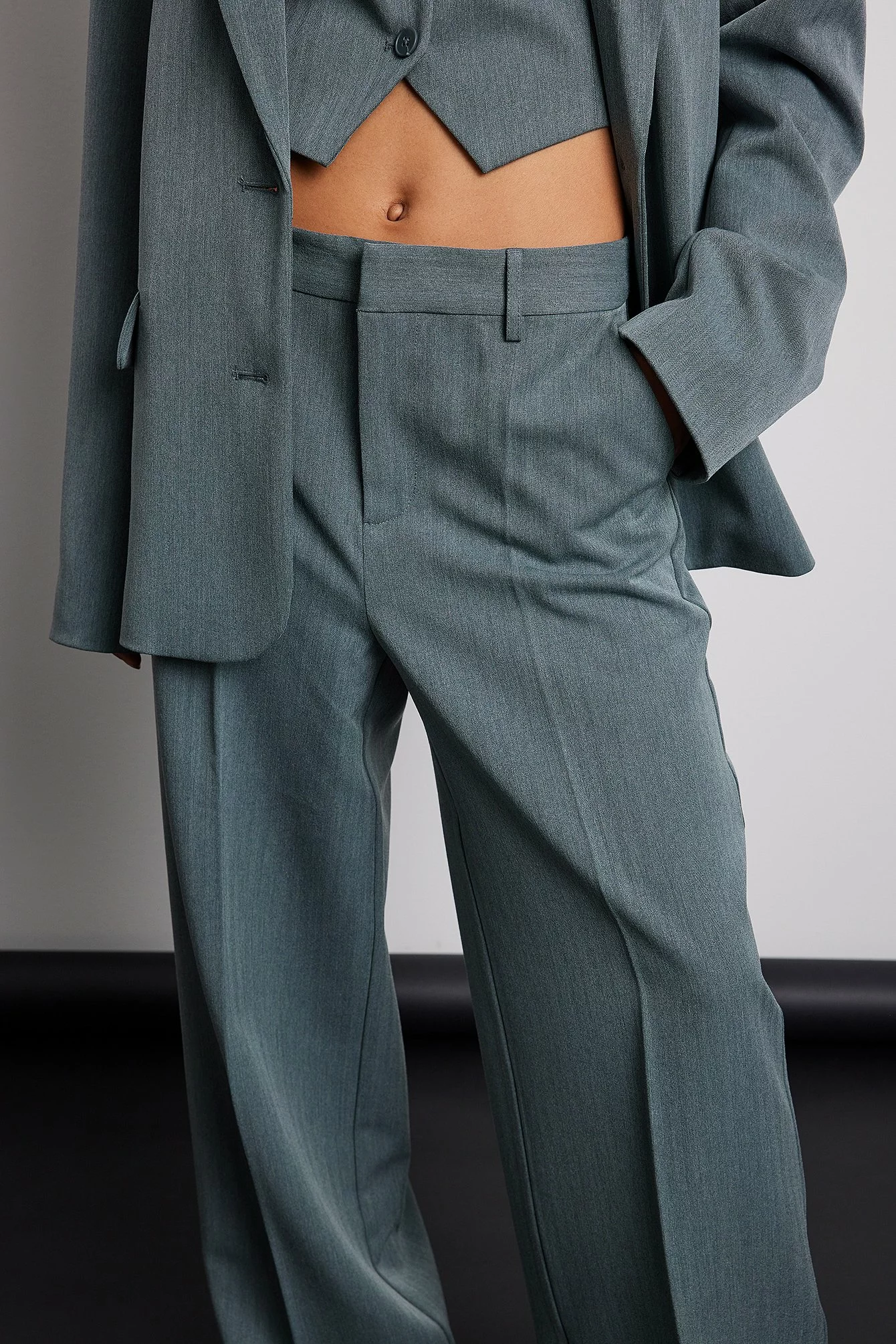 These trousers feature a mid rise fit, a zip and hook closure, open side pockets, two mock pockets at the back and a straight leg.