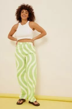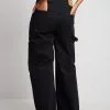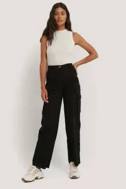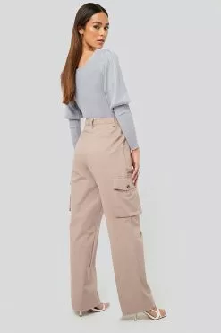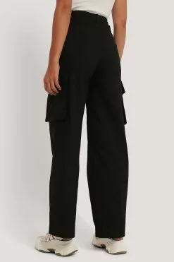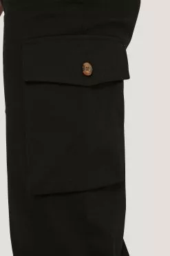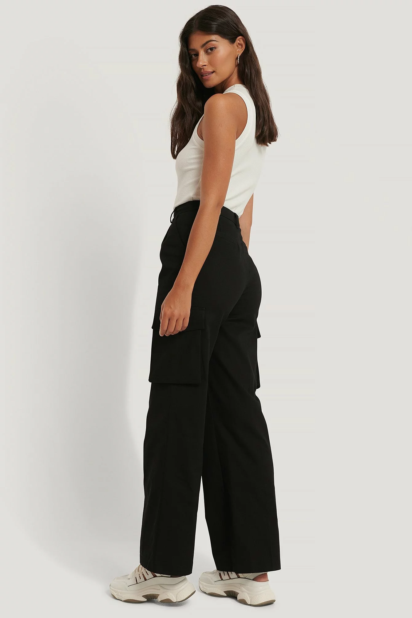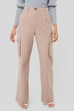 These pants feature a cargo design, a high waist fit, a zipper and button closure, two side pockets with a button closure, two back mock pockets and long wide legs.