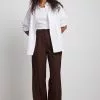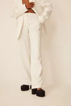 These trousers are shiny and feature a mid waist, a straight leg, a zipper and hook closure, side pockets and back mock pockets.