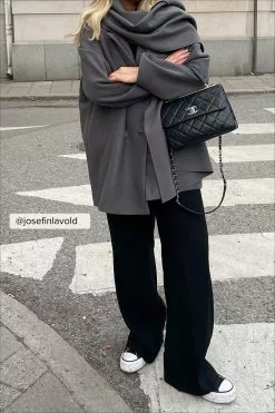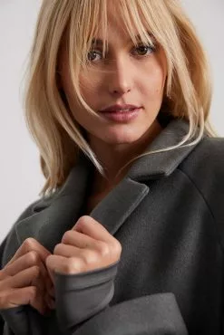 This coat features an oversized fit. It has a wide lapel neckline and a double-breasted button design. This coat features two side slanting pockets at the front and a fabric lining.
