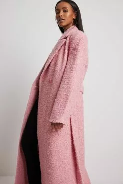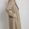 This coat features a lapel neckline, long sleeves with padded shoulders, a double button closure on the front, a waistband with a buckle detail and two side pockets.