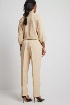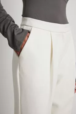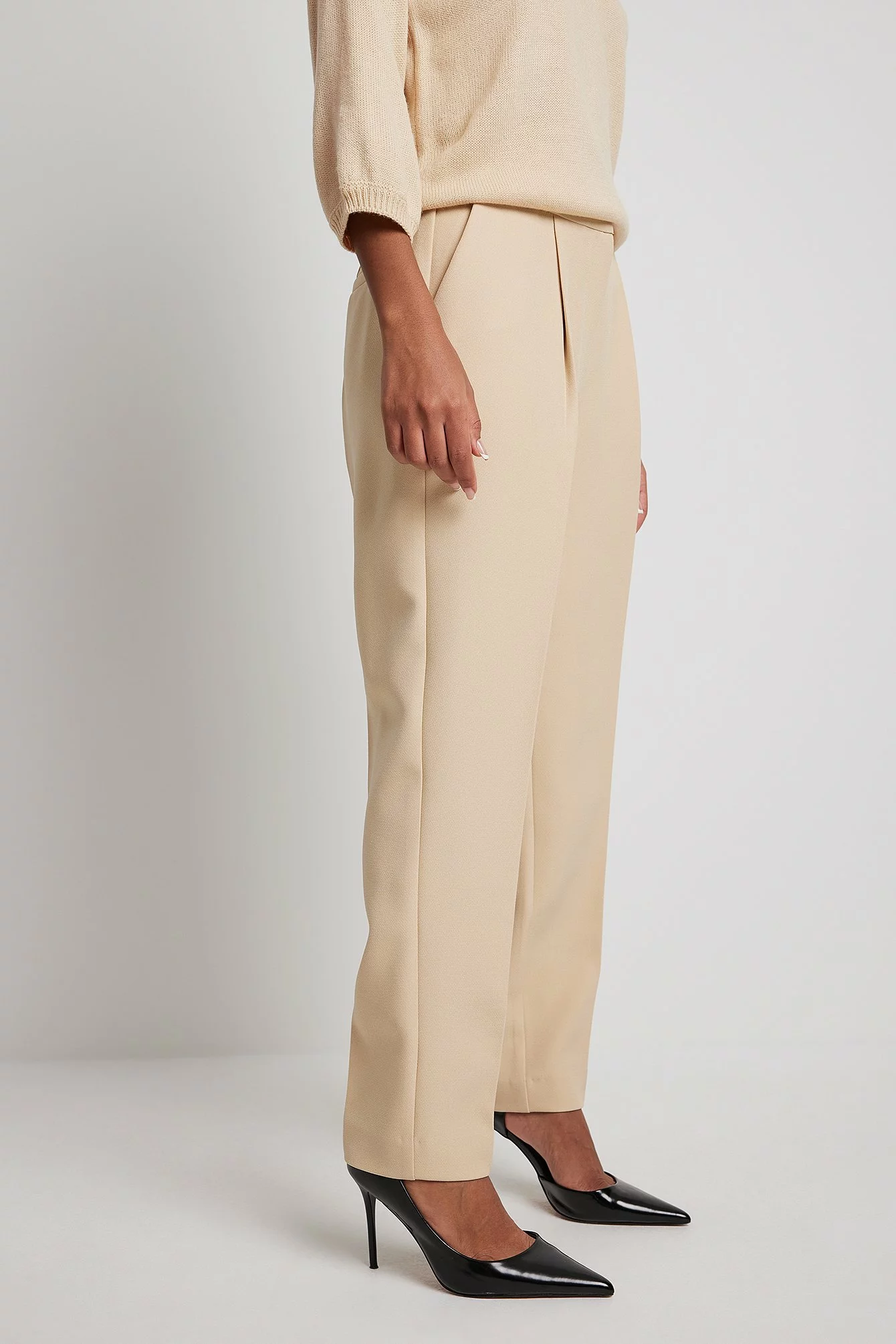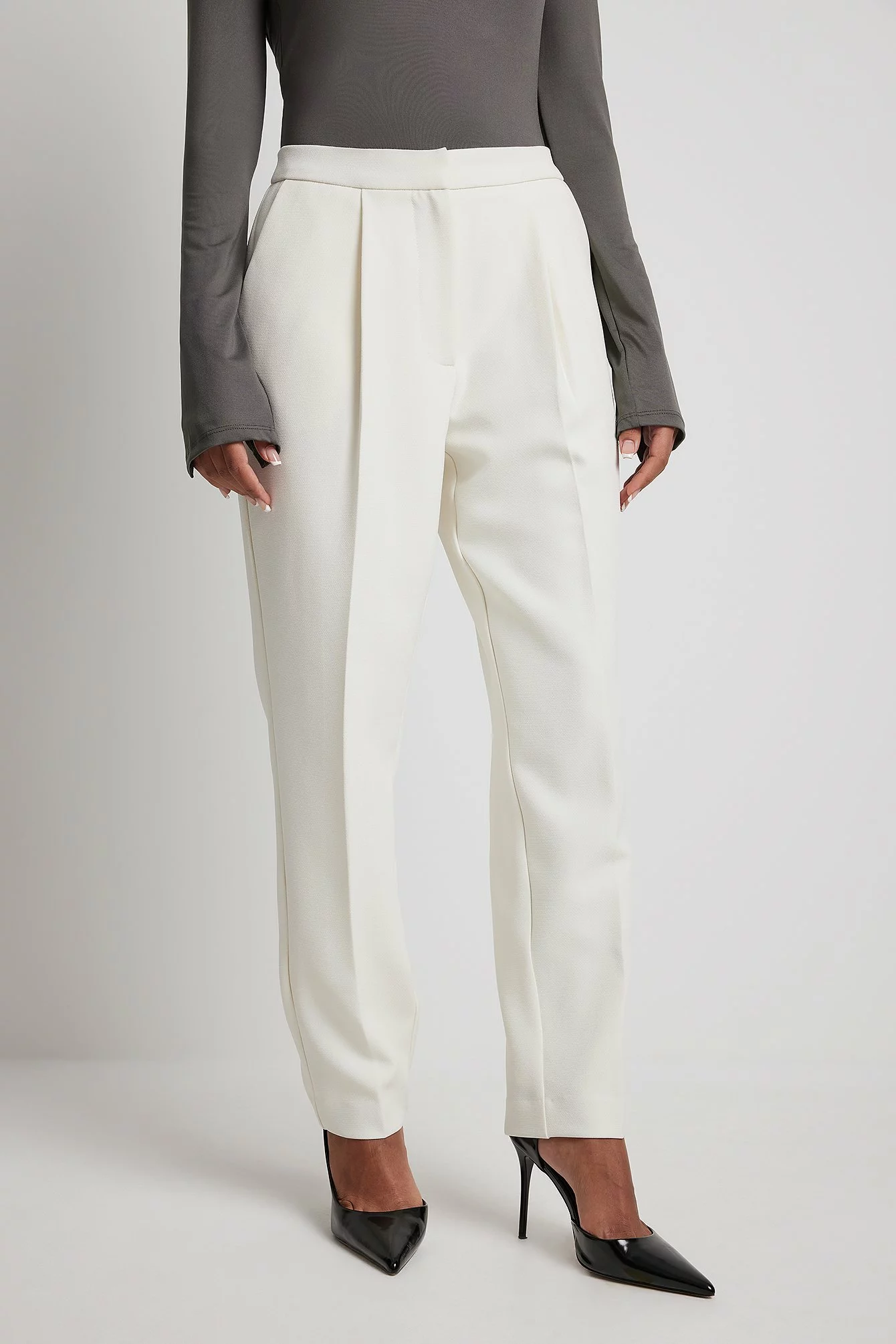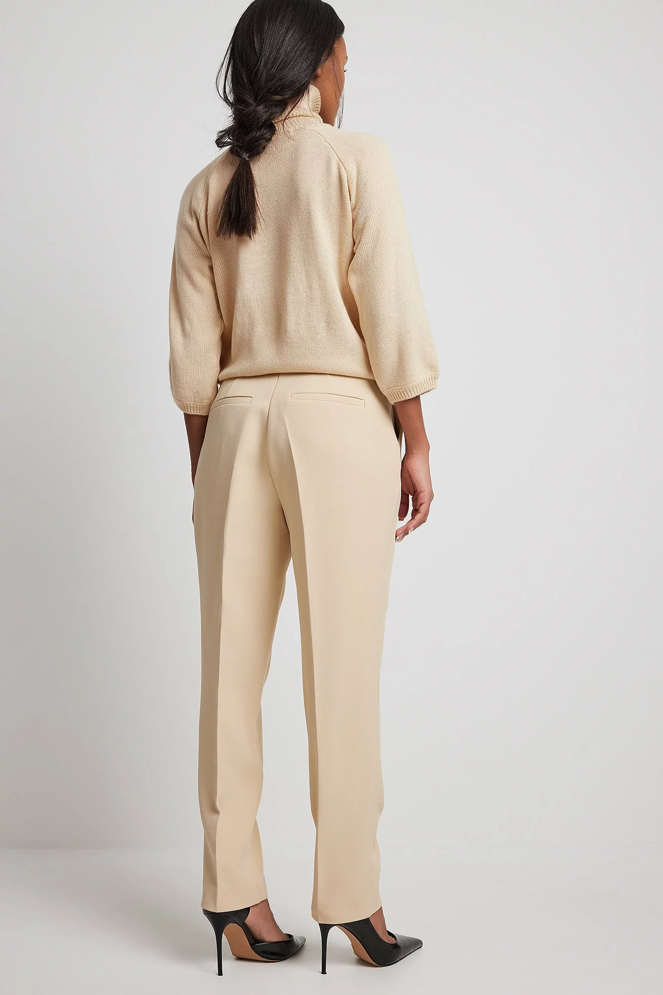 These trousers feature a tapered tailored fit, a zipper and hook closure, two side slanting pockets at the front and two back mock pockets.