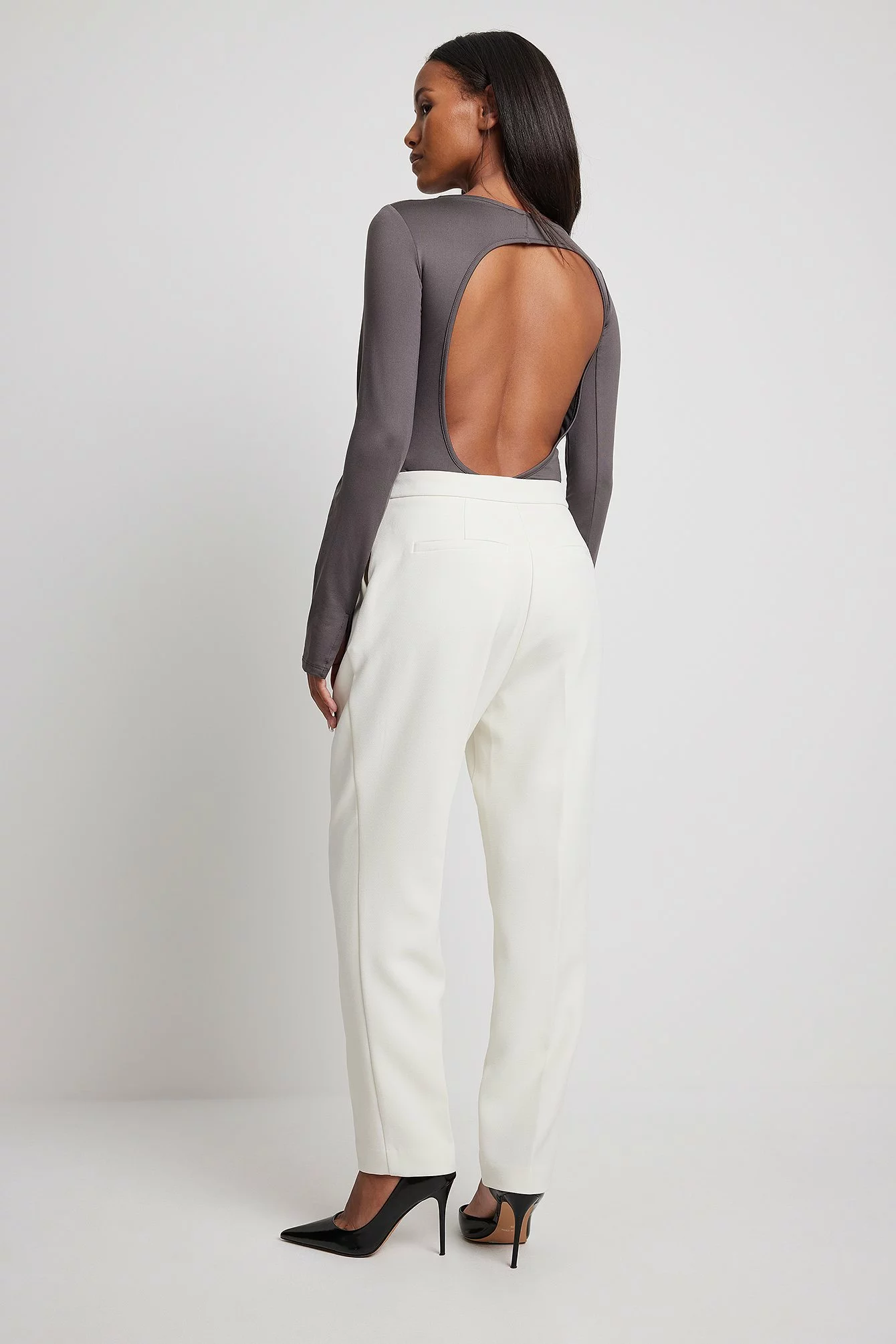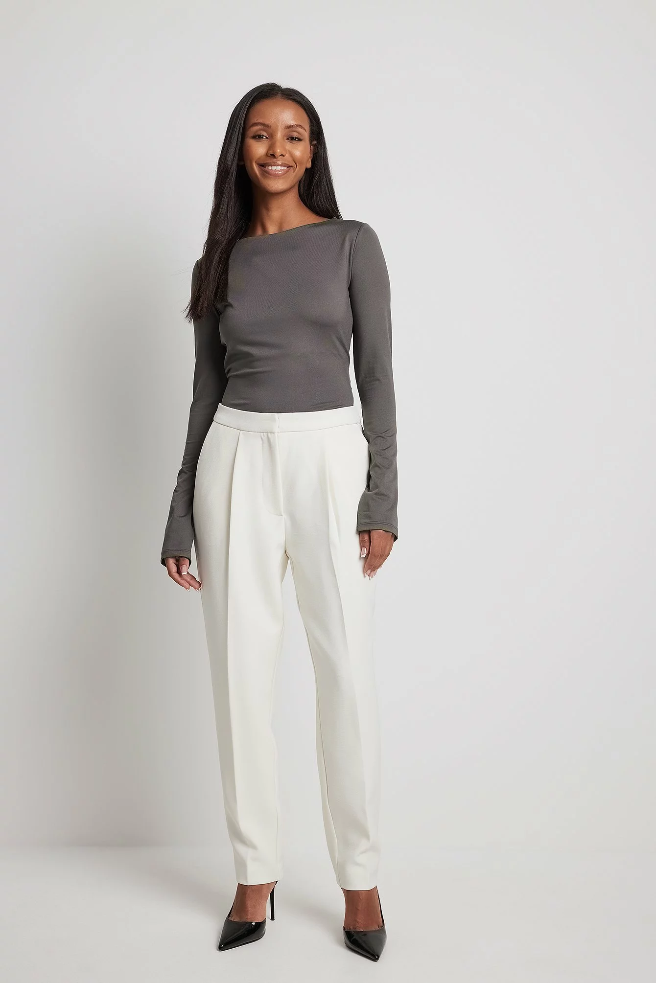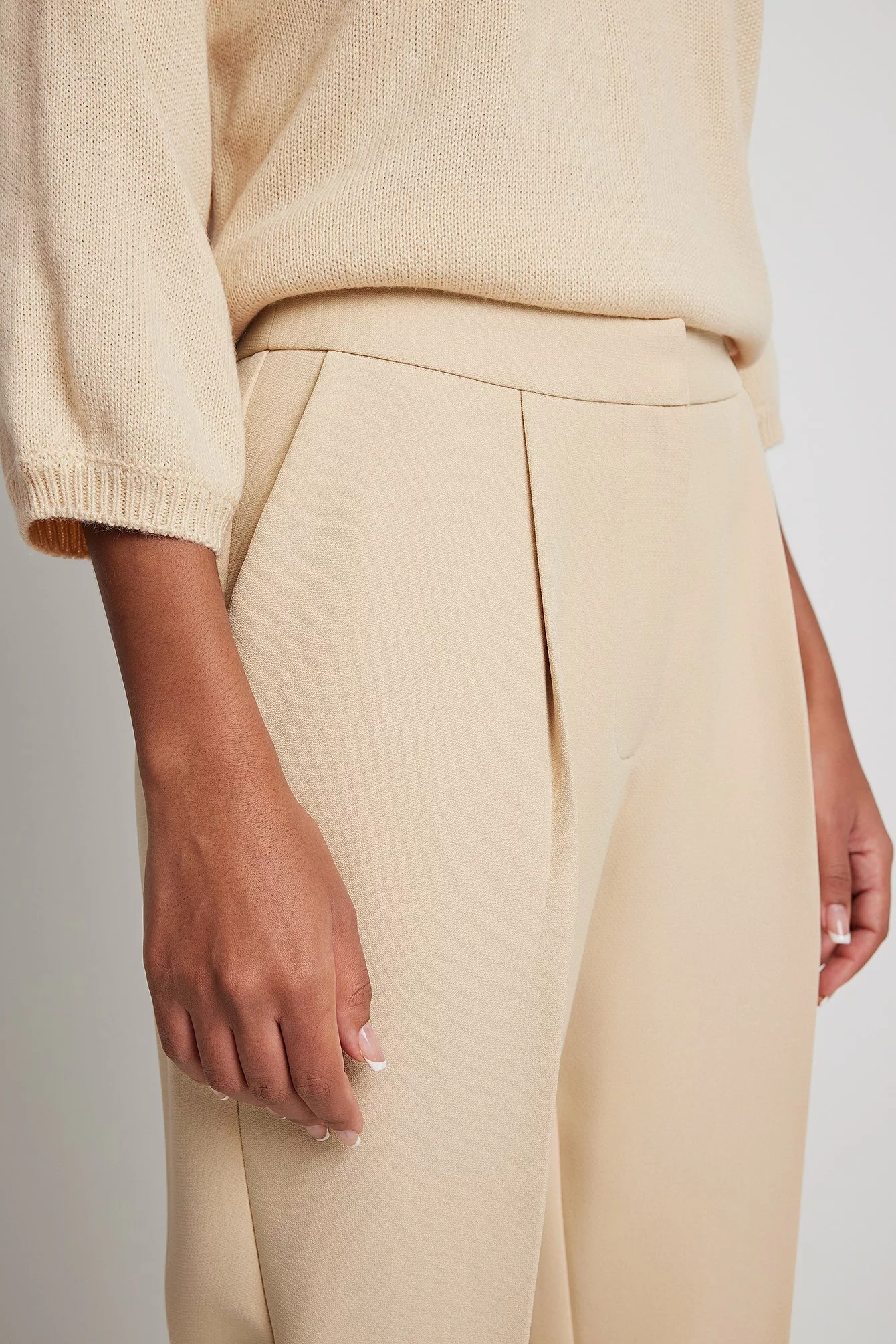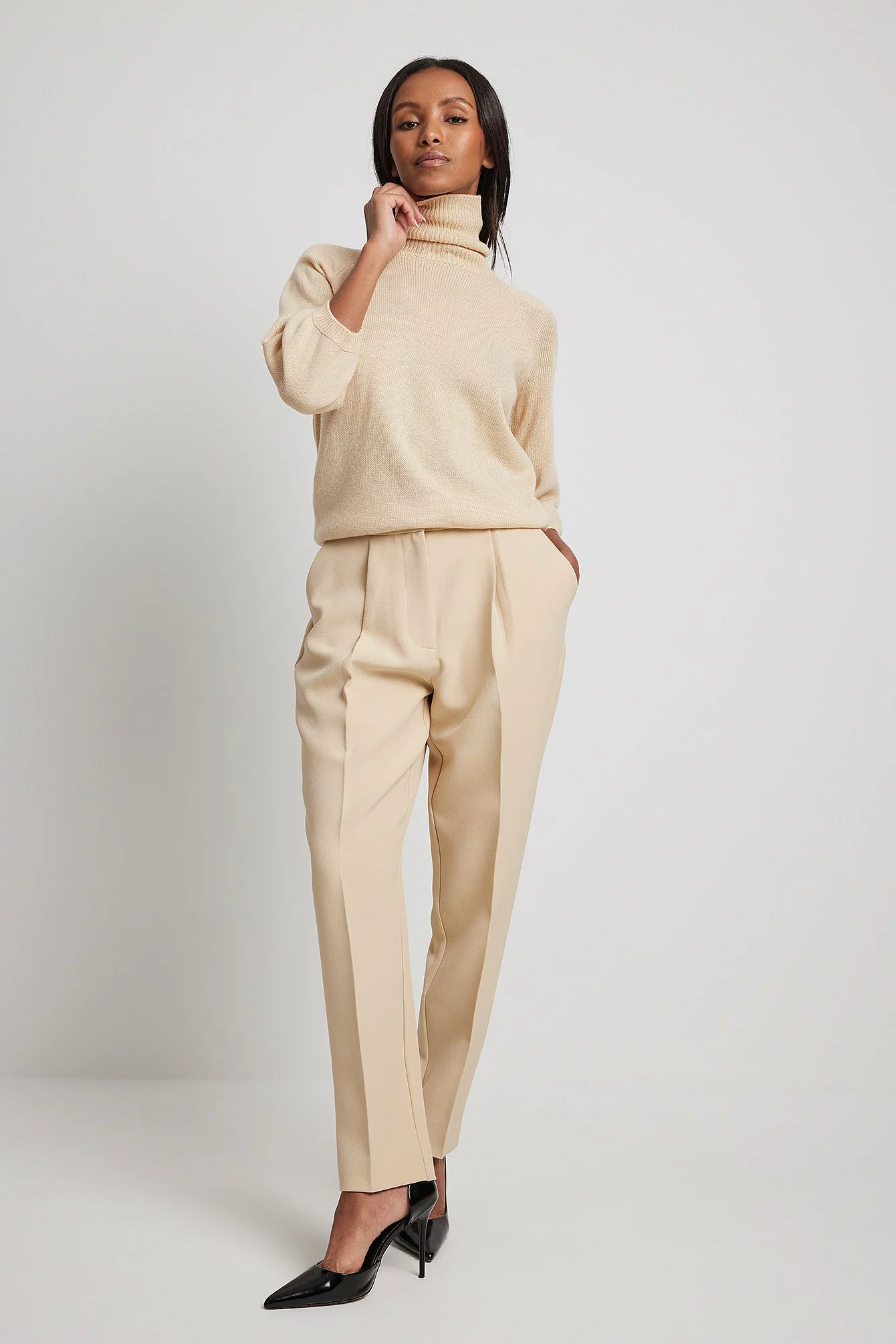 These trousers feature a tapered tailored fit, a zipper and hook closure, two side slanting pockets at the front and two back mock pockets.