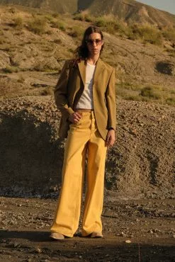These 5-pocket jeans feature a mid waist. They have contrast-colored stitchings and wide legs.
