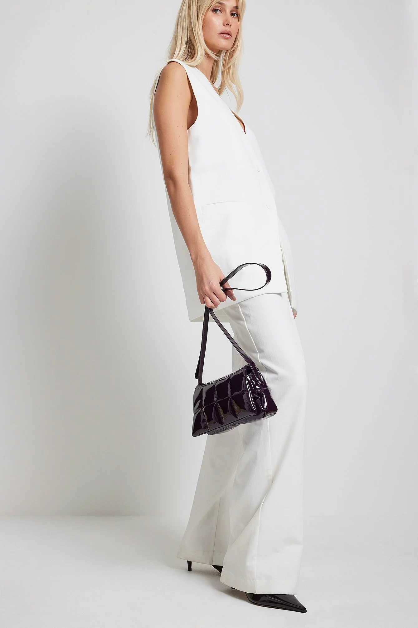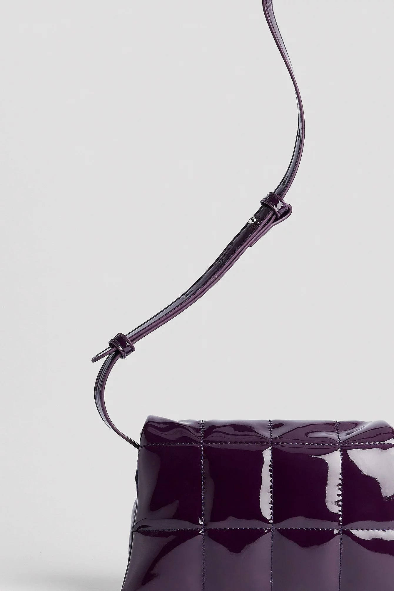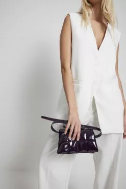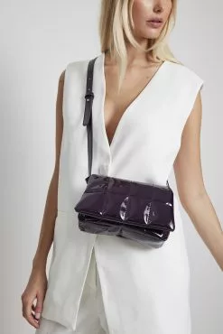 This bag is quilted and glossy and features a flap detail, a magnetic closure and a main compartment with a zipper closure and 2 inner pockets. Measurements: Height: 14 cm / 5.5 in. Width: 6 cm / 2.4 in. Length: 19 cm / 7.5 in. Strap length: Adjustable between 90 cm / 35.3 in and 103 cm / 40.5 in.