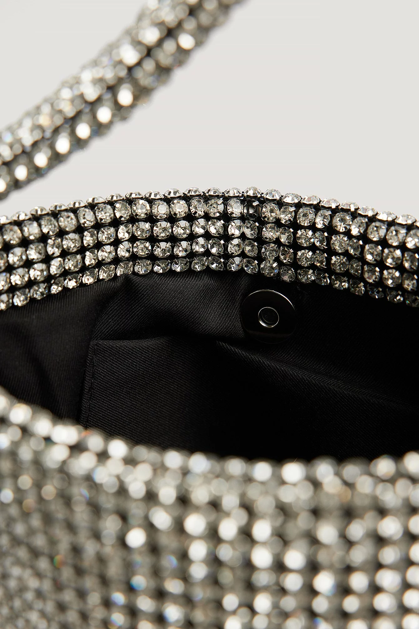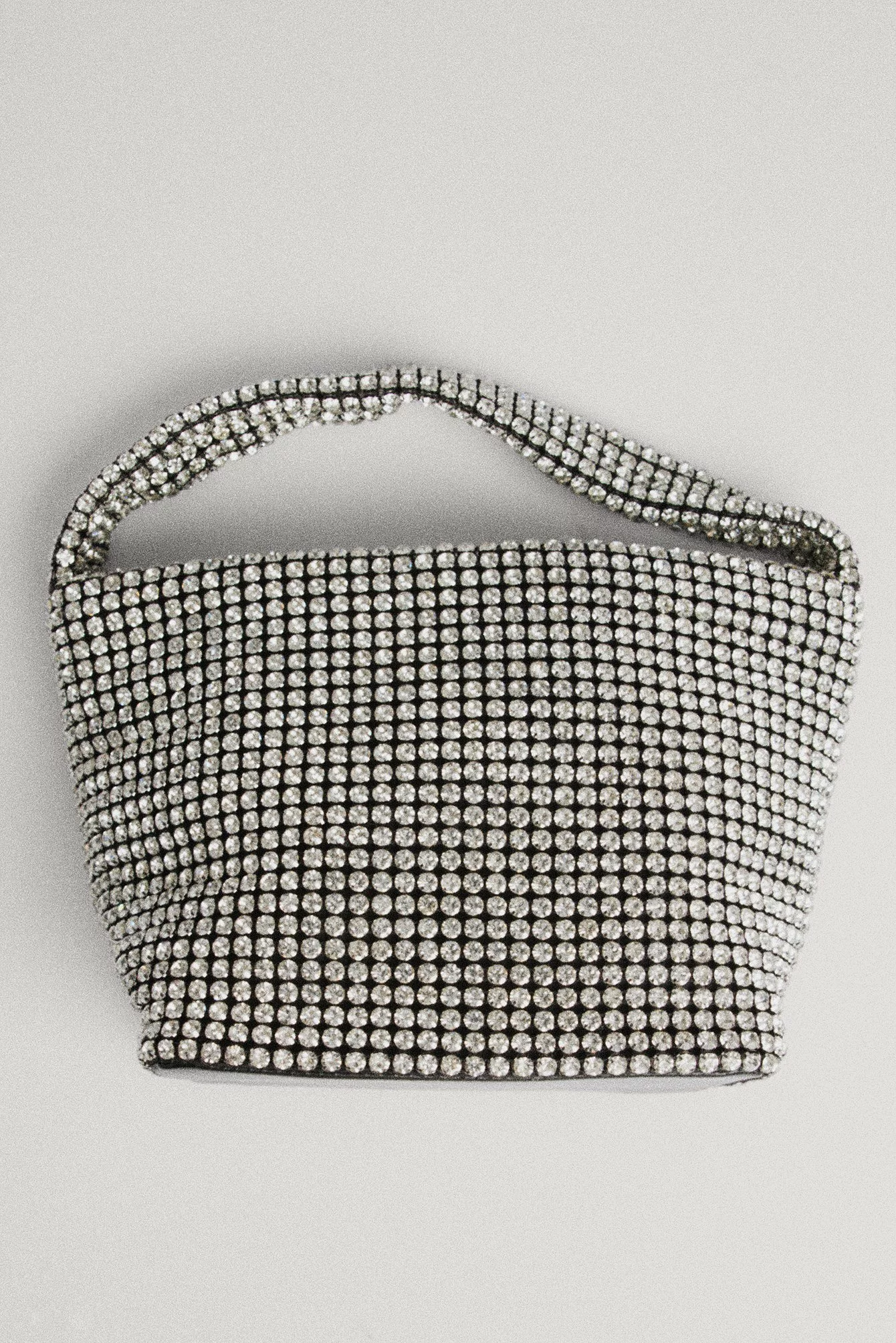 This bag features a bucket design. It has rhinestone embellishments along the item and a non removable, short handle. This bag features a magnetic closure and an inner pocket. Measurements: Height: 15 cm / 5.9 in. Width: 11 cm / 4.2 in. Length: 16,5 cm / 6.5 in. Strap length: 30 cm / 11.8 in.
