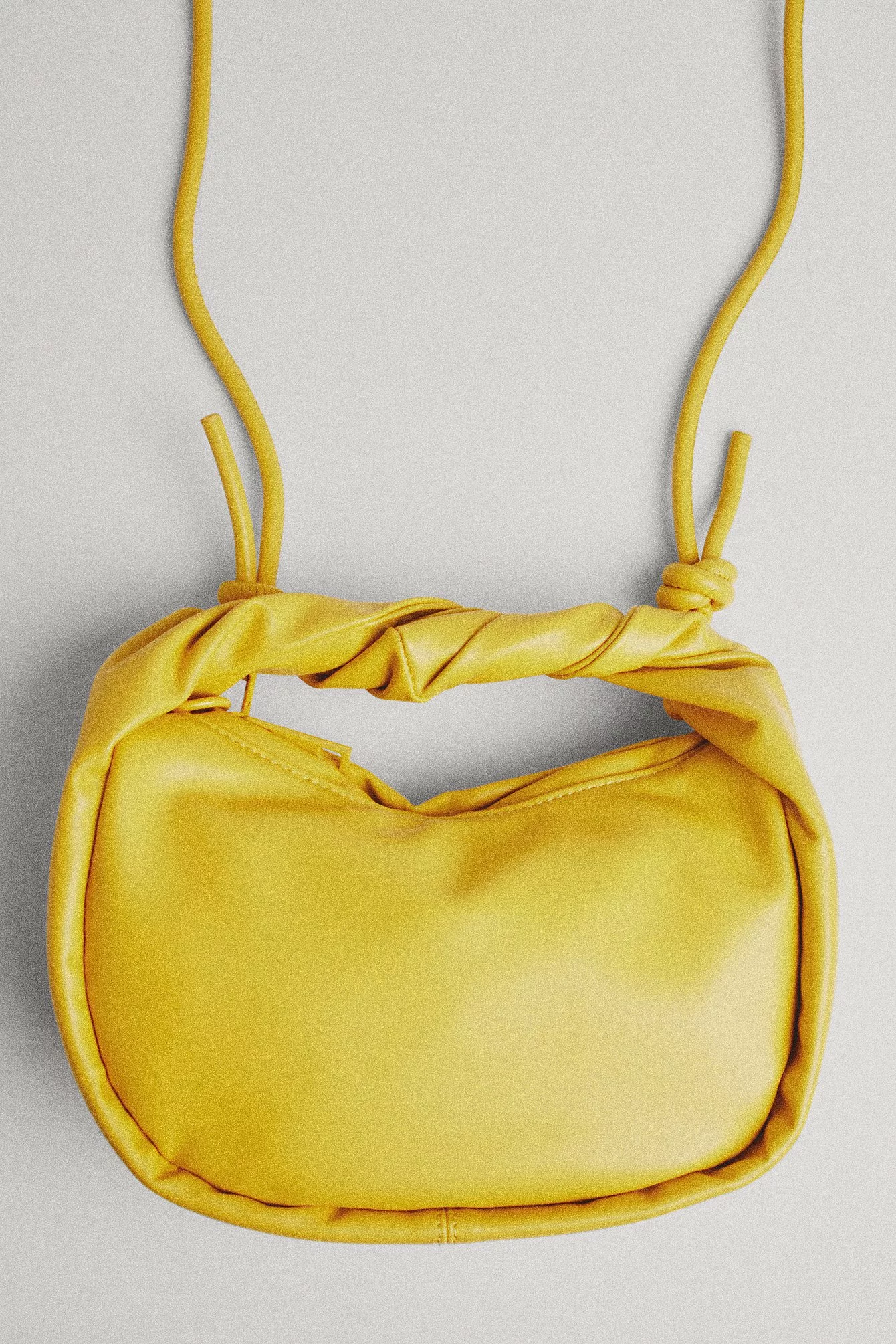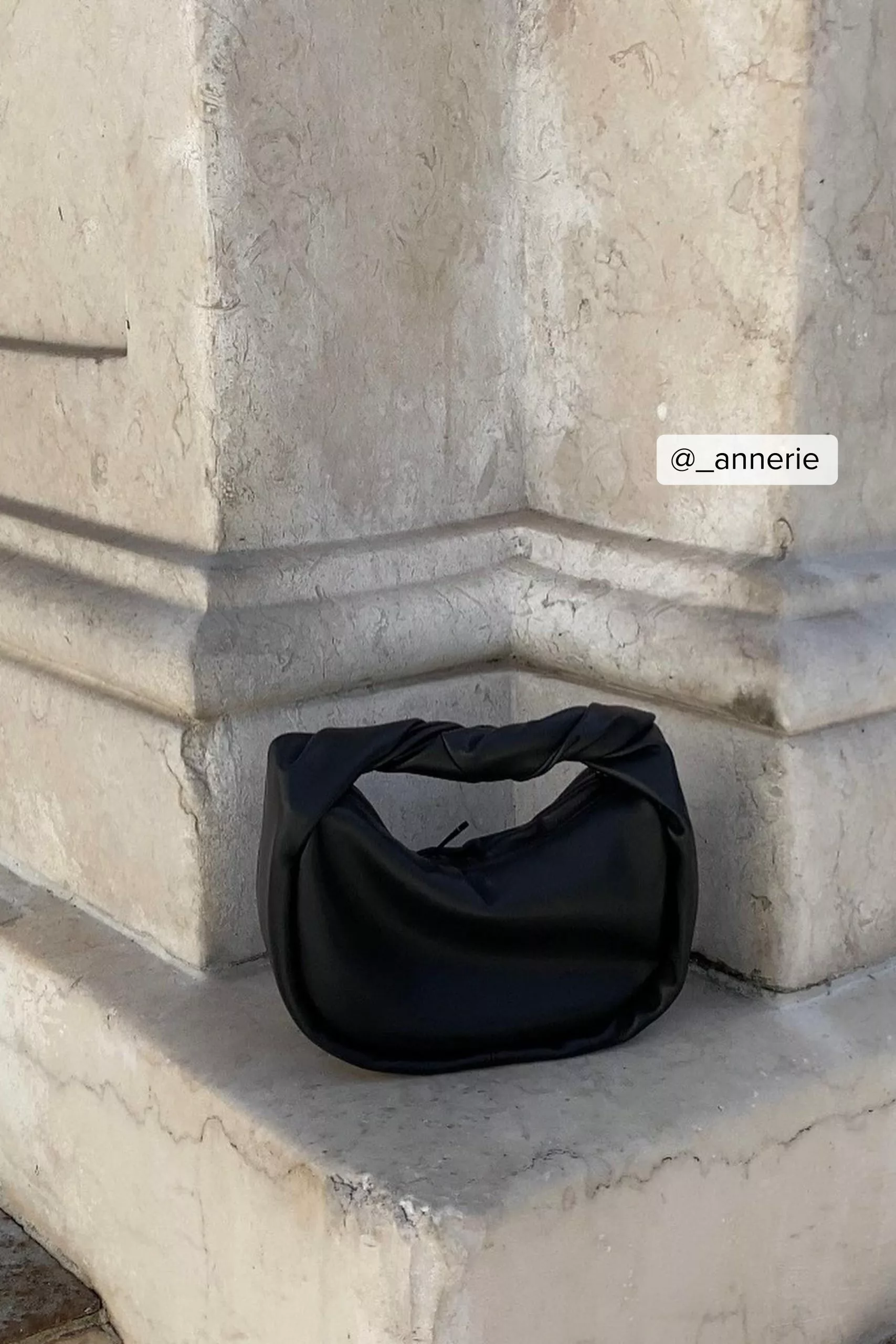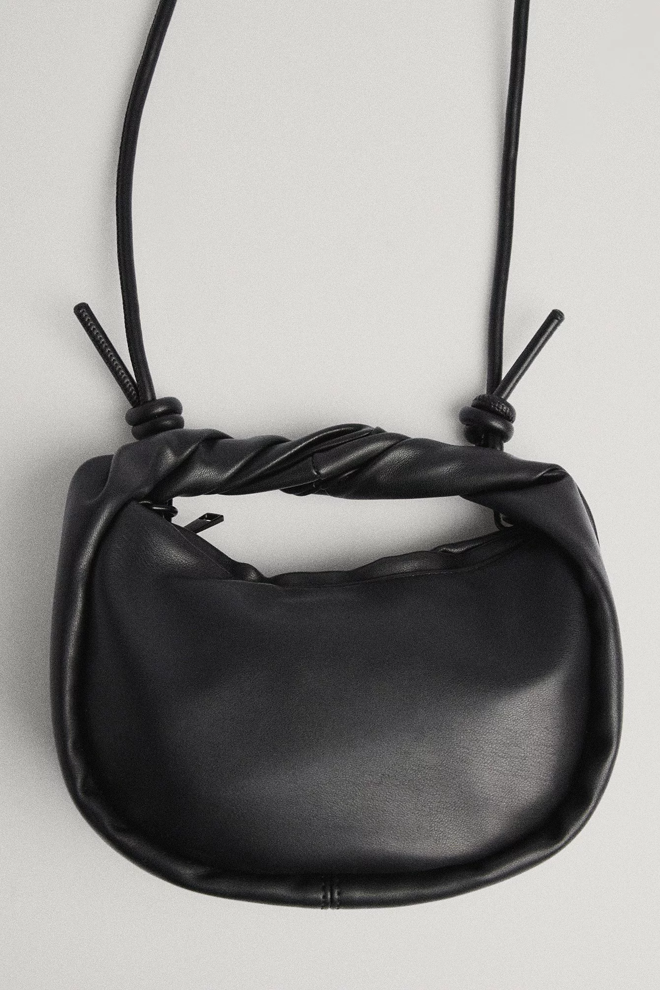 This handbag features a mini size. It has 1 non removable handle with a twist detail and 1 non adjustable, removable shoulder strap. This handbag features a compartment with a zipper closure and 2 inner pockets. Measurements: Height: 12 cm / 4.8 in. Width: 7 cm / 2.8 in. Length: 19 cm / 7.5 in. Strap length: 19 cm / 7.5 in. Measurements: Height: 12 cm / 4.8 in. Width: 7 cm / 2.8 in. Length: 19 cm / 7.5 in. Strap length: 118 cm / 46.4 in.