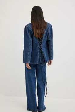 This blazer features denim material. It has a straight fit and a mock pocket on the chest. This blazer features front flap pockets and a lacing detail on the back.