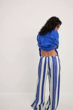 These pants feature a printed design. They have a high waist fit and a straight leg. These pants feature an elasticized waist with a self tie detail and side slant pockets.