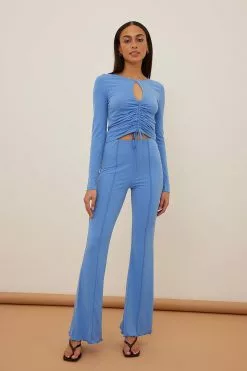 These pants feature visible seams along the front, a babylock design and an elasticized waistband.