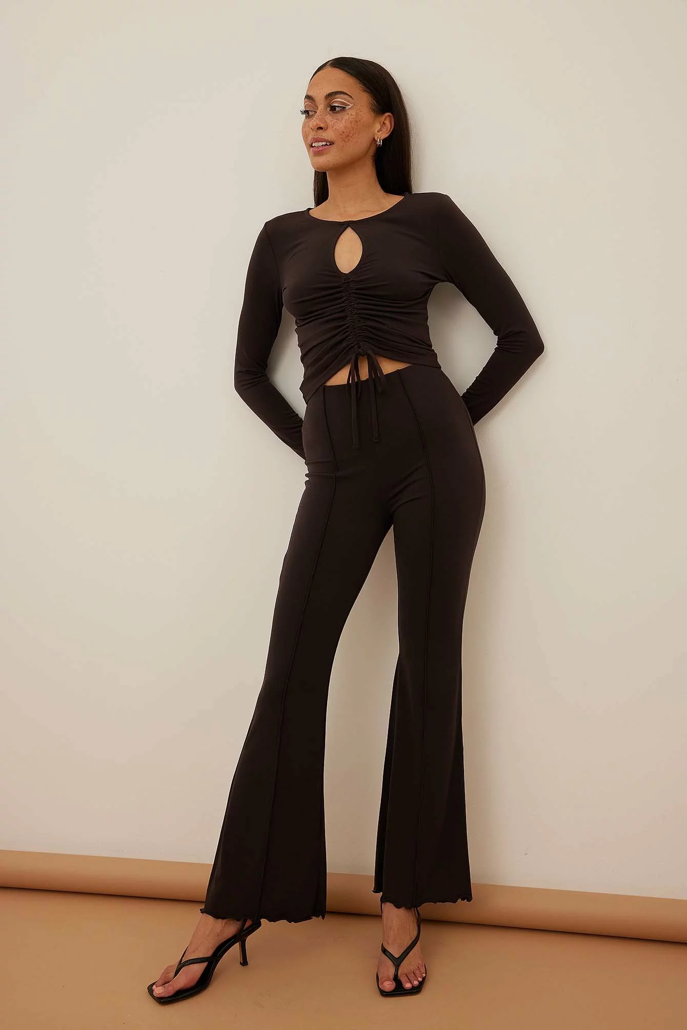 These pants feature visible seams along the front, a babylock design and an elasticized waistband.