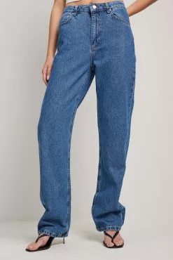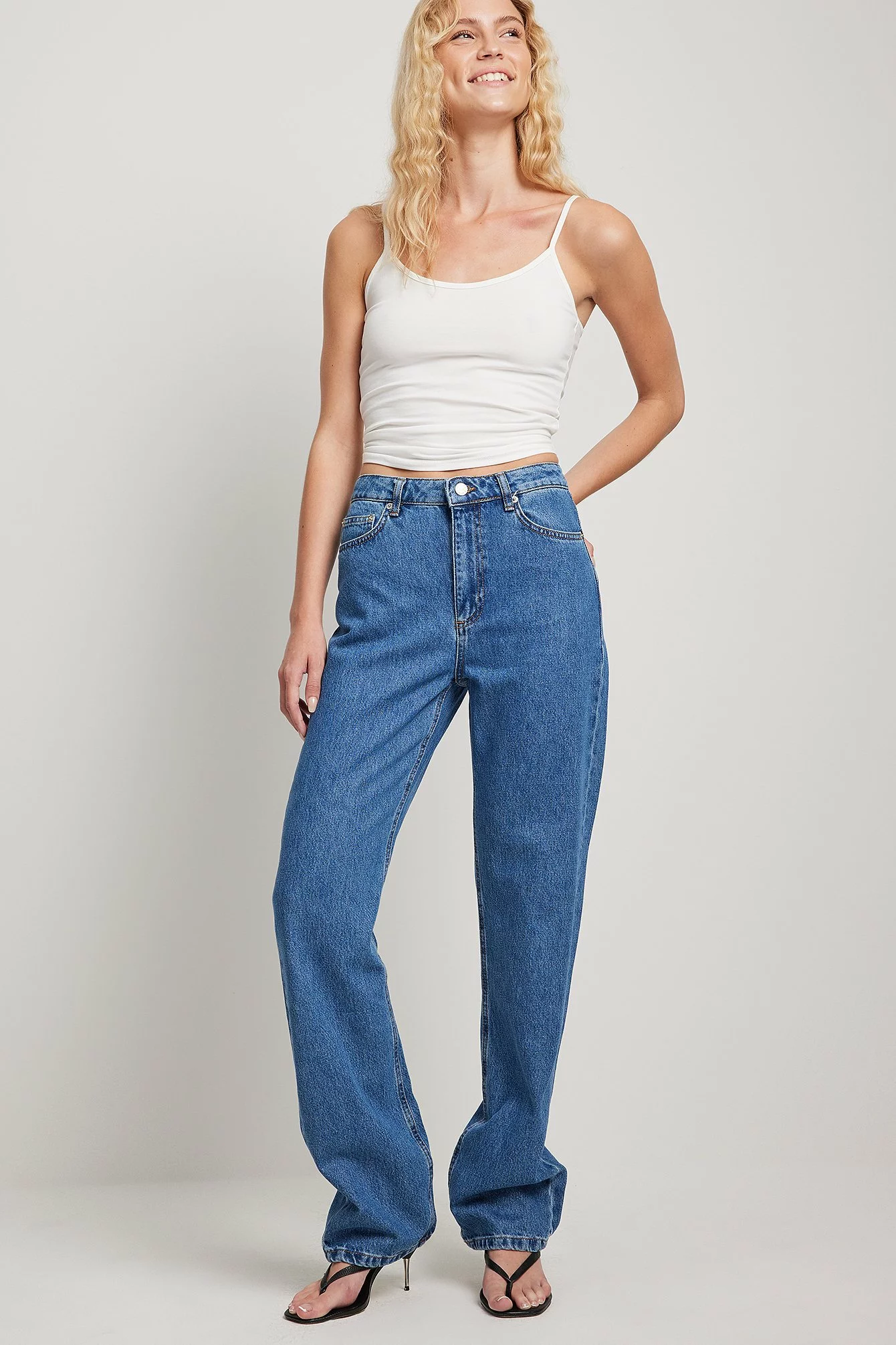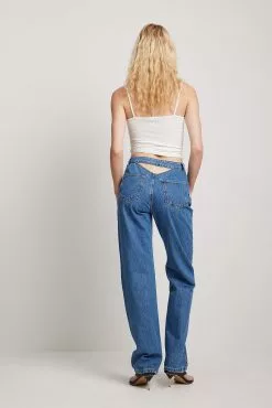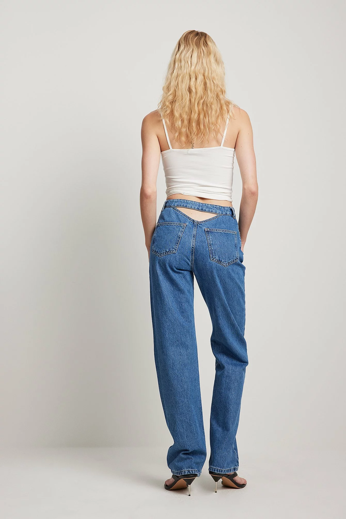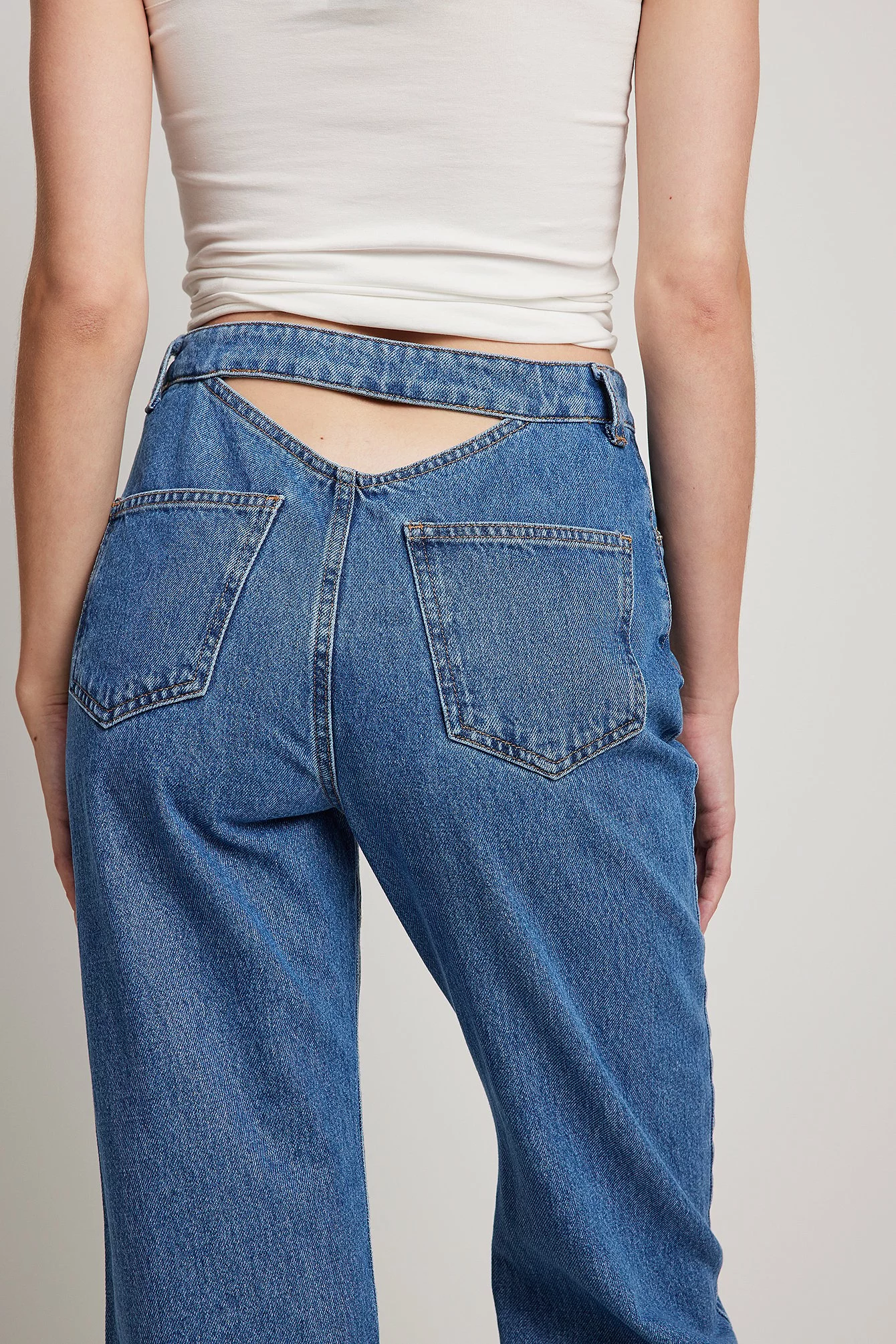 These jeans are made of denim and feature a high waist, a cut out detail at the back and a straight leg.