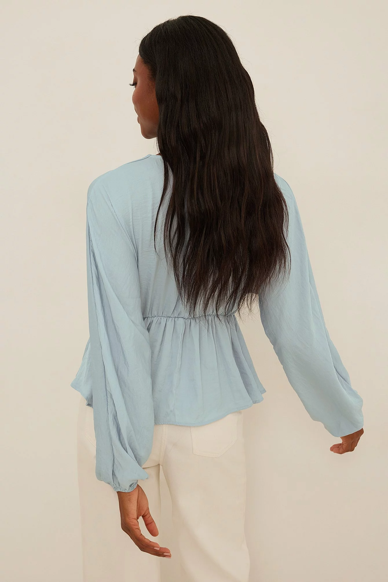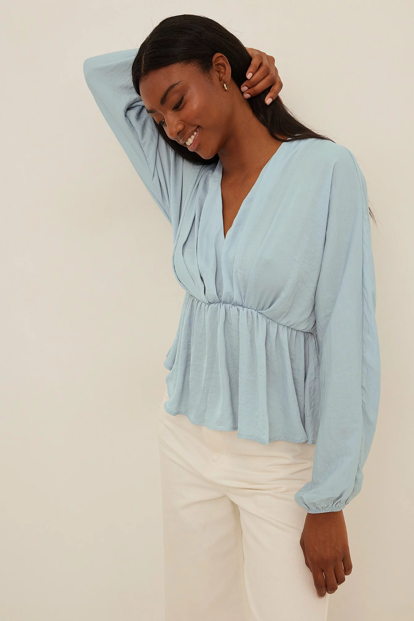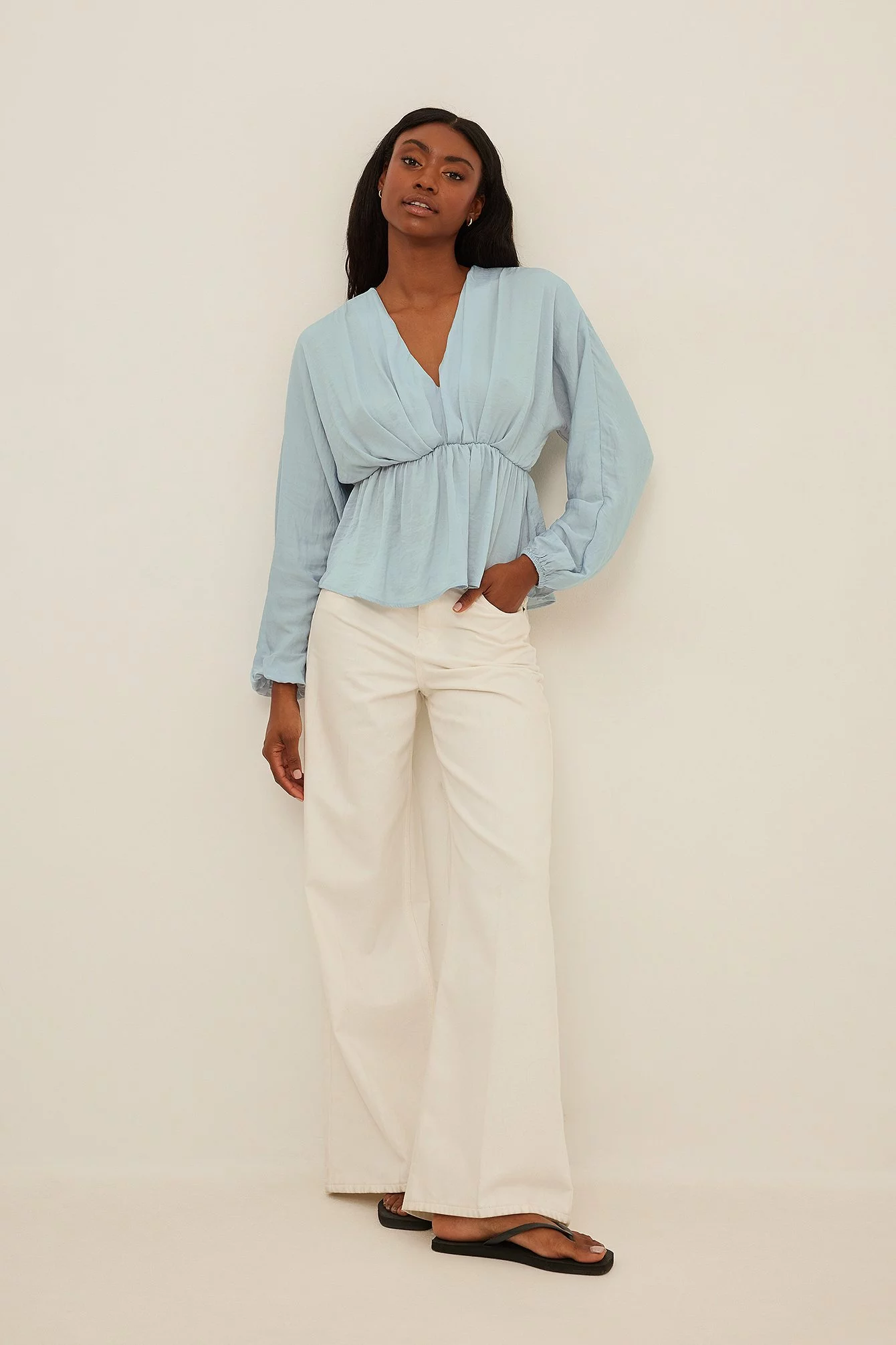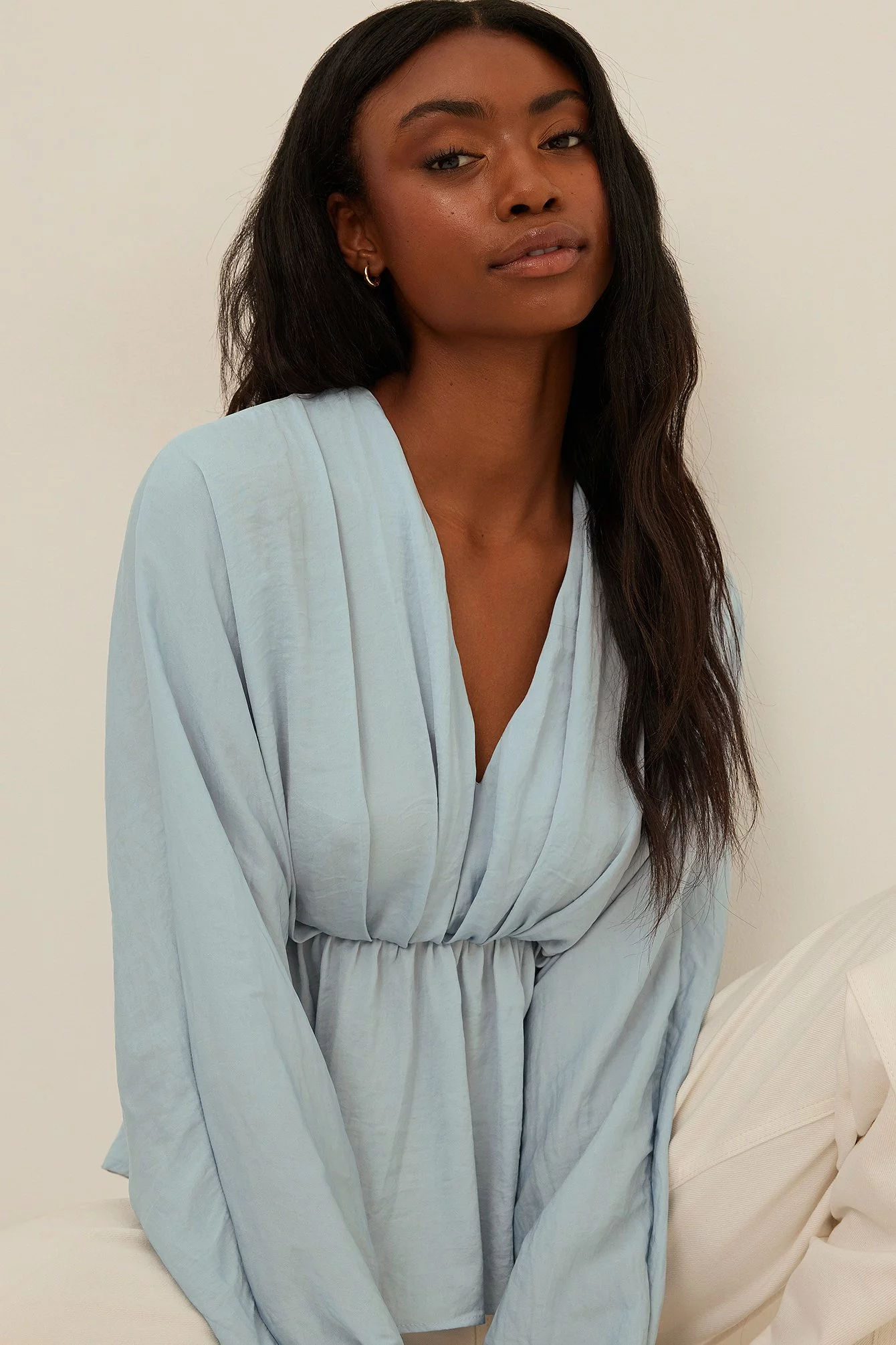 This blouse features a v-neck cut, long, flowy batwing sleeves with elasticized cuffs and a ruched, elasticized waistband with a flowy bottom half.