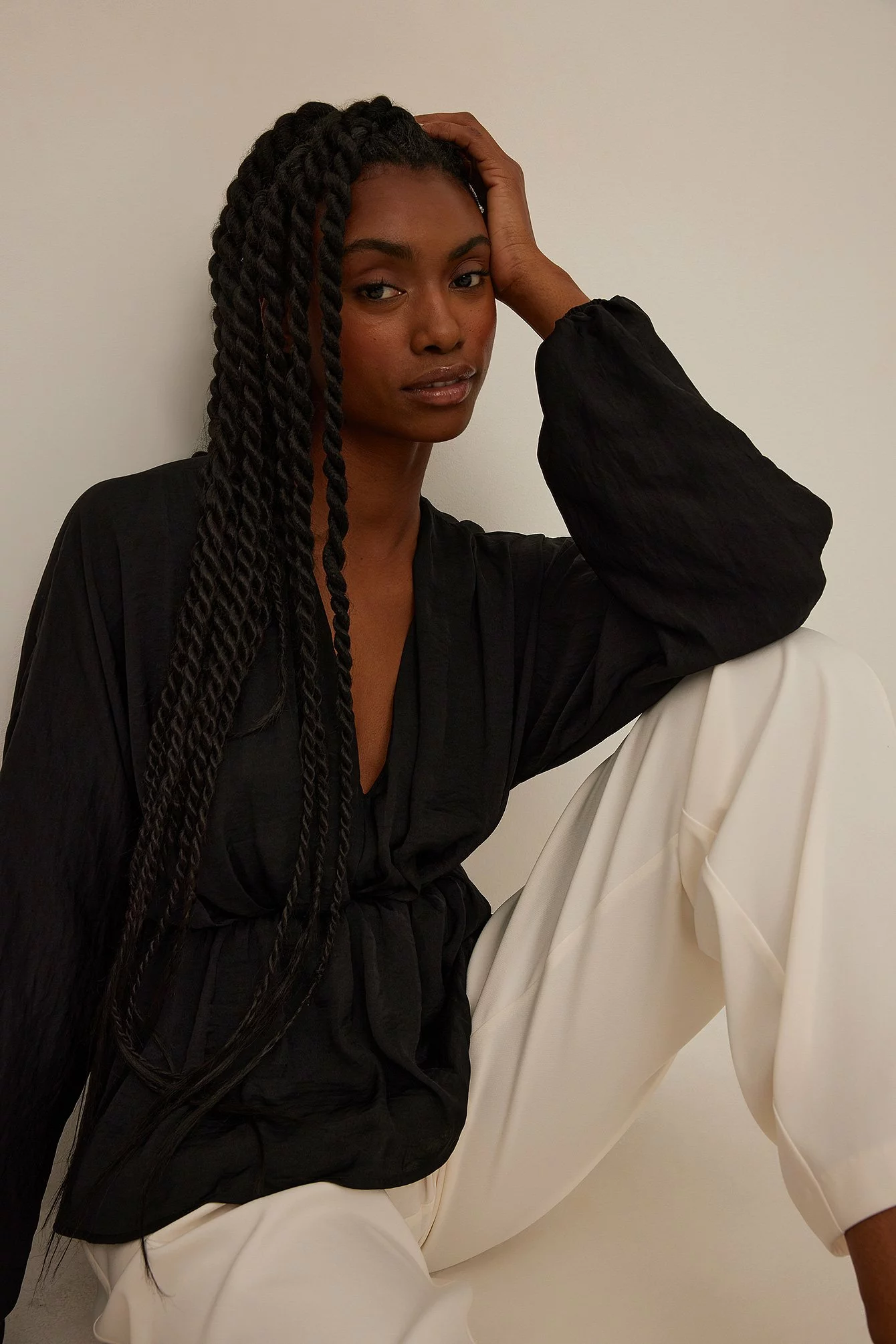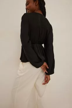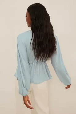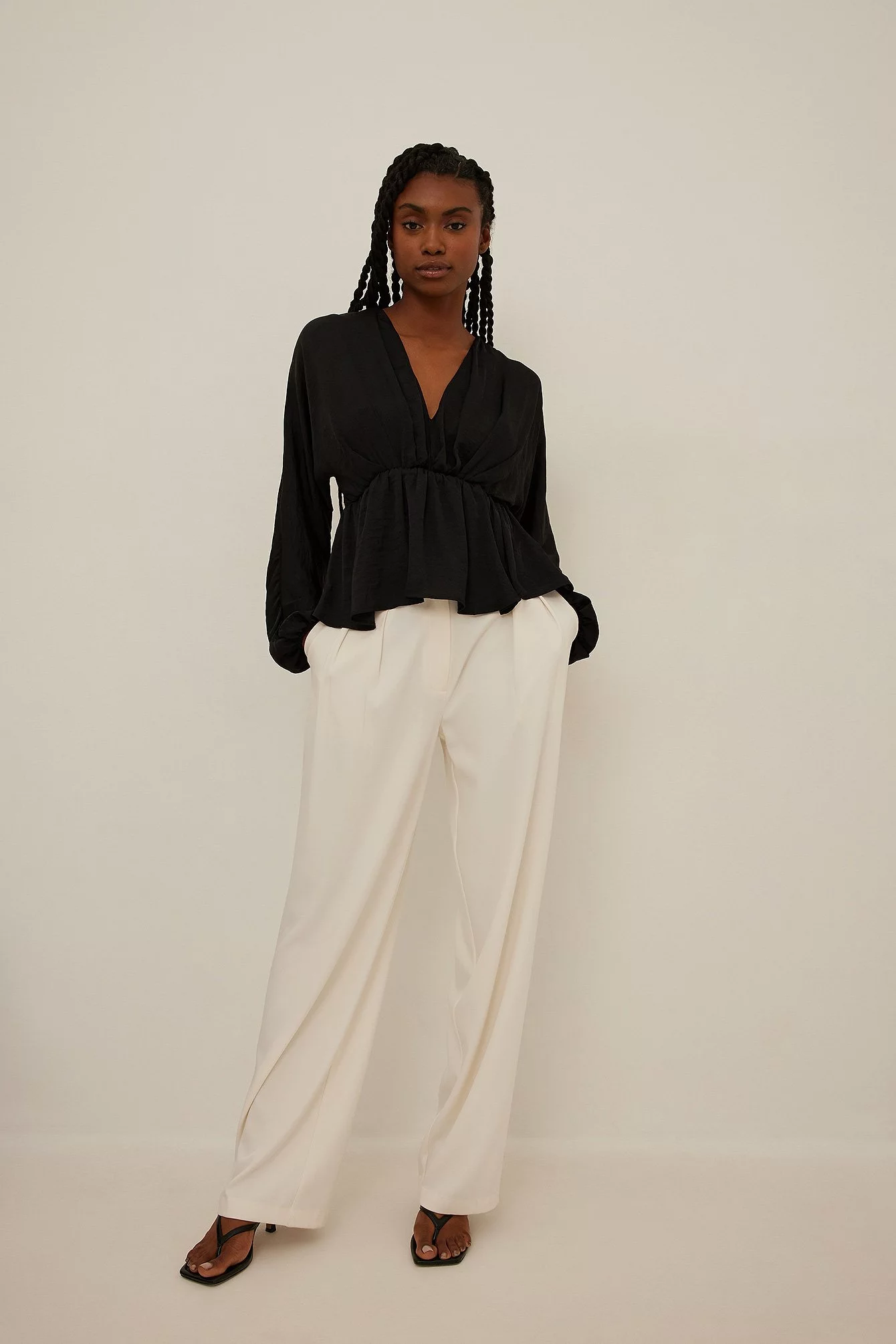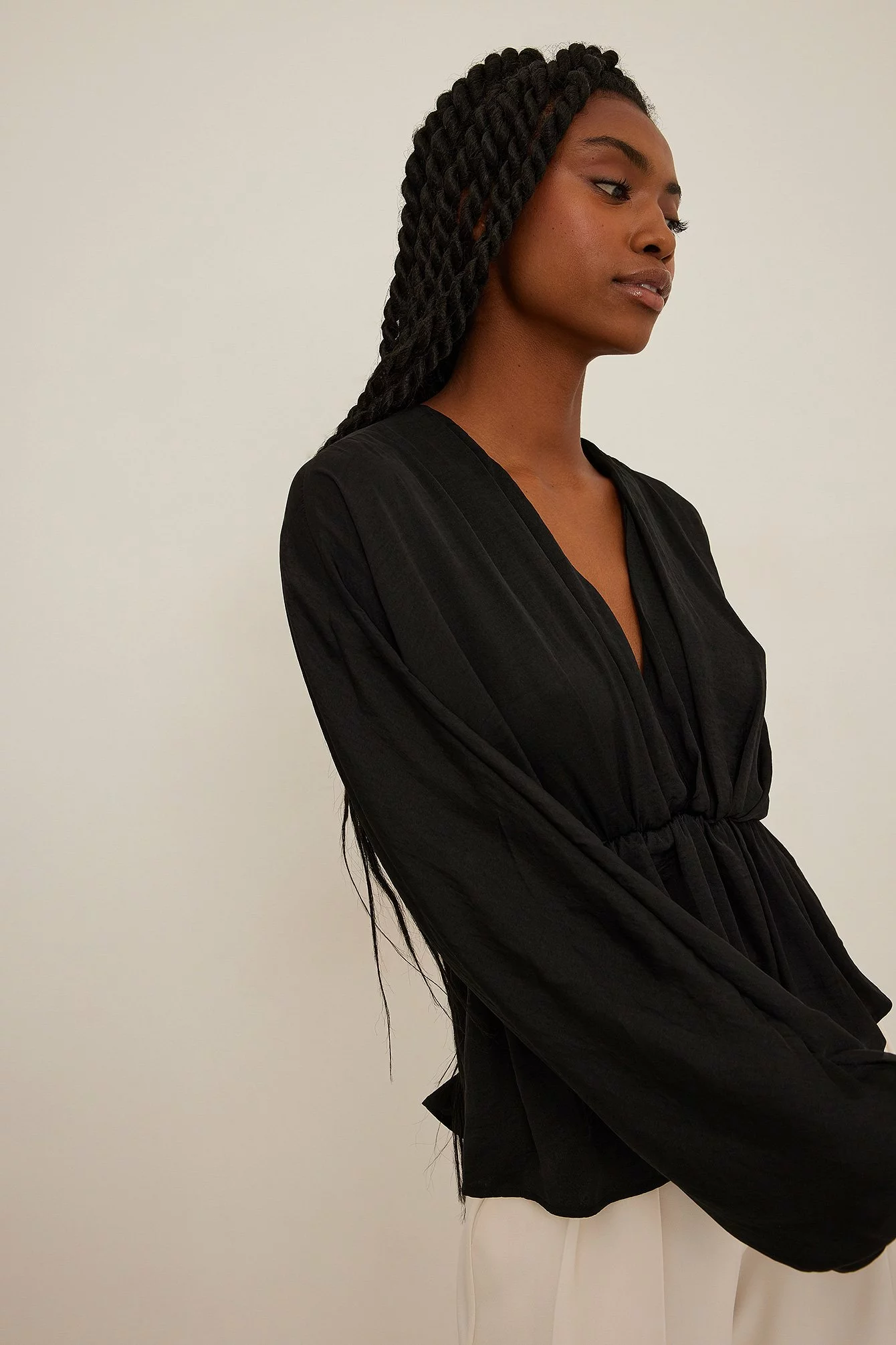 This blouse features a v-neck cut, long, flowy batwing sleeves with elasticized cuffs and a ruched, elasticized waistband with a flowy bottom half.