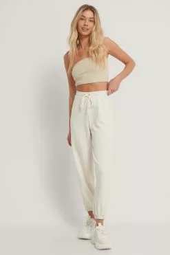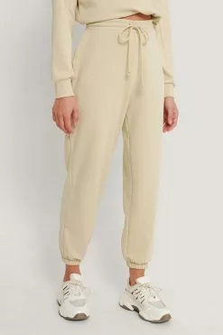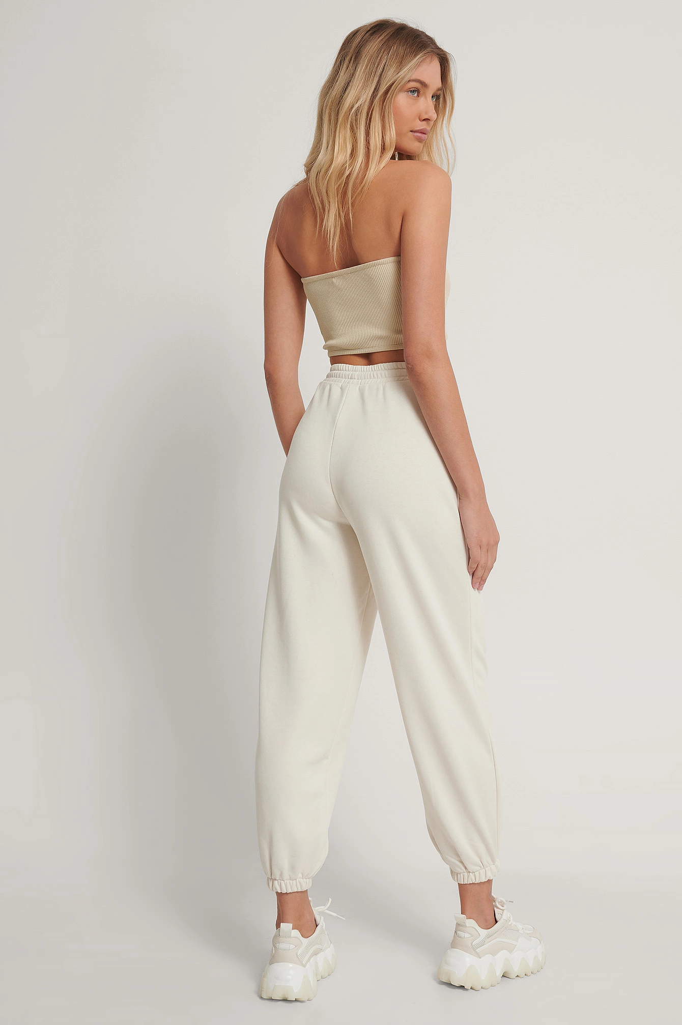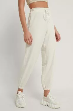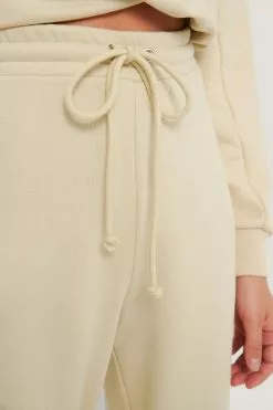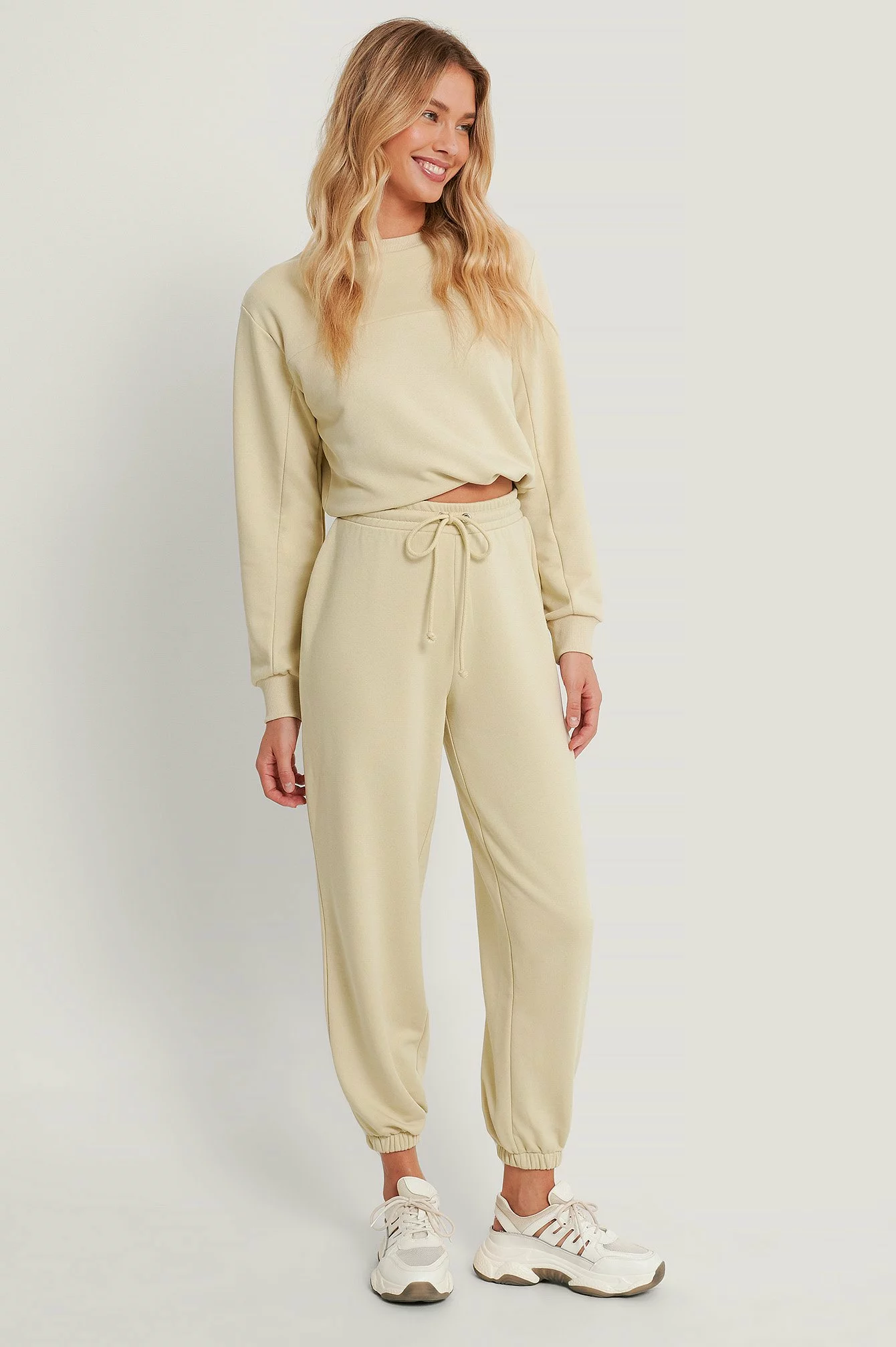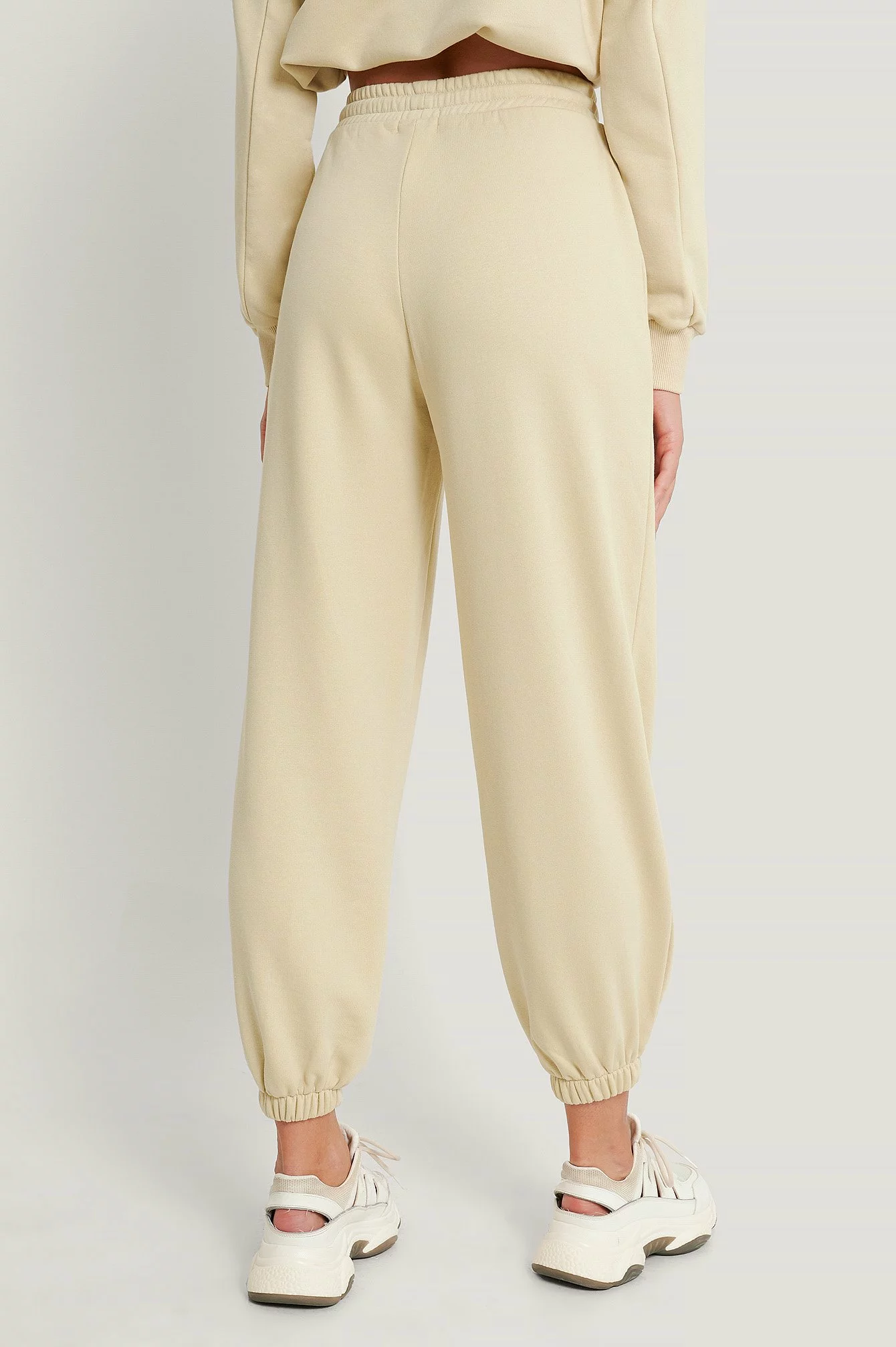 These sweatpants feature an elasticized high waist with an adjustable drawstring detail. They have cropped length with elasticized hems and a soft material on the outside. These sweatpants feature a relaxed fit.