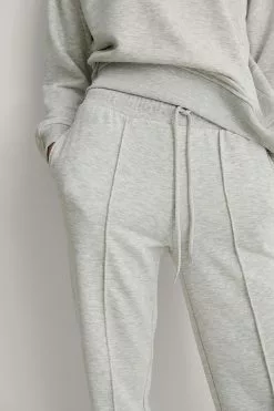 This sweatpant features a high waist with an elasticized waistline. They have a drawstring and two side slanting pockets. This sweatpant features seam details along the front and straight legs.