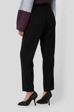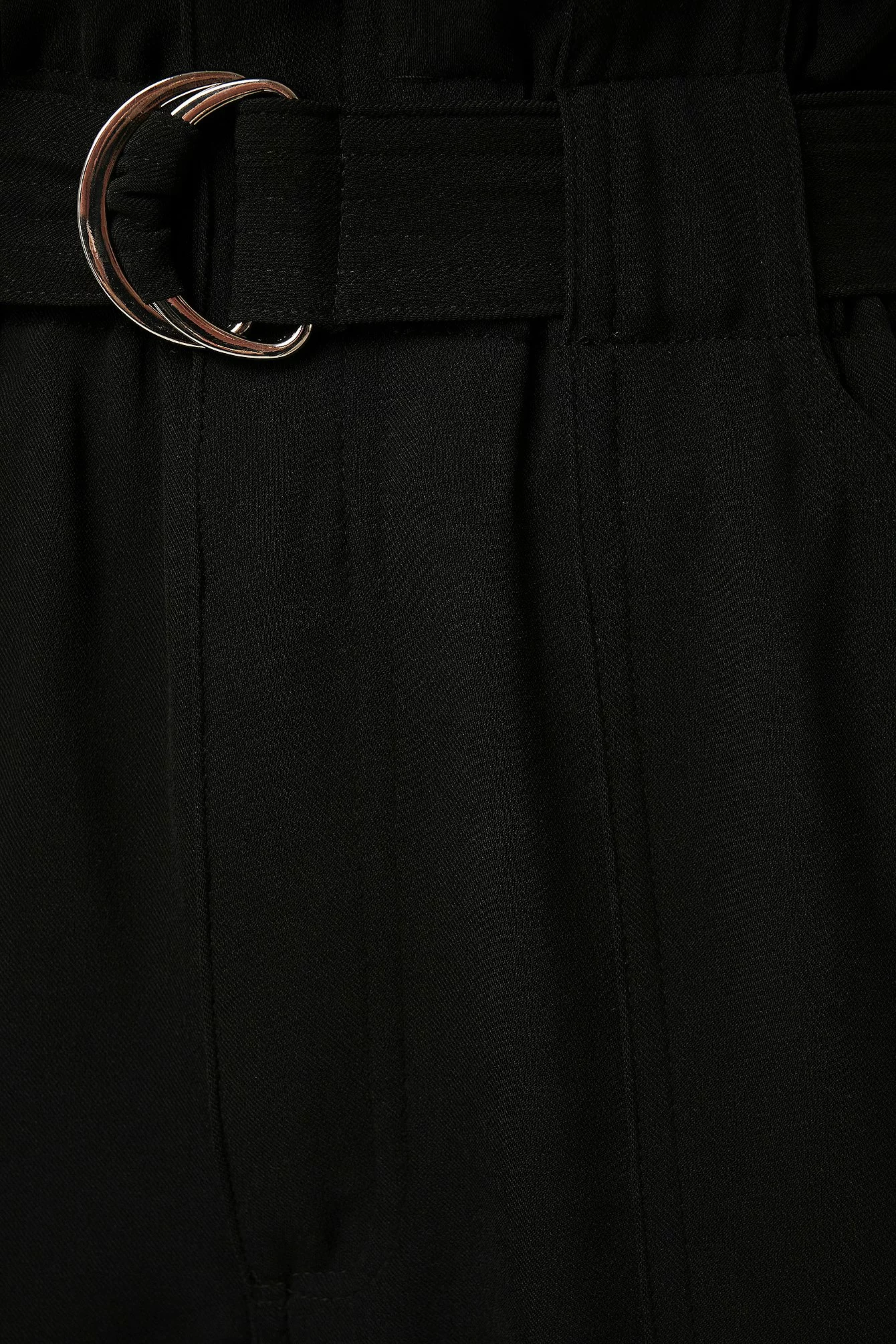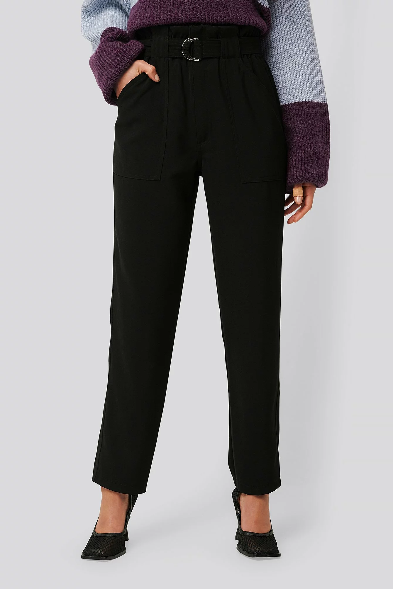 These pants feature a high waist with an elastic waist detail and a removable D-ring belt buckle, a zipper and button closure, two big pockets at the front and a loose fit.