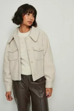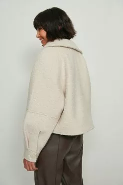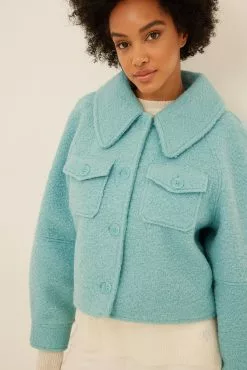 This jacket features an oversized fit, a cropped design, 2 front flap pockets with a button closure, a shirt collar and volume long sleeves with button cuffs.