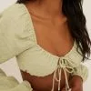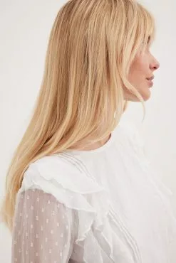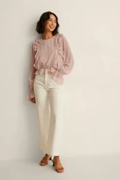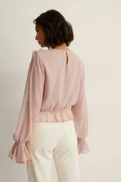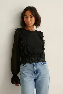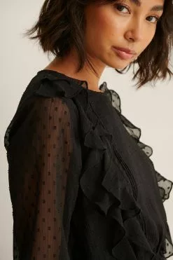 This blouse features a round neckline, long sleeves with an elasticated band at the end, a cut-out with a button closure on the back, frill details along the front, a light material, a slightly transparent look on the sleeves and underlining on the front and on the back.
