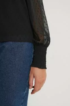 This blouse features a smocked frill neckline with a button closure at the back of the neck, smocked details on the front and on the back, long balloon sleeves, smocked cuffs and an oversized fit.
