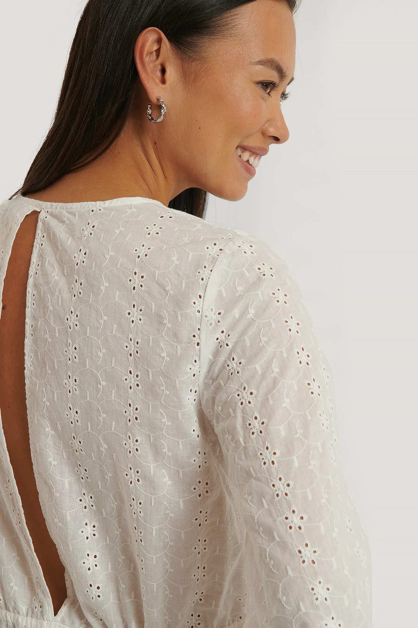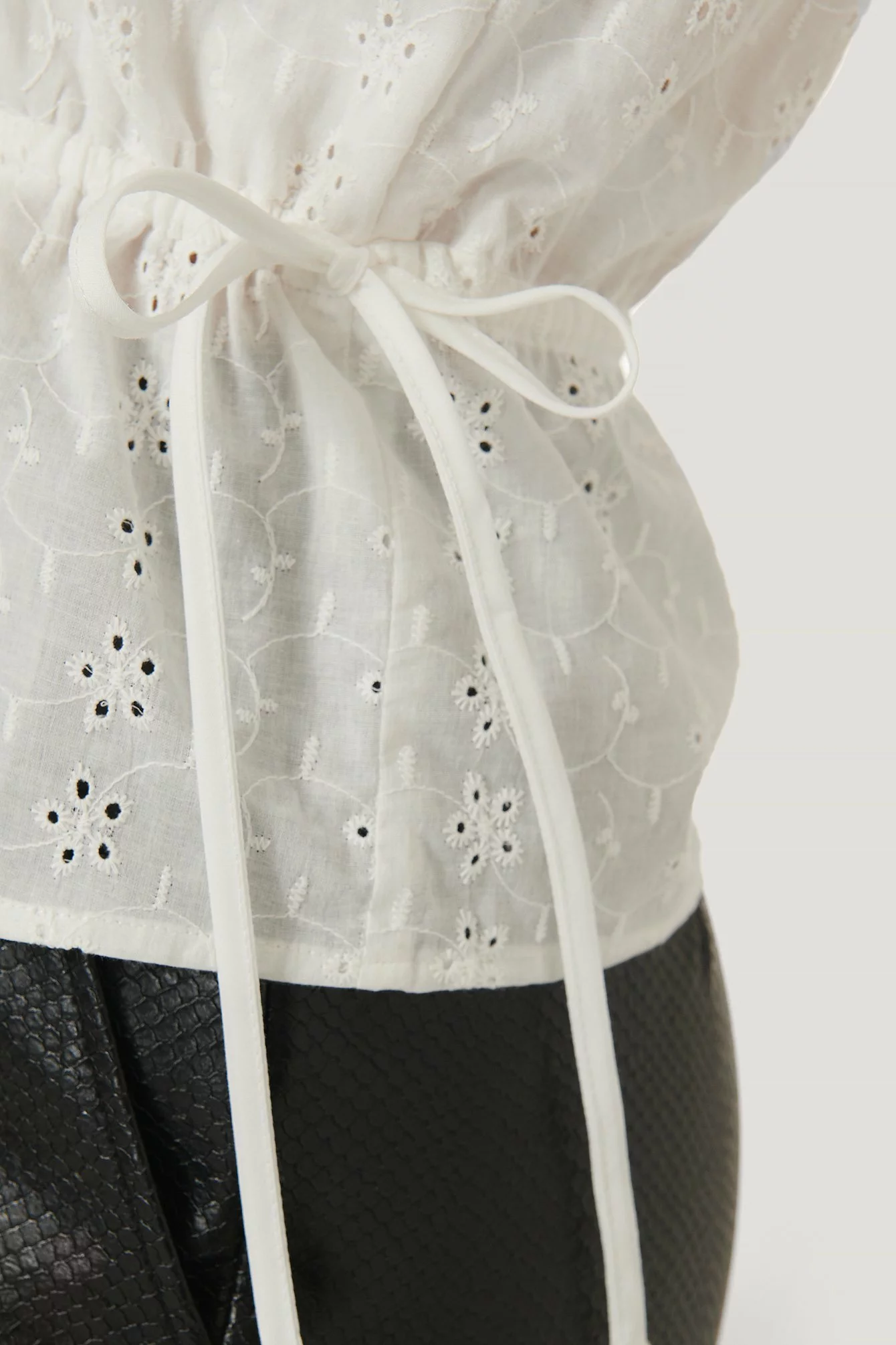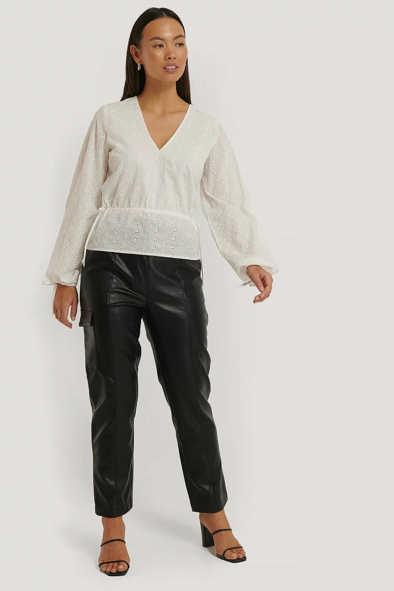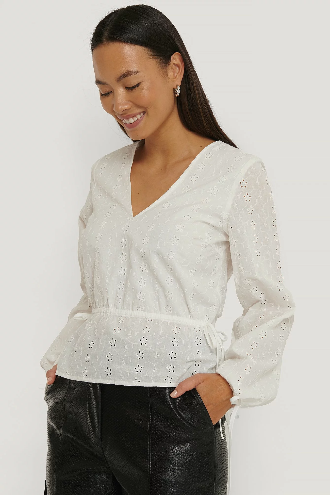 This blouse features a v neckline, flower embroidery, a drawstring at the waist with self-tie bands, long sleeves with drawstrings at the cuffs and a back slit detail.